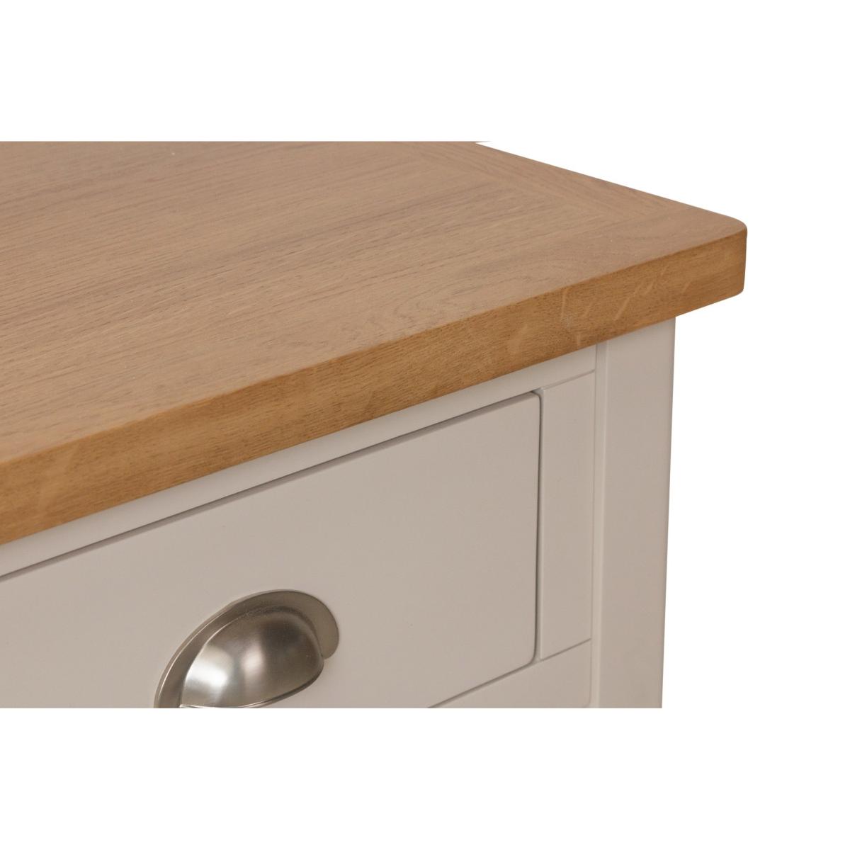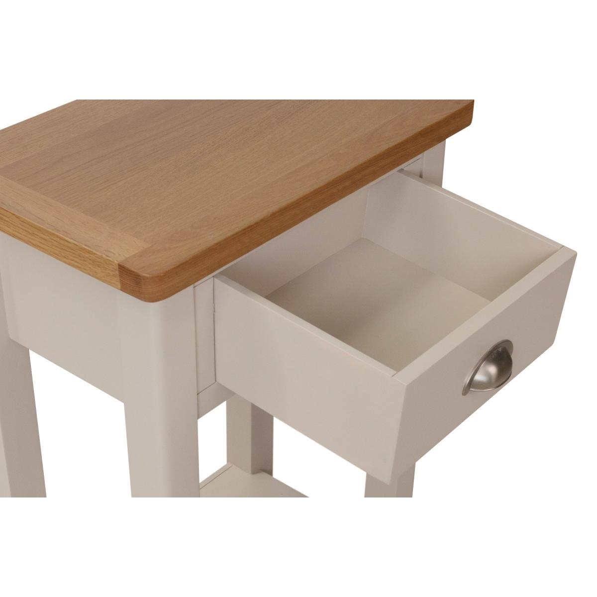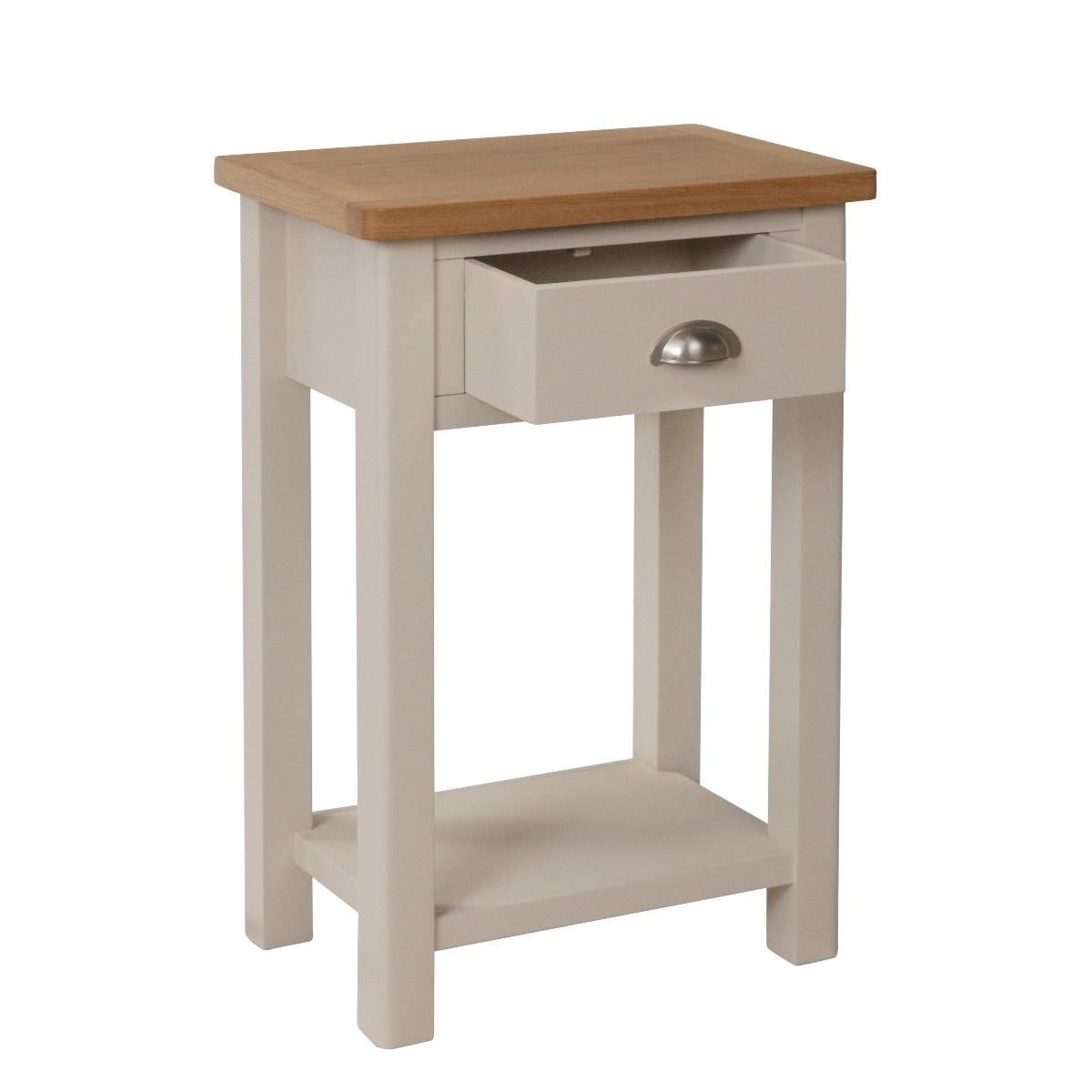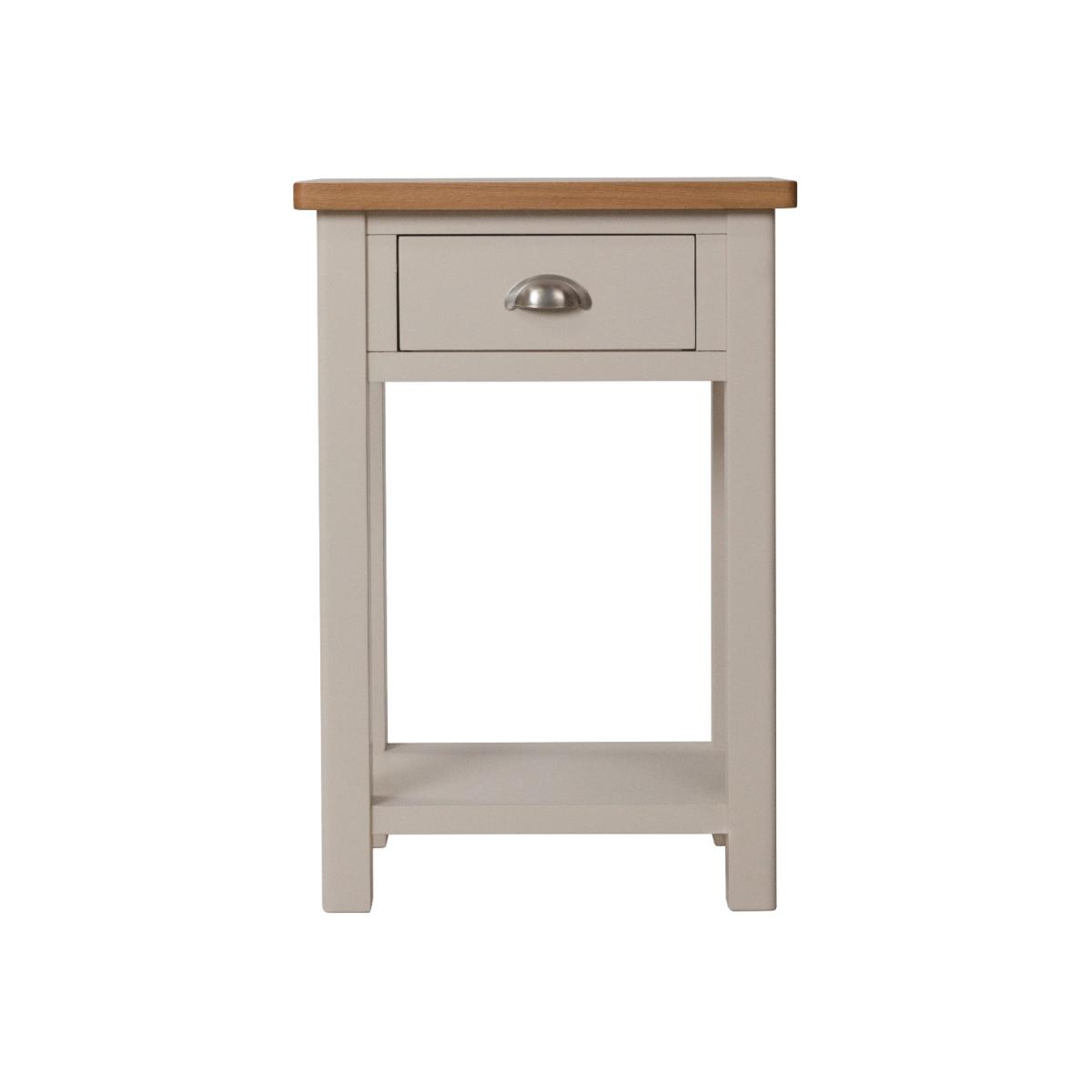 Versatile and stylish, the Cole Oak and Truffle Grey Telephone Table is a stunning addition to any home. Crafted from durable solid wood, the Telephone Table features a grey painted finish contrasting with a natural oak top and is complete with an upper drawer and lower shelf. Chic and sturdy Telephone Table. Durable solid wood frame Truffle grey/greige painted finish contrasting with oak top for a classic look. Handy upper drawer on wooden guides with brushed chrome effect handle. Lower shelf for additional storage. Fully assembled. Complete the look with matching items from the Cole Oak and Truffle Grey Collection
