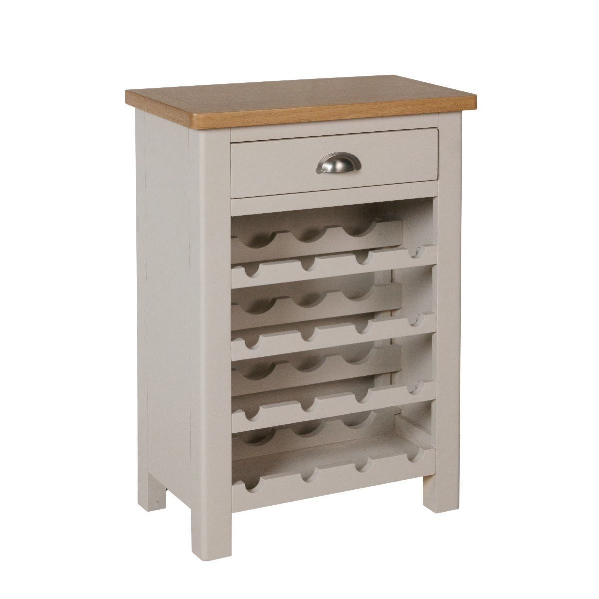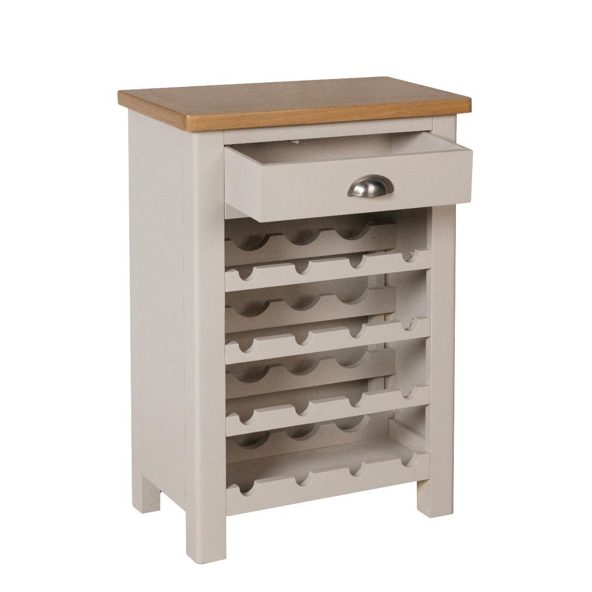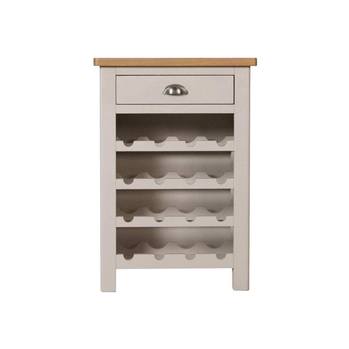 Store and display your wine collection in style with the Cole Oak and Truffle Grey Wine Cabinet. Crafted from sturdy solid wood, the Wine Cabinet features a truffle grey painted frame and a natural oak top and provides storage for 16 bottles of wine. The oak and grey cabinet is complete with a handy upper drawer with a brushed chrome effect handle. Classically stylish oak and grey Wine Cabinet Durable solid wood frame Truffle grey/greige painted finish with oak top for a timeless look. Provides storage for 16 bottles. Handy upper drawer with brushed chrome effect handle. Fully assembled. Matches with other items from the Cole Oak and Grey Collection