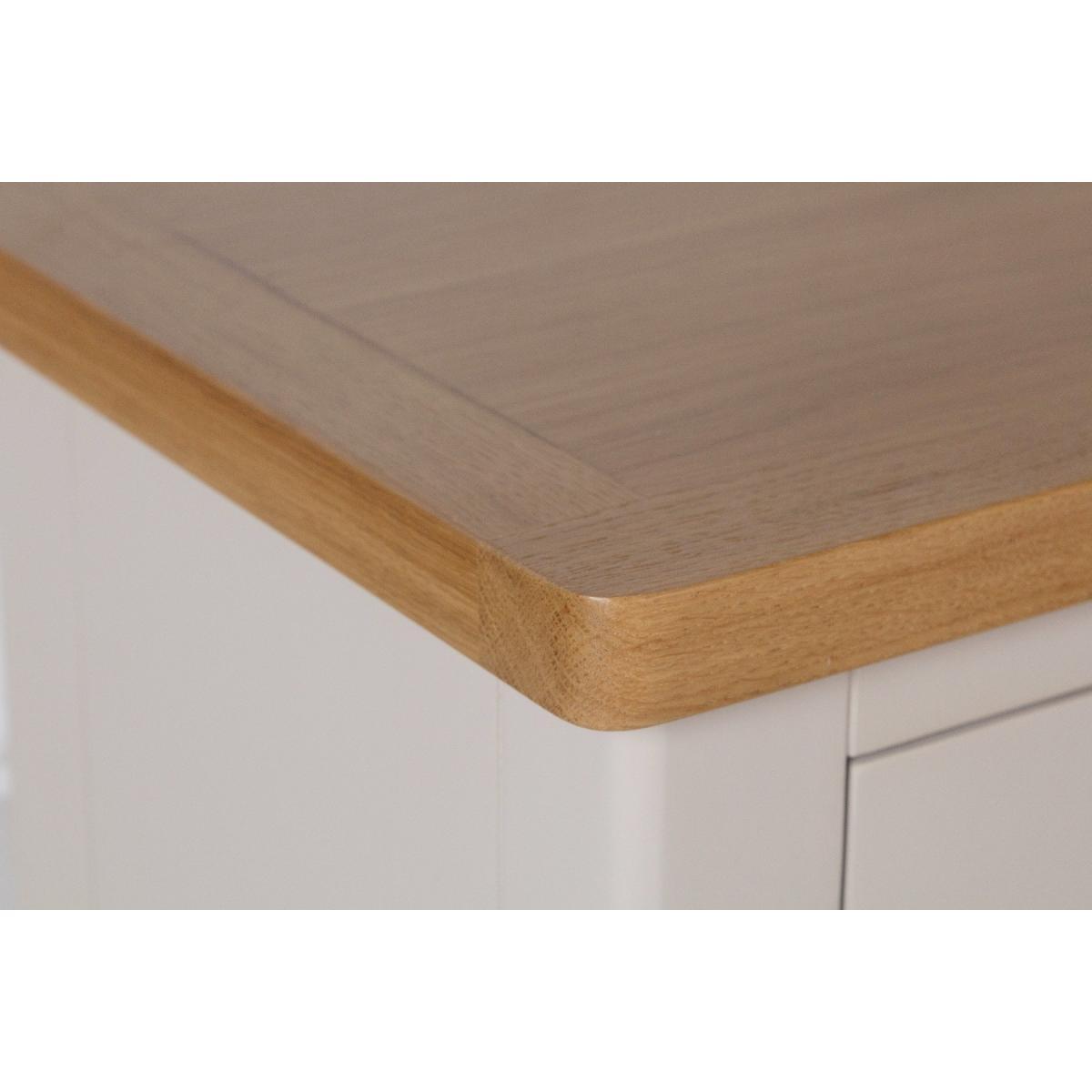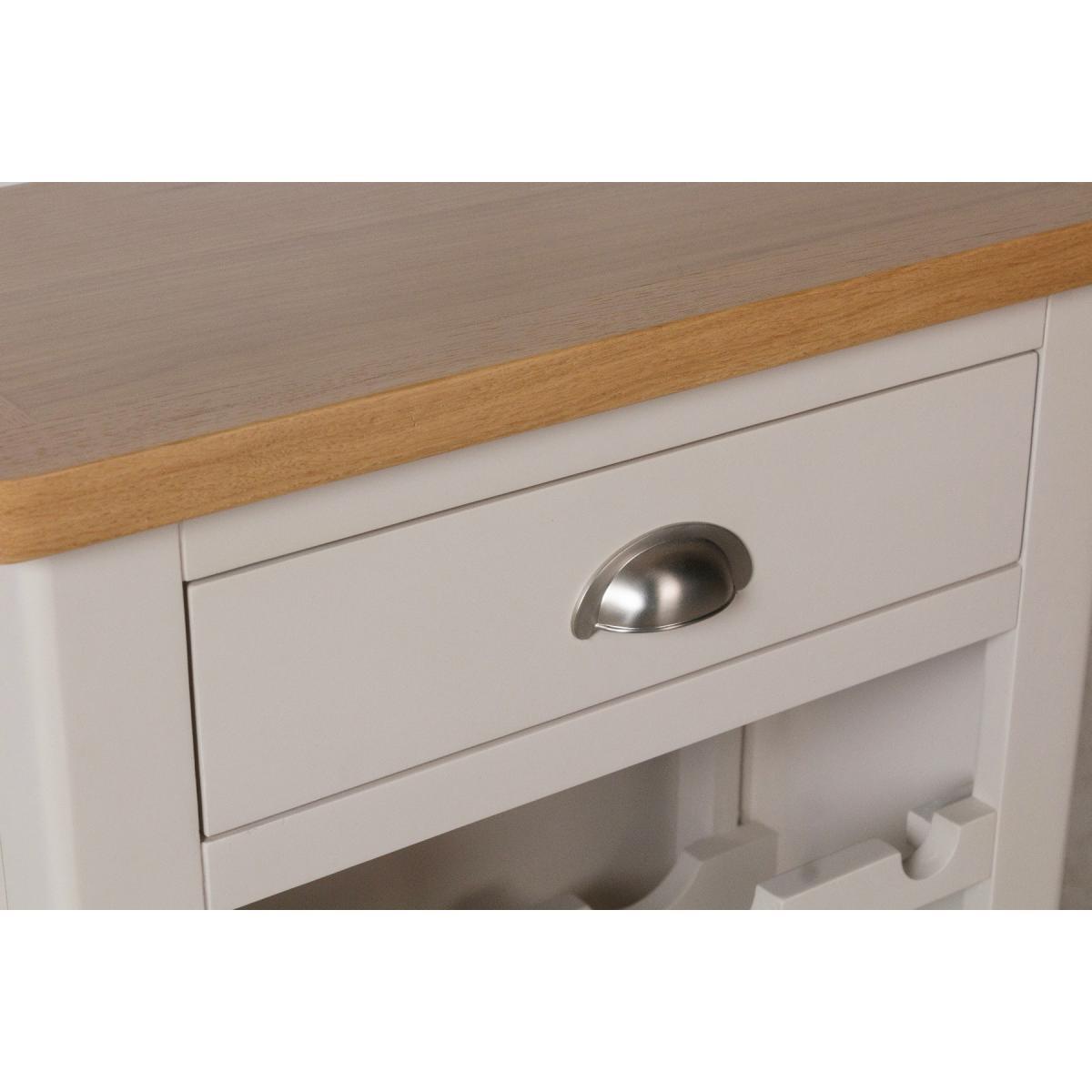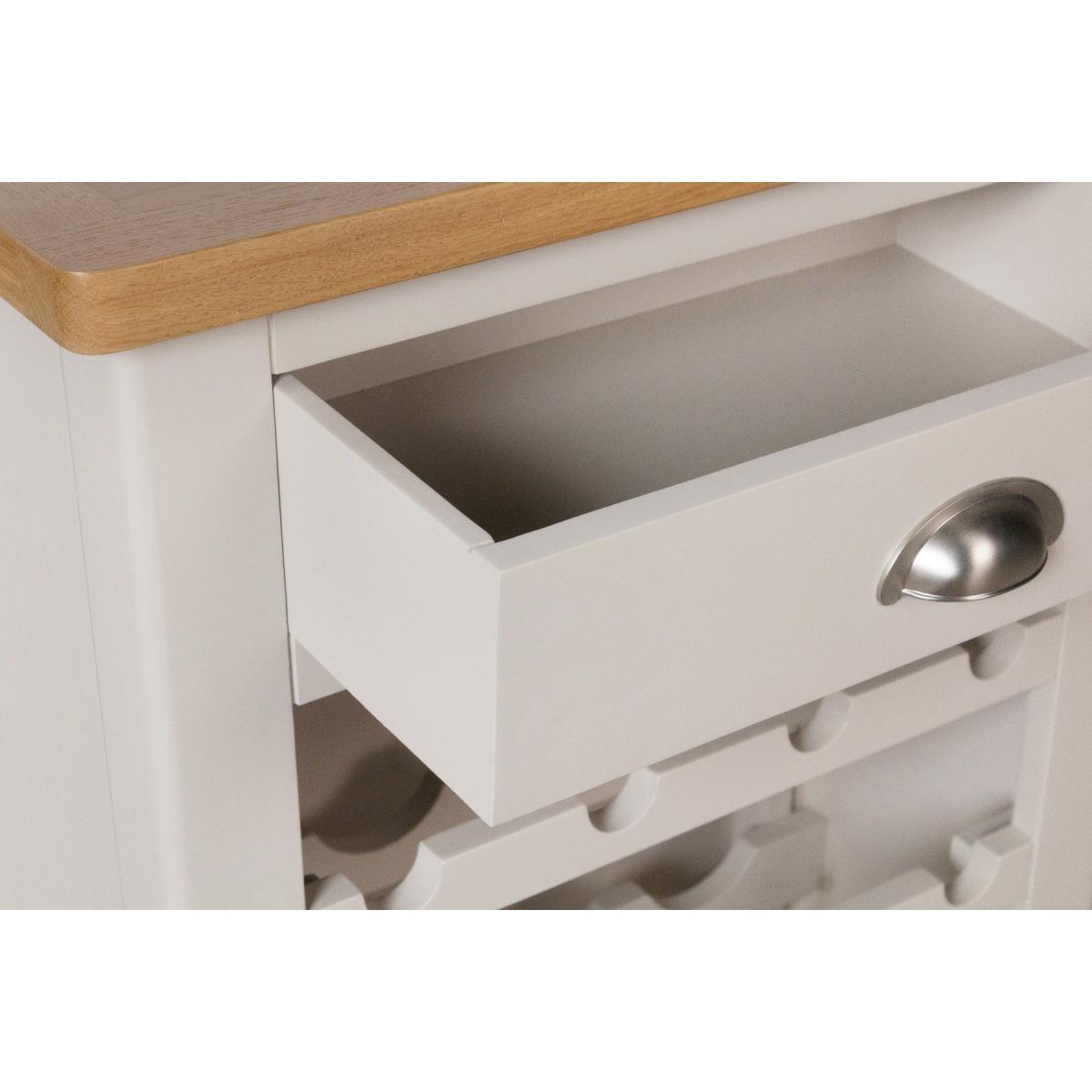 Store and display your wine collection in style with the Cole Oak and Truffle Grey Wine Cabinet. Crafted from sturdy solid wood, the Wine Cabinet features a truffle grey painted frame and a natural oak top and provides storage for 16 bottles of wine. The oak and grey cabinet is complete with a handy upper drawer with a brushed chrome effect handle. Classically stylish oak and grey Wine Cabinet Durable solid wood frame Truffle grey/greige painted finish with oak top for a timeless look. Provides storage for 16 bottles. Handy upper drawer with brushed chrome effect handle. Fully assembled. Matches with other items from the Cole Oak and Grey Collection