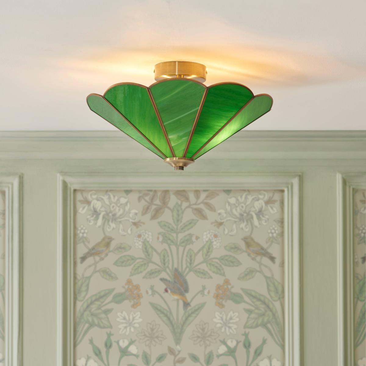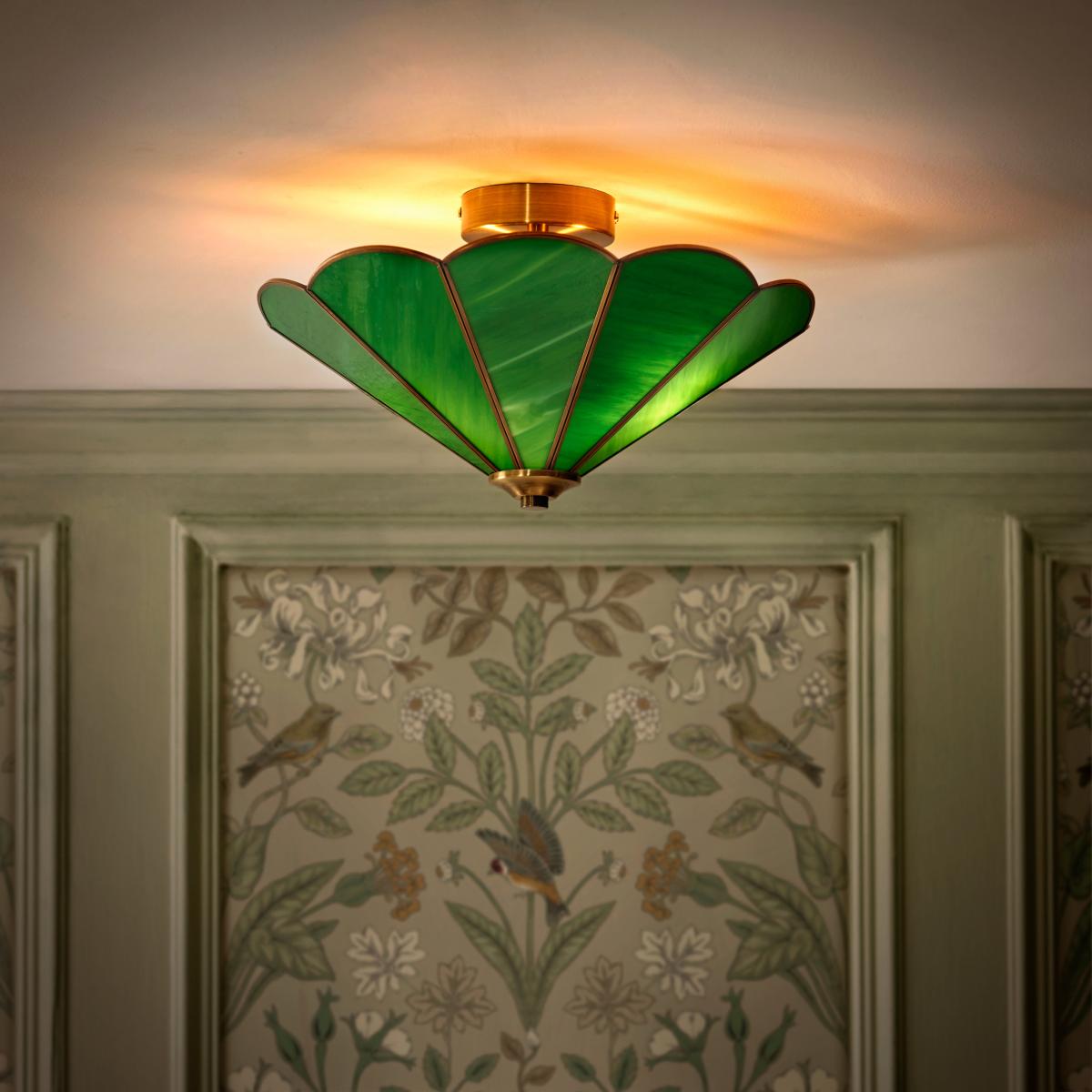 * Stunning Design* Tiffany-Style Scalloped Shade* Made from Steel & Glass* Flush Positioning - Perfect for Low Ceilings* Dimmable Compatible - Needs Dimmable Bulb & Switch* Requires: E14 Cap Type & Golf Bulbs Both elegant and beautiful in design, the Colette Mid Century 2 Light Flush Ceiling Light is guaranteed to make a statement in your living space. It features a tiffany-style scalloped shade, with brass-framed marbled panel glass.