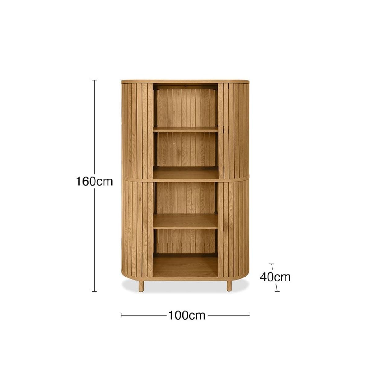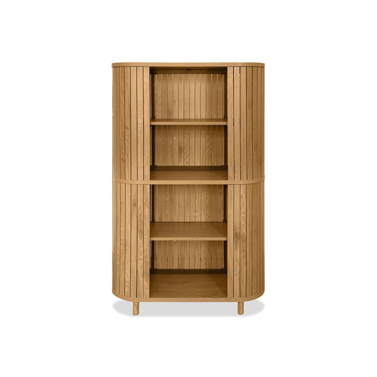 With vertical slat design that curves around the edges, toward the front of the case, you have the luxury to choose what to hide...and what to display with the Collima Bookcase. This partly open bookcase in wild oak wooden finish creates a warm and inviting atmosphere to living spaces with a design that is inspired by Japandi principles. Featuring 2 shelves and round steel legs.