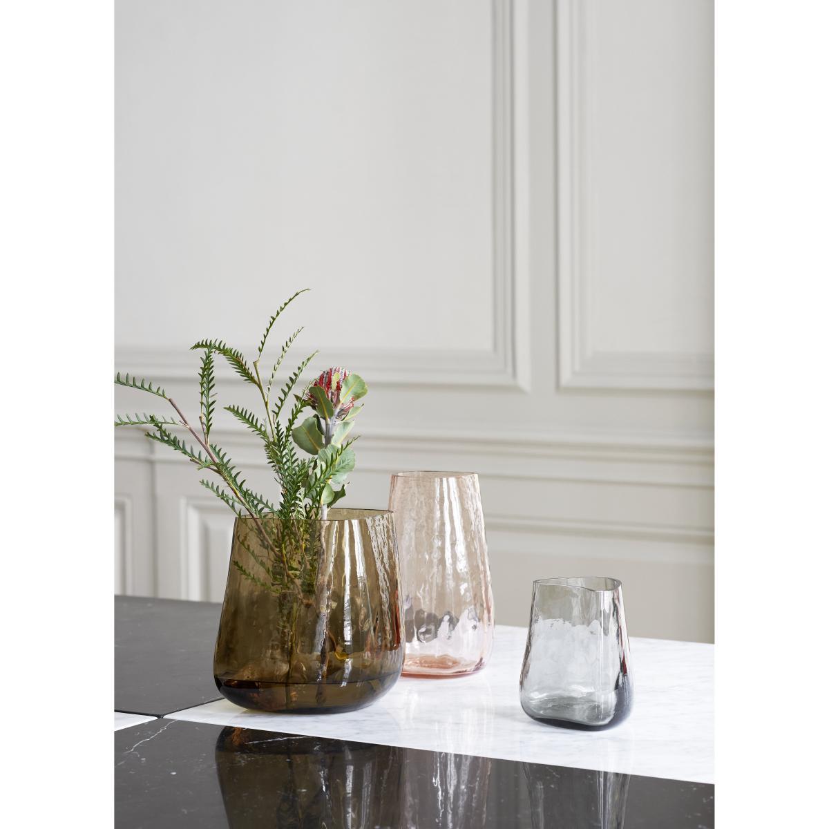 Made from mouth-blown glass, this trio of vases plays with the transparency of the material to create a wavy and liquid effect. The organic lines, intentionally irregular, communicate a craft feel. These vases are available in three sizes, each with its own hue.