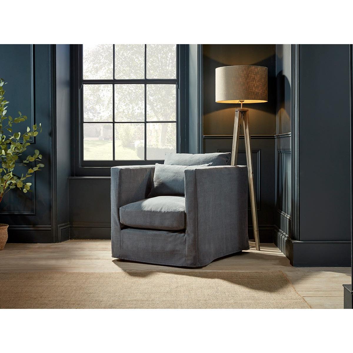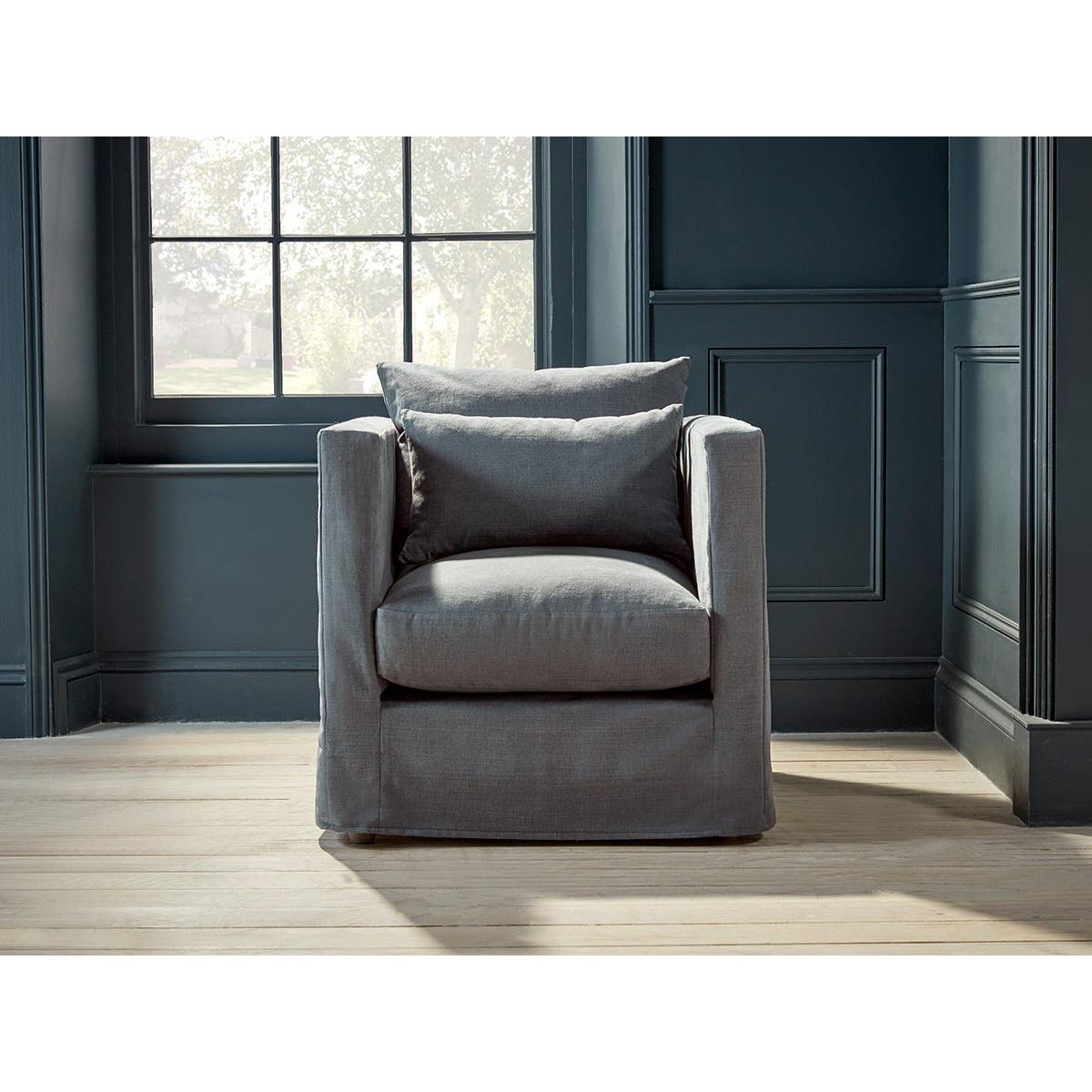 Our relaxed Colmar made to order range includes this laid back armchair. Marrying the versatility of loose covers with welcoming boxy lines and slender arms the seat is further enhanced by a feather filled bolster cushion. Handcrafted in the UK using traditional methods, our Colmar range makes a desirable addition to any living room. The Colmar range also includes a two seater sofa. Pictured here in our French Blue cotton linen, our Colmar collection can be upholstered in a choice of 30 distinctive shades and five fabrics to suit your style. Read our Upholstery FAQs View our full Upholstery Terms and Conditions