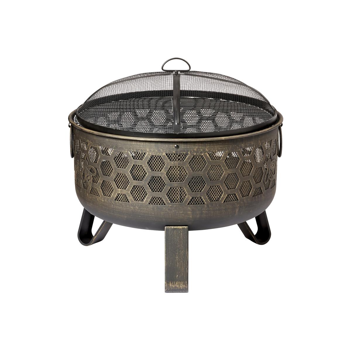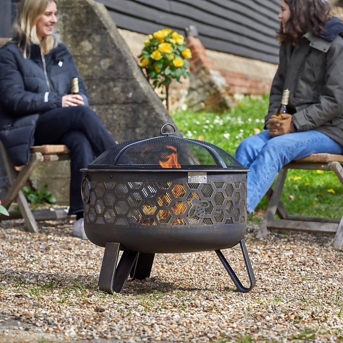 The Colmena Firepit is a hard wearing powder coated steel (temperature resistant to 600°C) with a hand painted gold brush effect finish. The three leg design provides stability and increases air flow for heat dissipation. The product also has easy-lift handles and a safety tool included.