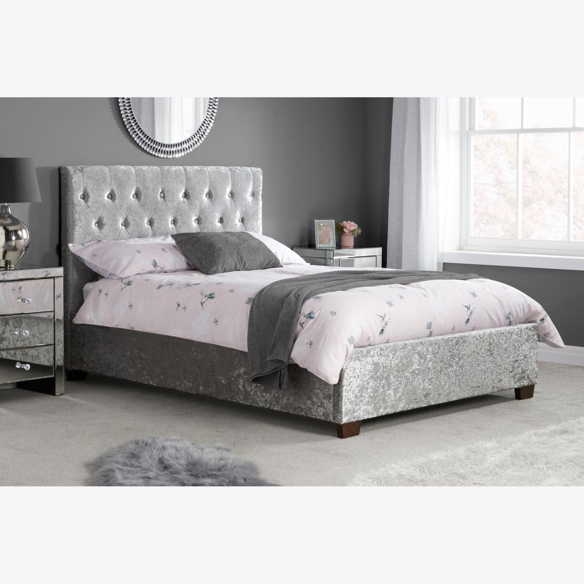 This fabulous contemporary bed frame will be focal point in any bedroom. The Cologne bedstead is upholstered in either a steel crushed velvet or a grey fabric and features a striking buttoned headboard. This frame has a sprung slatted base to give natural bounce, adjusting to where pressure is most exerted for greater comfort. Also available in an ottoman bed frame. The maximum weight load for the 4"6 frame is 300 kg, and the 5" frame is 400 kg. Please note Birlea beds are only suitable for a UK standard size mattress and the recommended maximum mattress height is 305 mm.