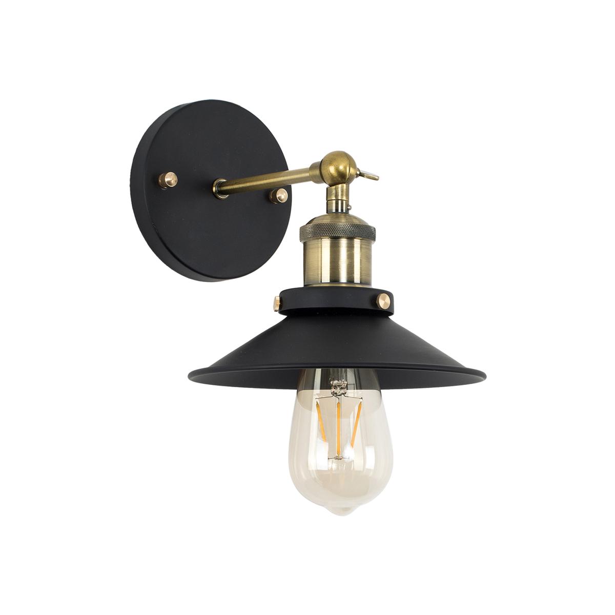 Vintage and industrial style wall light fitting in a contrasting black and antique brass effect metal finish with a tapered shaped light shade. This unique light will make a real style statement and complete your living space look. Ideal for dining rooms, kitchens and other living areas.
