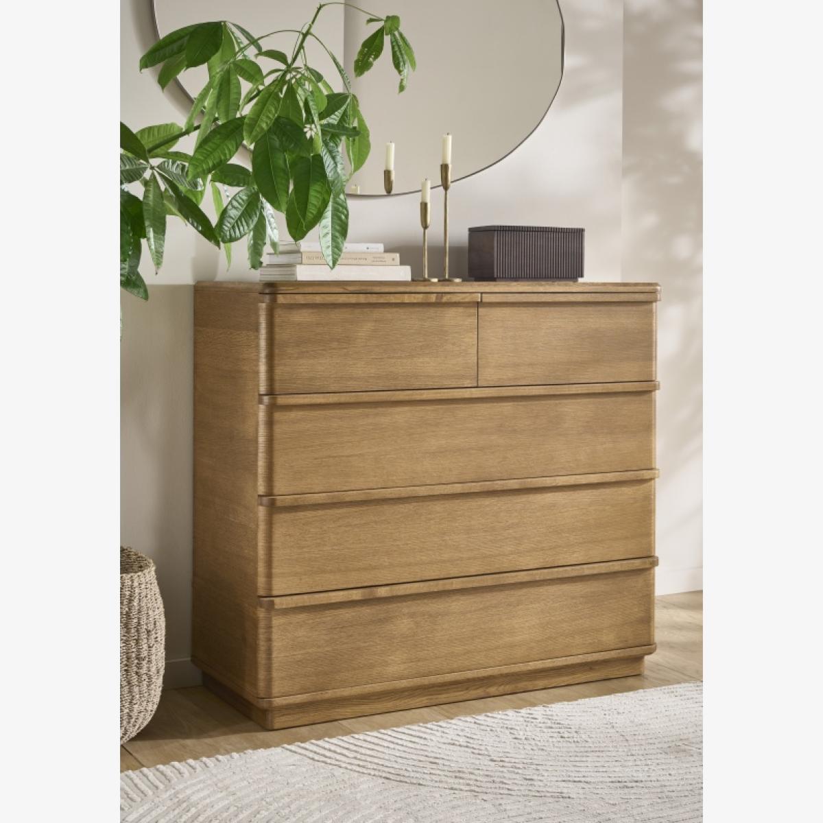 Bring a touch of refined elegance to your home with the Colorado 2+3 Chest of Drawers. Designed to seamlessly blend functionality with style, this chest features a minimalist aesthetic that complements a variety of interiors, from contemporary to classic. The thoughtfully crafted 2+3 configuration offers two compact top drawers, perfect for organizing smaller items such as jewelry, accessories, or everyday essentials. Beneath, three larger drawers provide generous space for clothing, linens, or bulkier items, ensuring your space stays tidy and clutter-free. Built with high-quality materials, the Placid chest boasts smooth-gliding drawer mechanisms and a durable finish that’s both stylish and easy to maintain. Its clean lines and subtle detailing add a modern charm, making it a versatile addition to any bedroom, living area, or hallway. For those seeking a balance of practicality and aesthetic appeal, the Colorado 2+3 Chest of Drawers is the ideal choice—a timeless piece that enhances both storage and style in your home. Features: Ideal for storing clothes 2 smaller top drawers 3 wider, lower drawers. Curved Edge Design Material - Oak Self Assembly Required Specifications: Width 110cm Height 100cm Depth 47cm All screens vary in colour reproduction and whilst every effort has been made to display the colour as accurately as possible it is for guidance only.