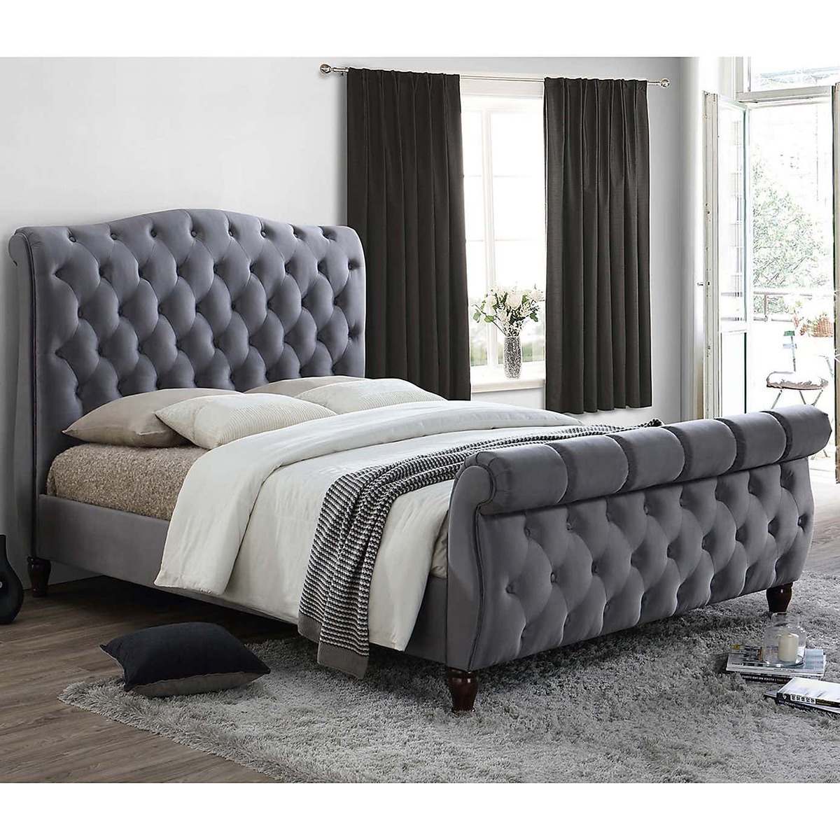 With an attractive rolled and buttoned headboard and foot end, the sophisticated Colorado Fabric Bed Frame is a timeless classic. This sleigh bed is upholstered in grey polyester with complementary dark rubberwood feet. Please note, unfortunately we cannot deliver this item to the Channel Islands.