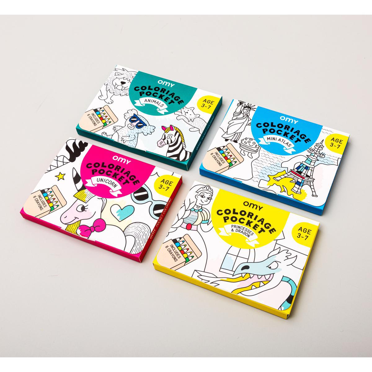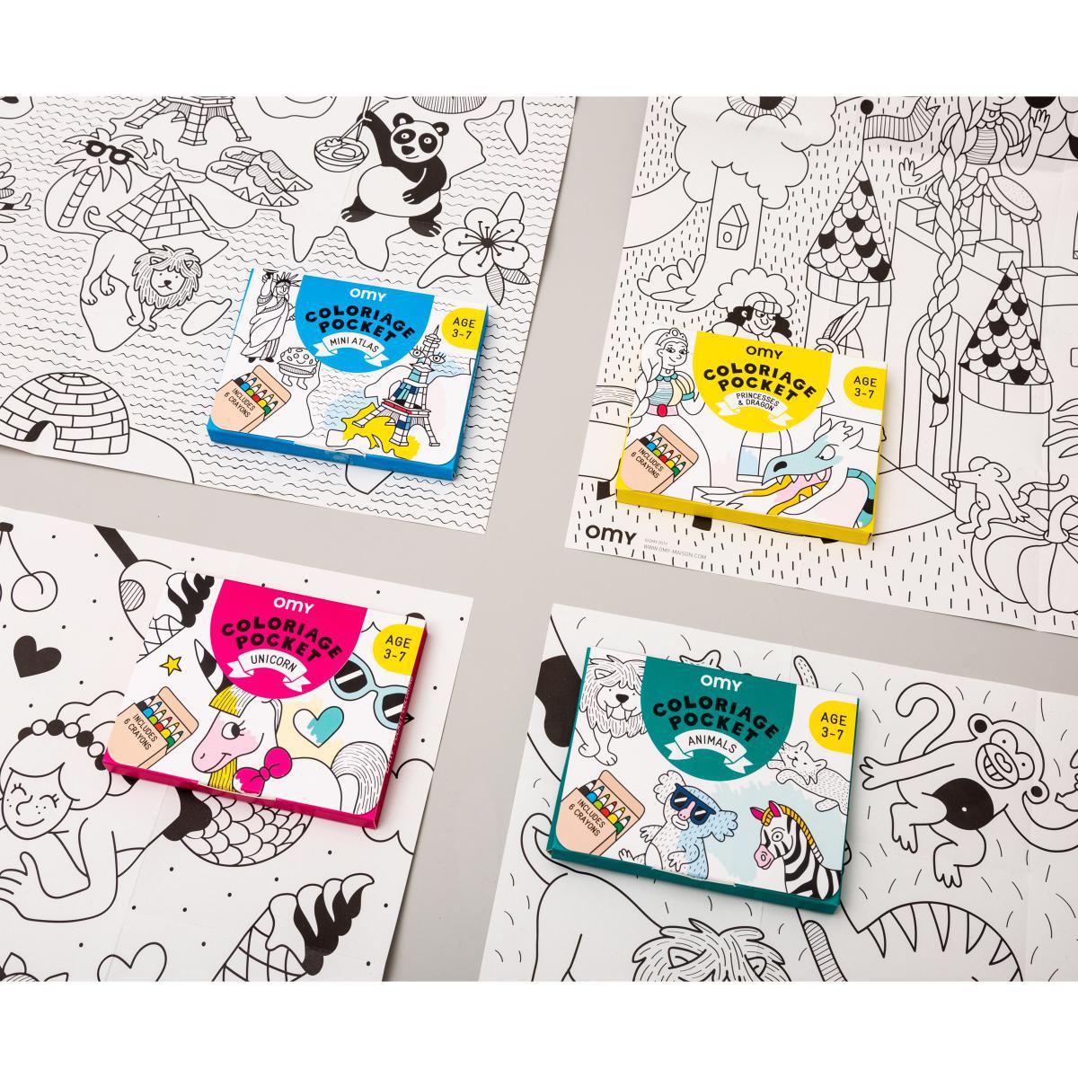 A mini colouring set for the little ones (3-7 year olds)! Ideal for travelling with its 6 mini coloured pencils inside. You can take it everywhere: on public transport, in restaurants, in your suitcase, etc. A graphic design and large motifs suited to 3-7 year olds: children can colour it and fill it on their own in a few hours. Available in four essential themes: Unicorn, Mini Atlas, Princesses & Dragons and Animals. Joyful and full of humour, the drawings area teaming with amusing details to discover! The images are signed Elvire Laurent and Marie-Cerise Lichtlé, two graphic designers and illustrators trained at the Paris Art-Déco institute. Far from simply being used in a child’s bedroom, this quirky poster will be a hit anywhere in the house!.