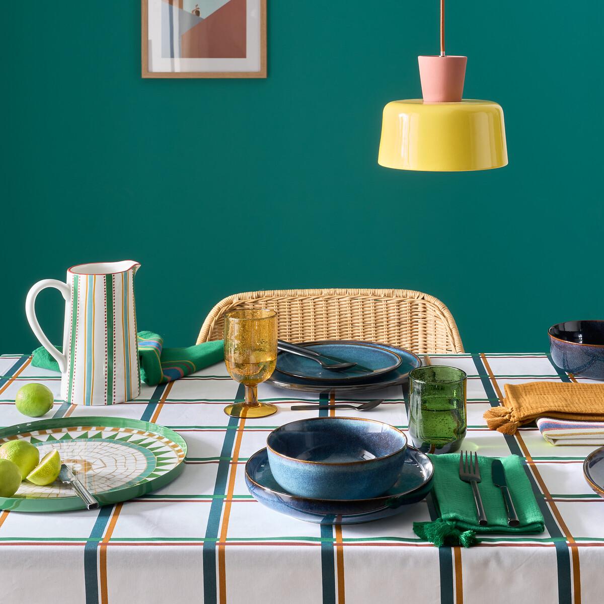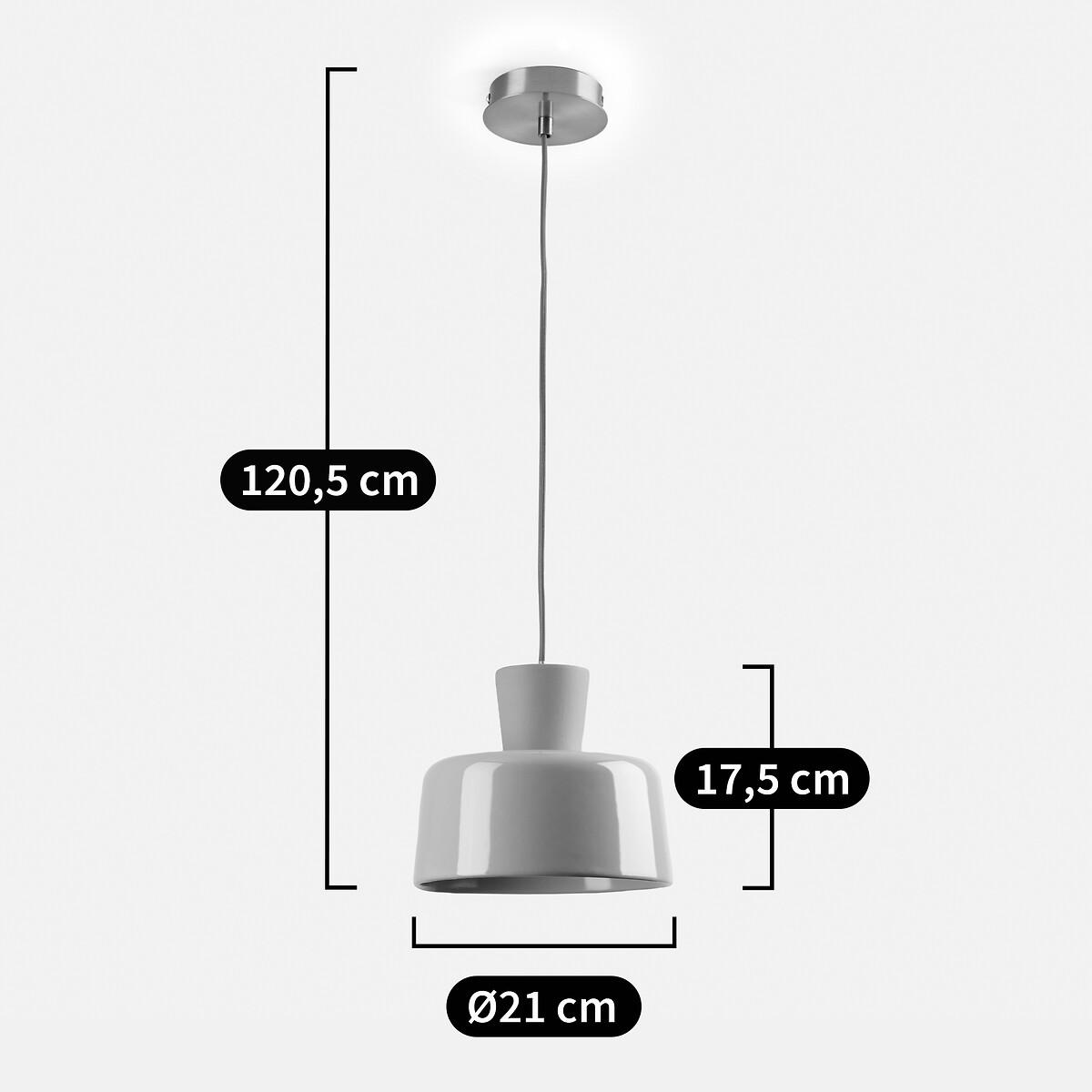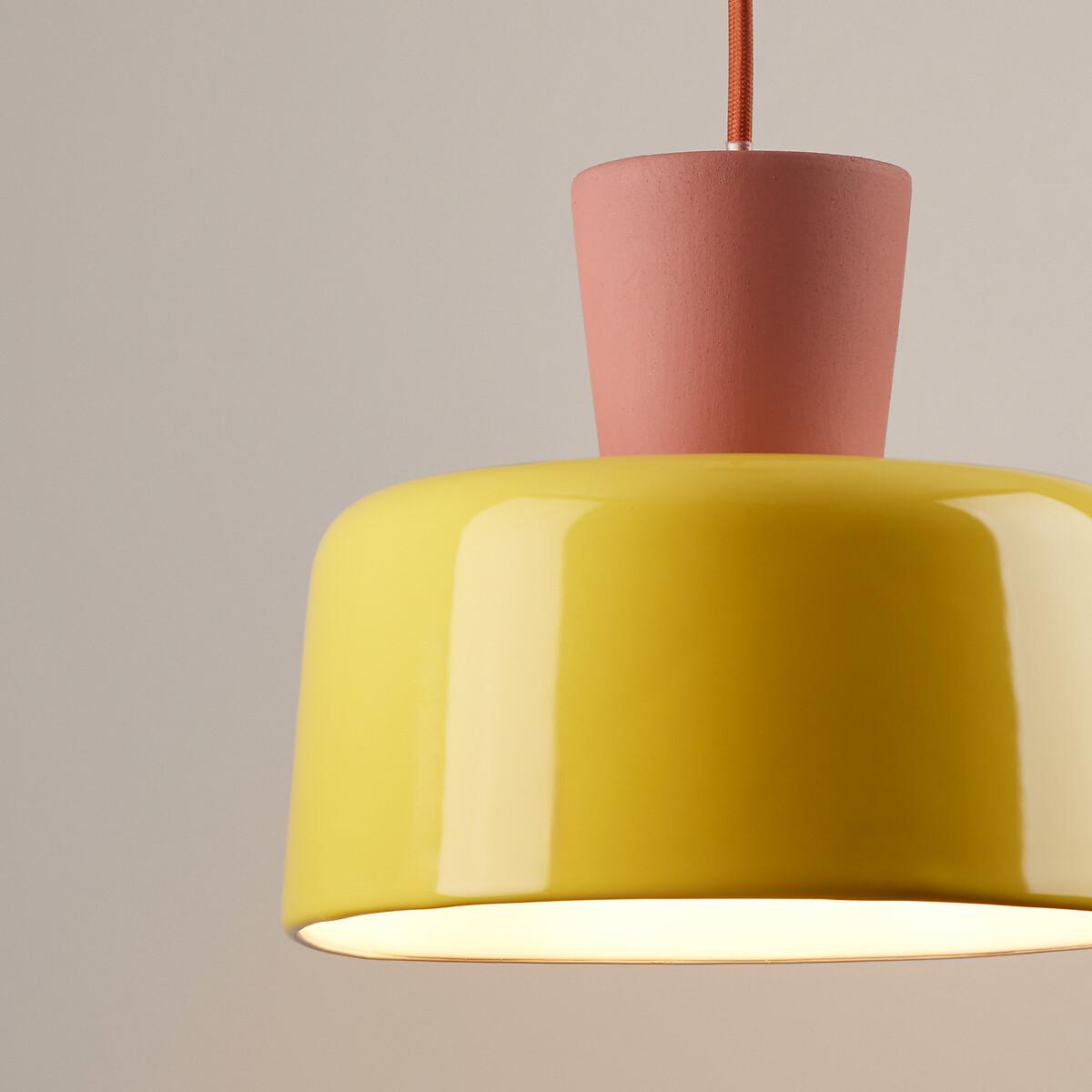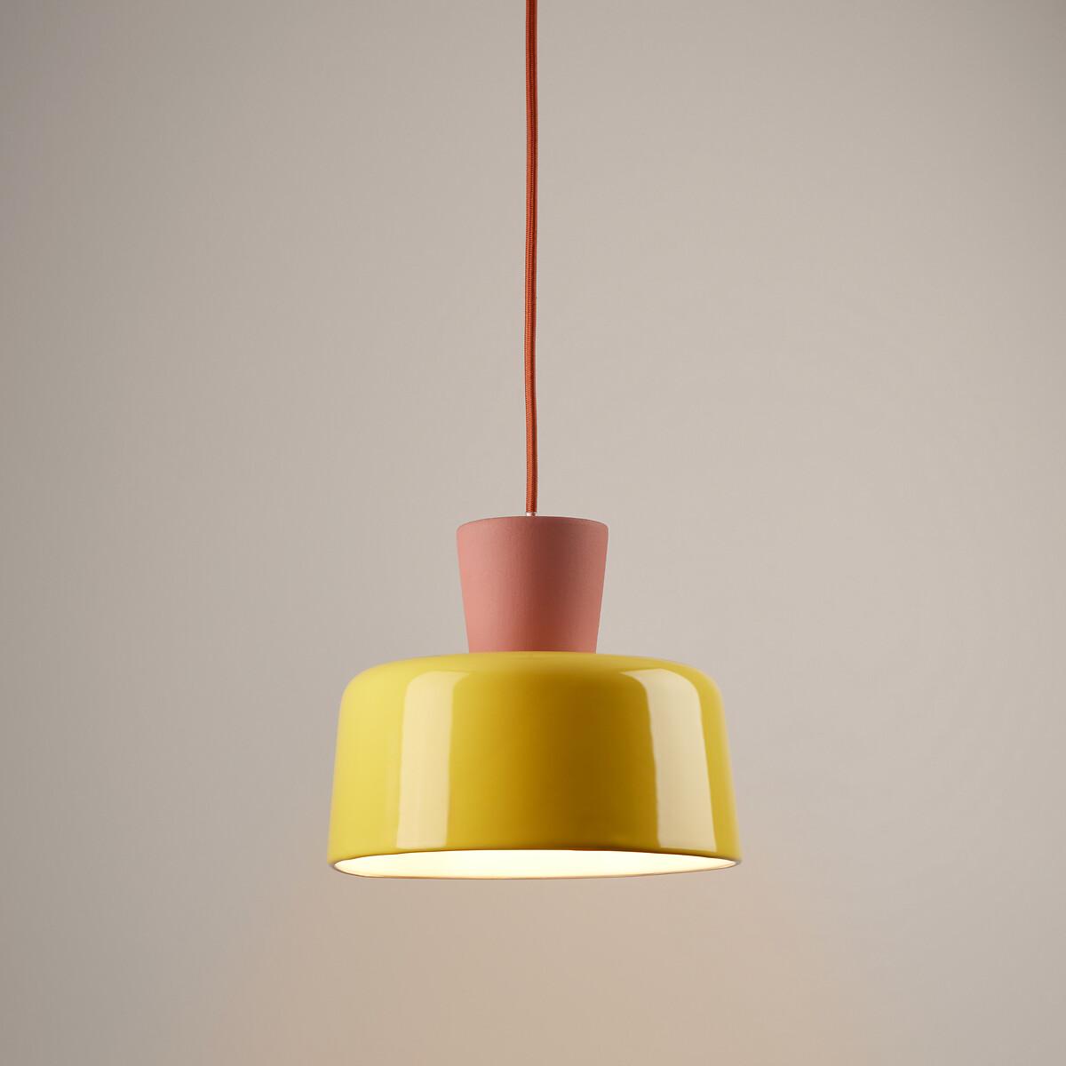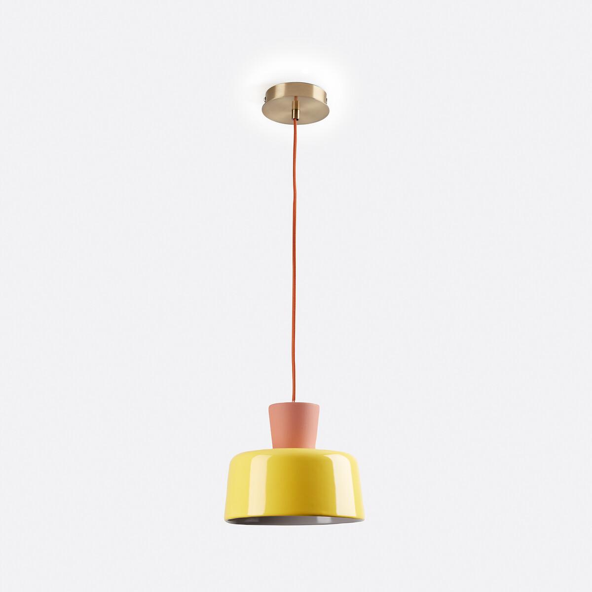 Our designers were inspired by the pop spirit of the 70's for this exclusive creation, signed La Redoute Intérieurs. Jimna suspension system : the perfect blend of ceramics and vintage design. Just the thing to brighten up your home with a splash of colour. Product Details • Hanging lamp in ceramic • Ceiling dish and socket support in brass-plated iron • Fitted cable in fabric • E27 socket for 8W max bulb (not supplied)Dimensions • Diameter: 21cm • Total Height: 120.5cm • Lampshade: Ø21 x H17.5cm Dimensions and weight of parcel • 1 parcel • W27 x H21 x D27cm. 2.15kg.