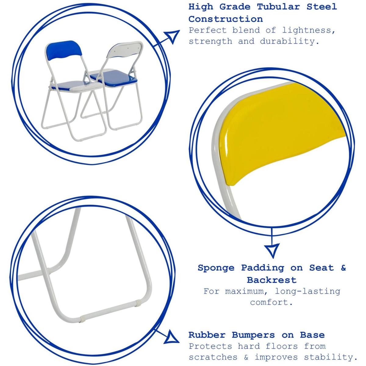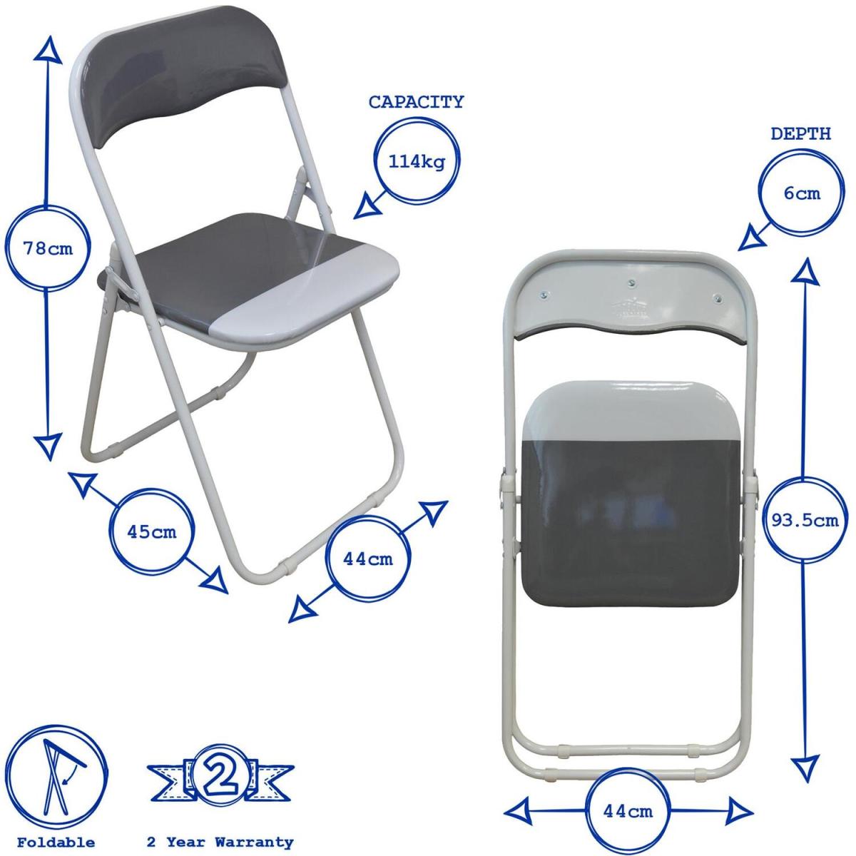Who says that spare seating can't be stylish This desk chair lets you unfold a sturdy, fashionable place to sit in a pinch to expand the seating possibilities in a home, school, meeting, wedding, community event or anywhere else.br br Due to its sturdiness and comfortable design, this desk chair can easily be used as everyday seating at a desk or in front of a computer in a home, dorm or place of business.br br Vibrant two-color design with glossy PVC coverbr br Available in Blue, Green, Pink, Purple, Red, Baby Blue and Greybr br Easy-to-operate folding mechanismbr br Heavy-duty tubular steel frame has been strength testedbr br Sponge padded seat and back rest for added comfortbr br Easy to clean with a damp clothbr br Strong enough to hold 18 stone (114kg)br br Chair measures 78cm by 45cm by 42cm when openbr br Seat height is 45cmbr br Folded dimensions are ultra compact at 92cm by 45cm by 45cmbr br Spruce up any space or make any event an extra stylish one with the handy, comfortable seating provided by this folding desk chair.