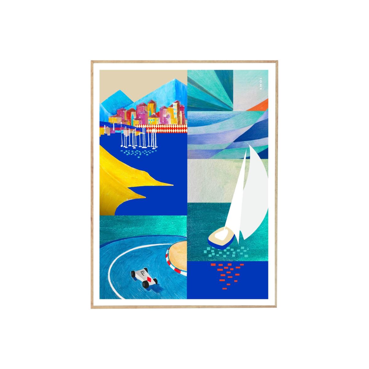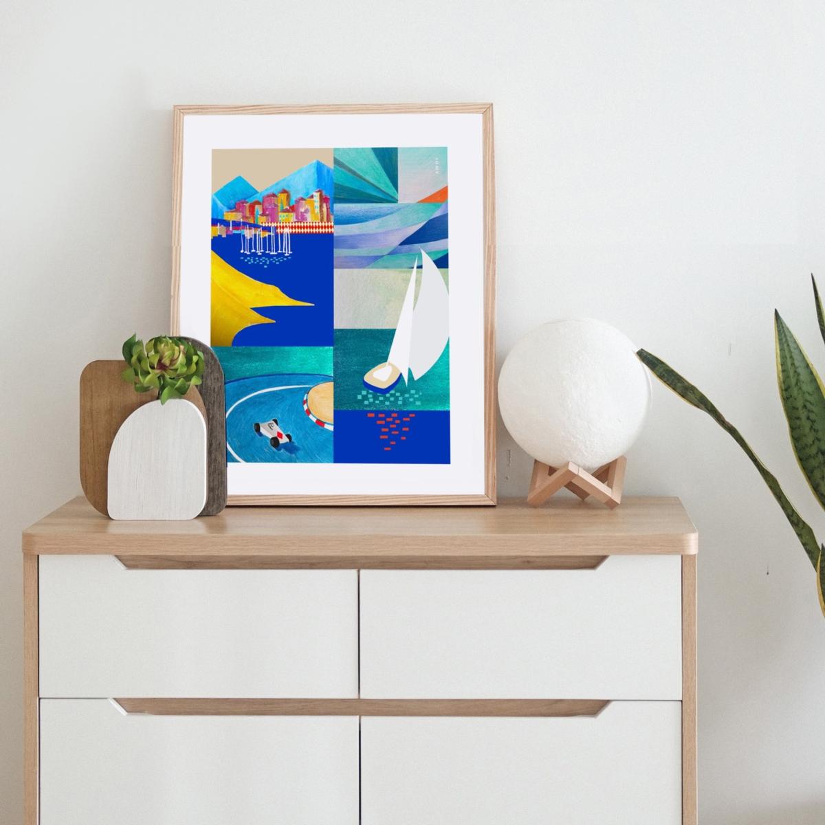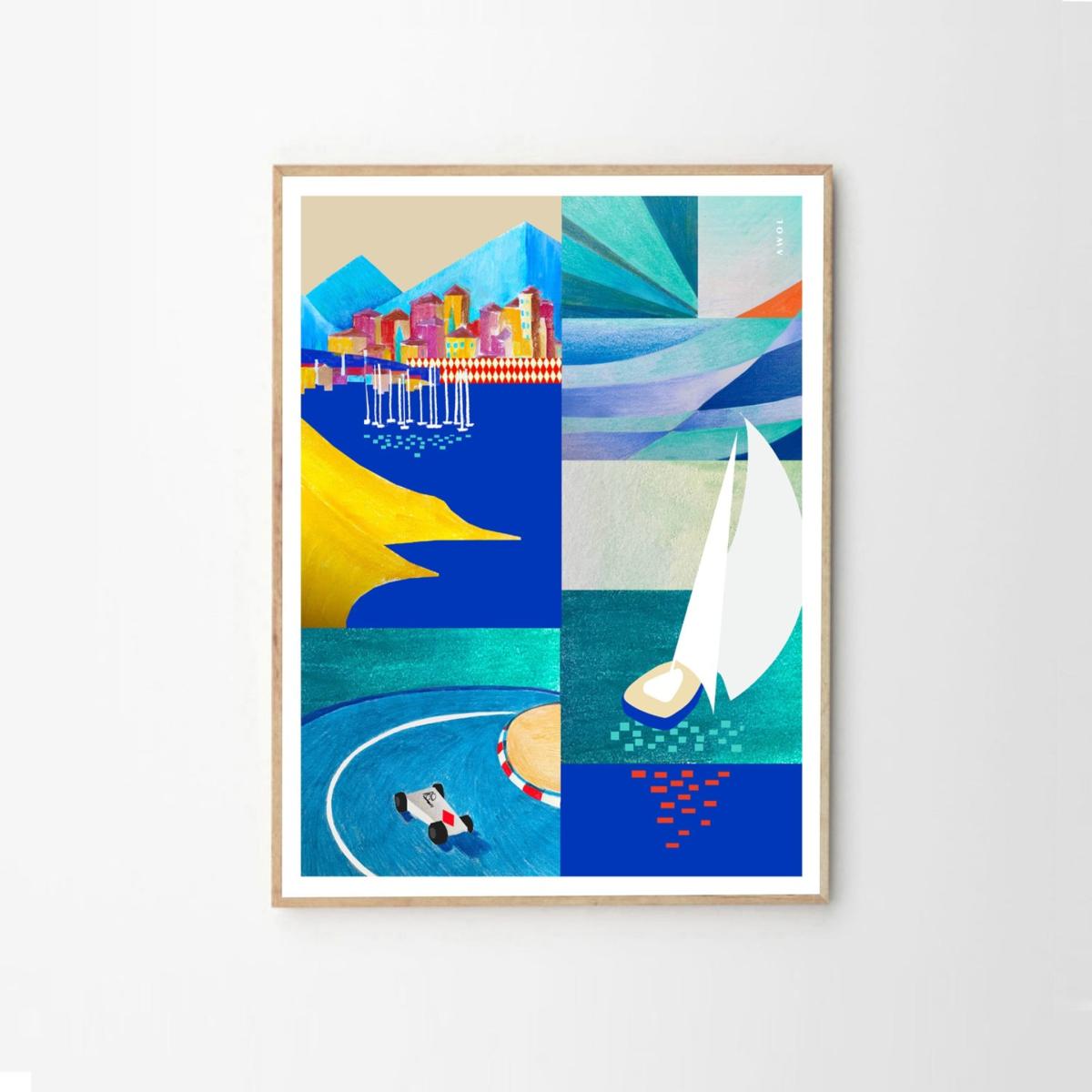 This colourful travel art print is inspired by the bright landscapes, blue sea, coastal port towns, sailboats bobbing in the wind and happy vacation vibes year-round on the Côte d'Azur. The drive along the Mediterranean coastline in the South of France is one of the most beautiful places in the world. Inspired by the postcard perfect beauty of the French Riviera – and the fast cars driving along this coastal destination famous for slow-living, beauty and pleasure, this South of France travel illustration will add a bold, modern and happy touch to your home décor. Mix and match multiple art prints from the French Riviera Collection to create an eclectic travel gallery in your favourite room. Hand painted and printed on premium Canadian paper.