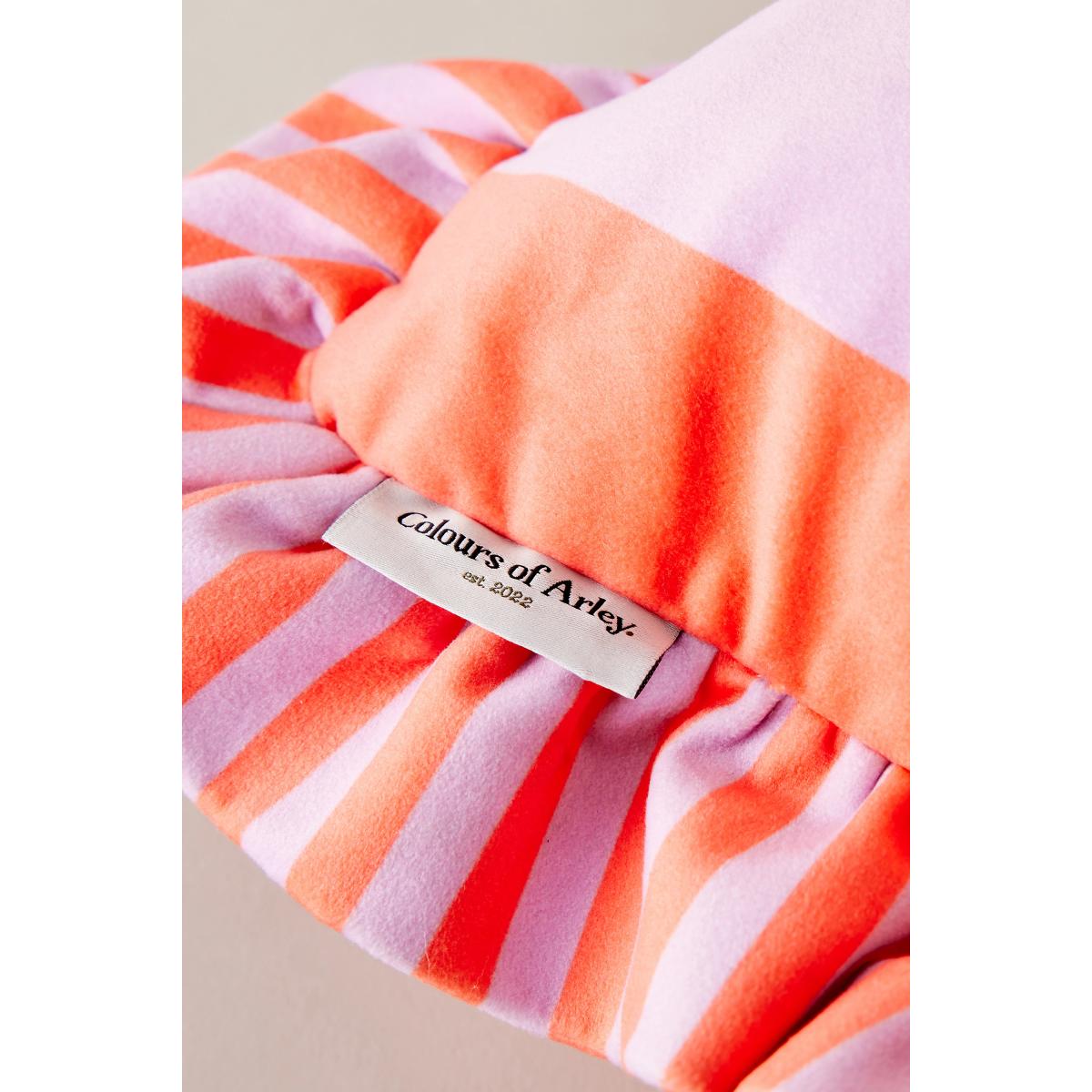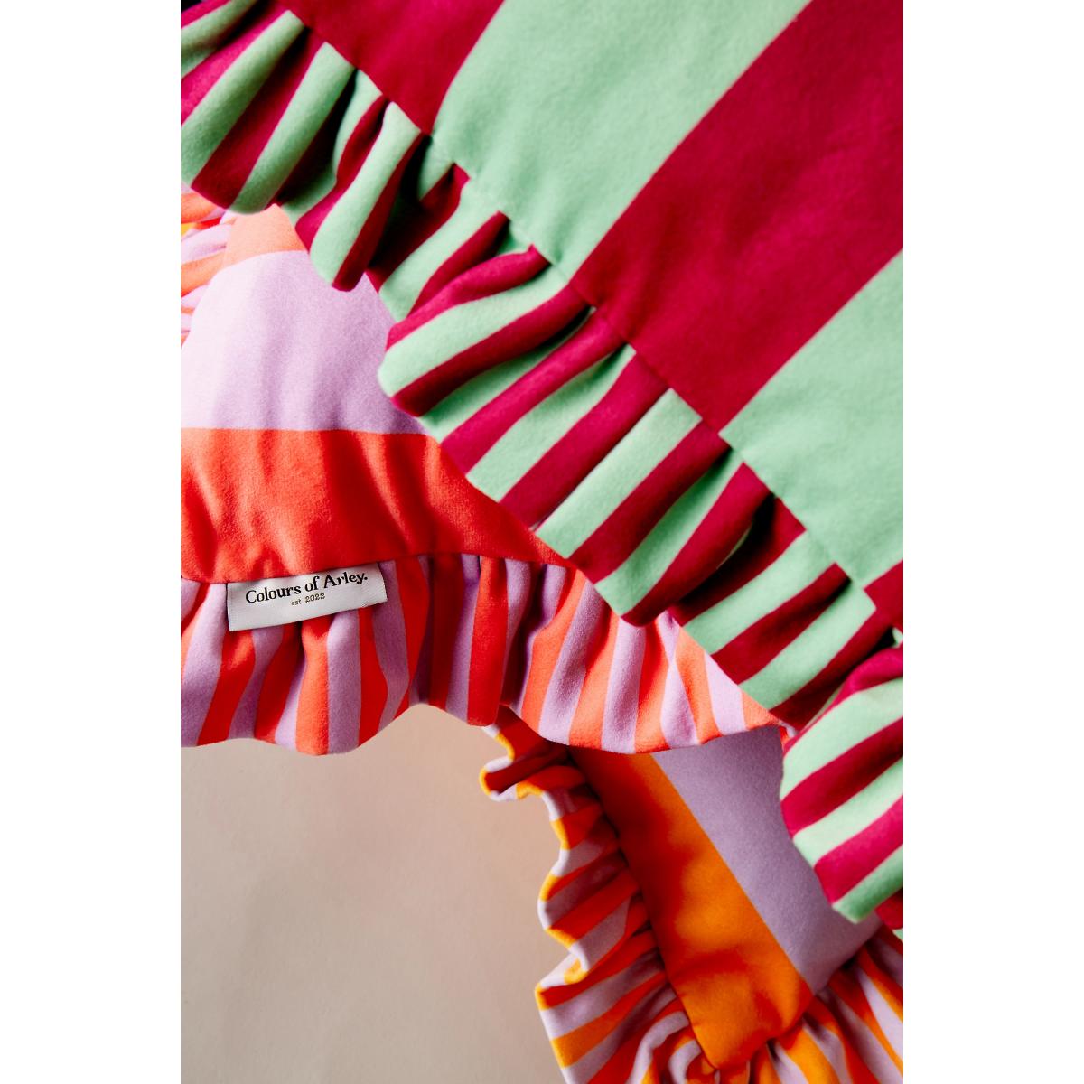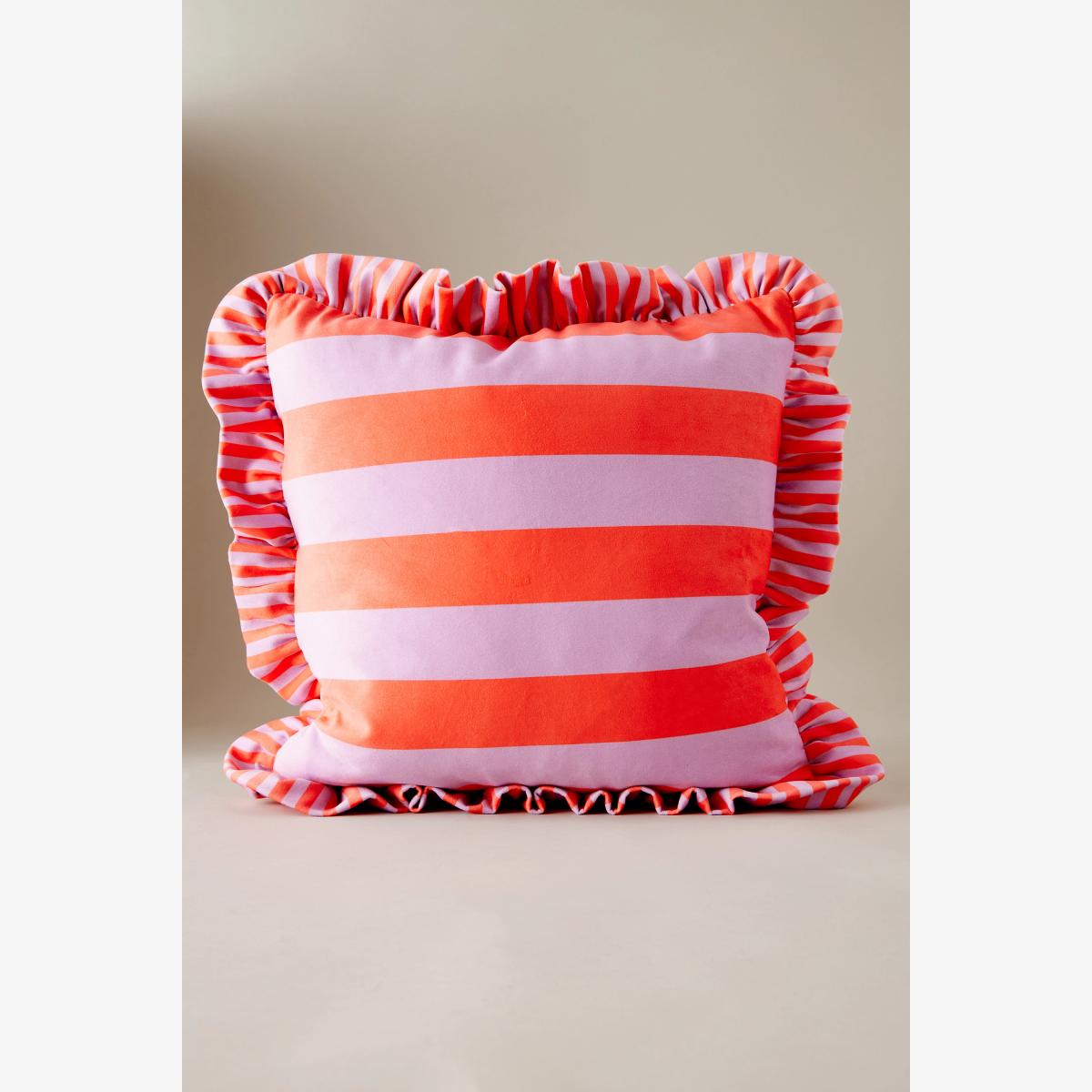 I love this cushion for its vibrant, playful vibe and versatile colour palette. The stripes in warm coral and pink tones make it a great piece for adding colour and interest to neutral sofas or beds. It works particularly well in eclectic, boho, or coastal-inspired interiors, where its lively pattern can contrast beautifully with more subdued furnishings. For styling tips, try pairing it with textures like linen or rattan for a relaxed look, or mix it with solids in complementary shades for a coordinated pop of colour. Its ruffled edges add a touch of whimsy, making it a fun yet stylish choice for casual living spaces or bedrooms that need a lively accent.