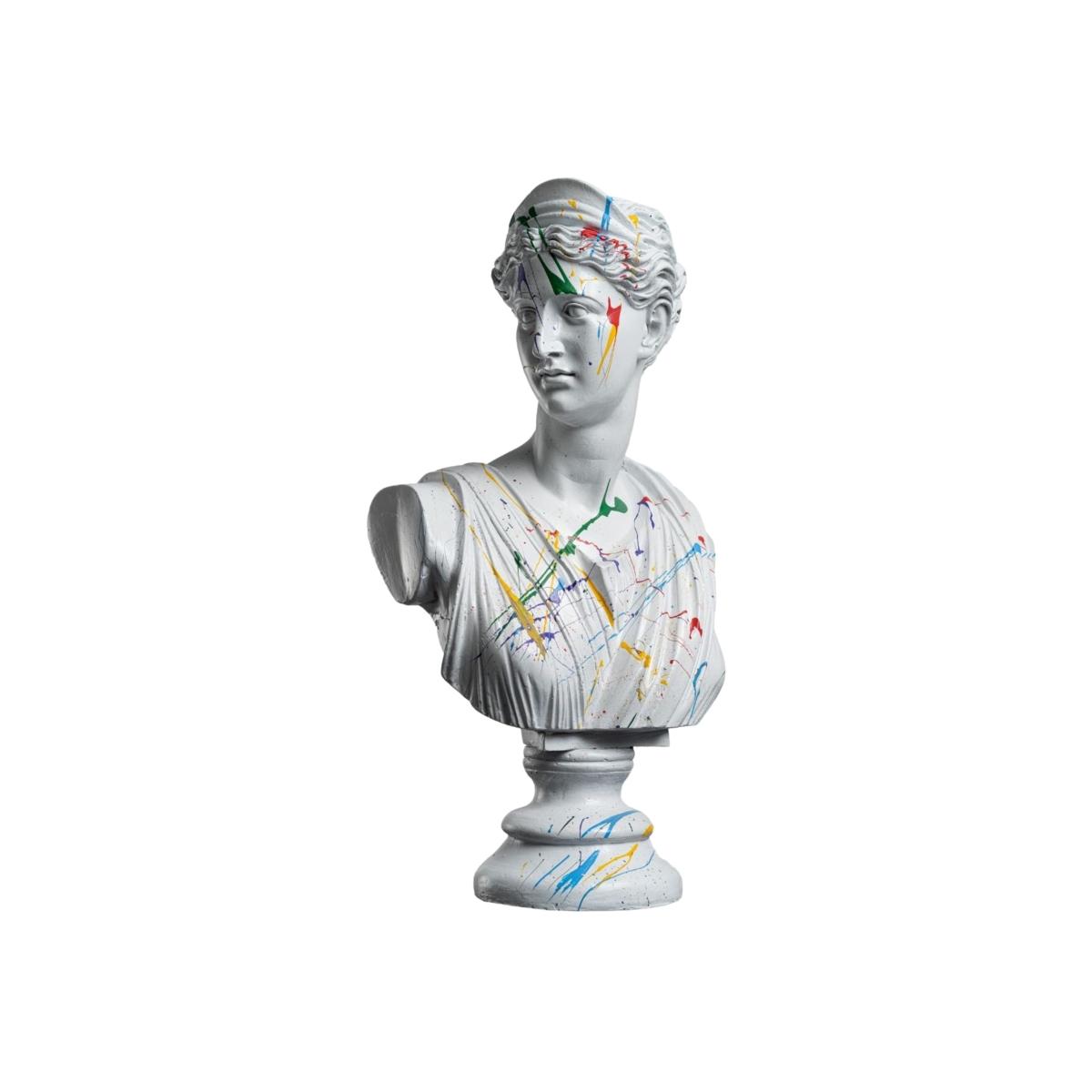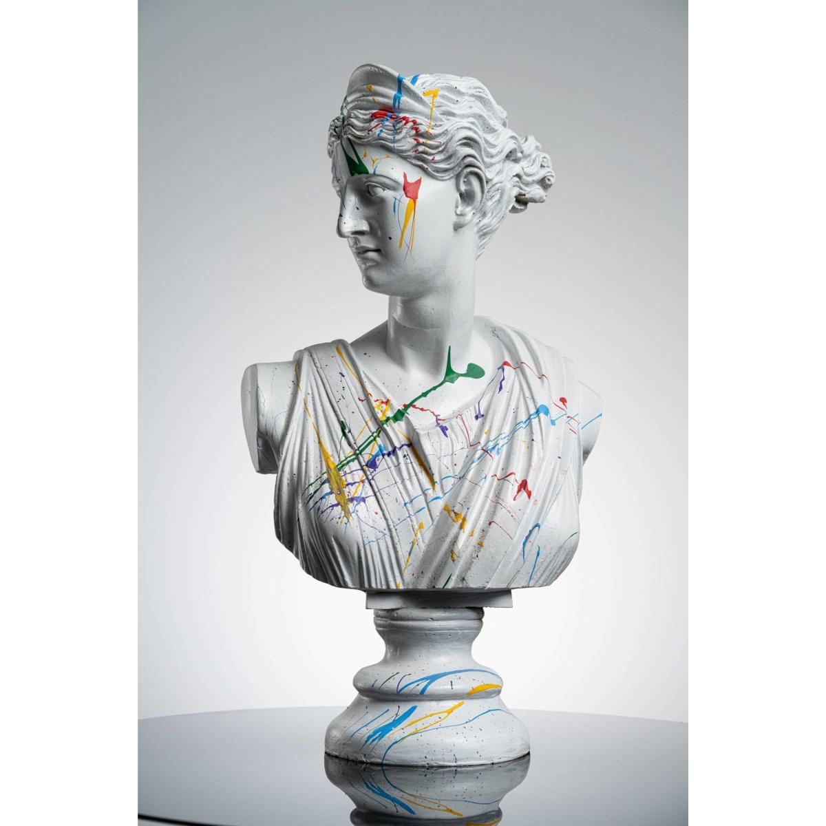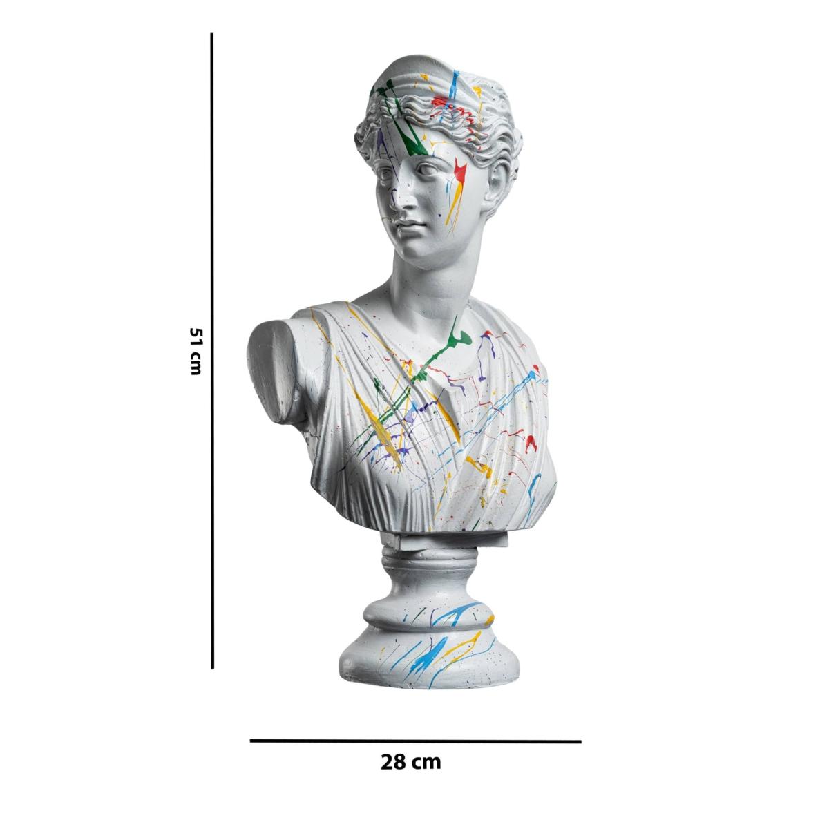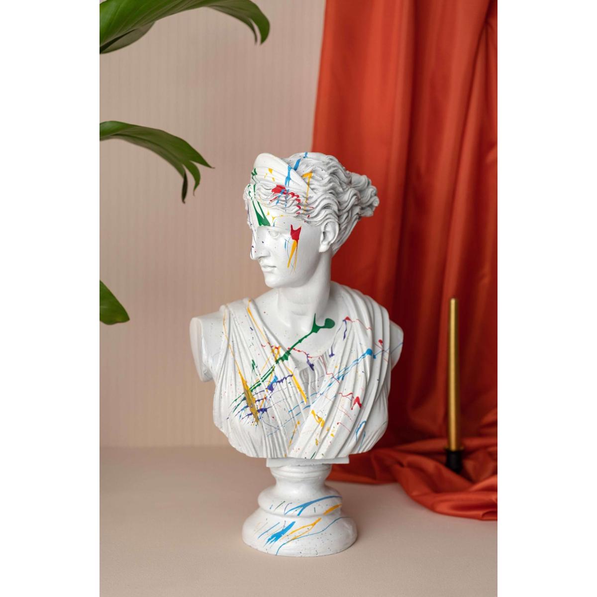 In the myth of Artemis and Orion, the jealous Gods interfered to trick Artemis to kill Orion. The saddened Goddess made Orion’s memory immortal by placing him as a constellation in the sky, like the scattered color paint on this white bust. This handmade version of Leochares’s Artemis is there to remind us that love rules. The artist created this piece of art with great care to show us that even Goddesses fall for it. It is also a reminder that sometimes love hurts, but something beautiful will always come out of it. With its detailed yet delicate features, this bust will be sure to bring some romance and happiness into your space.