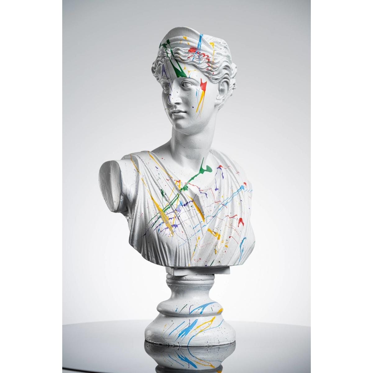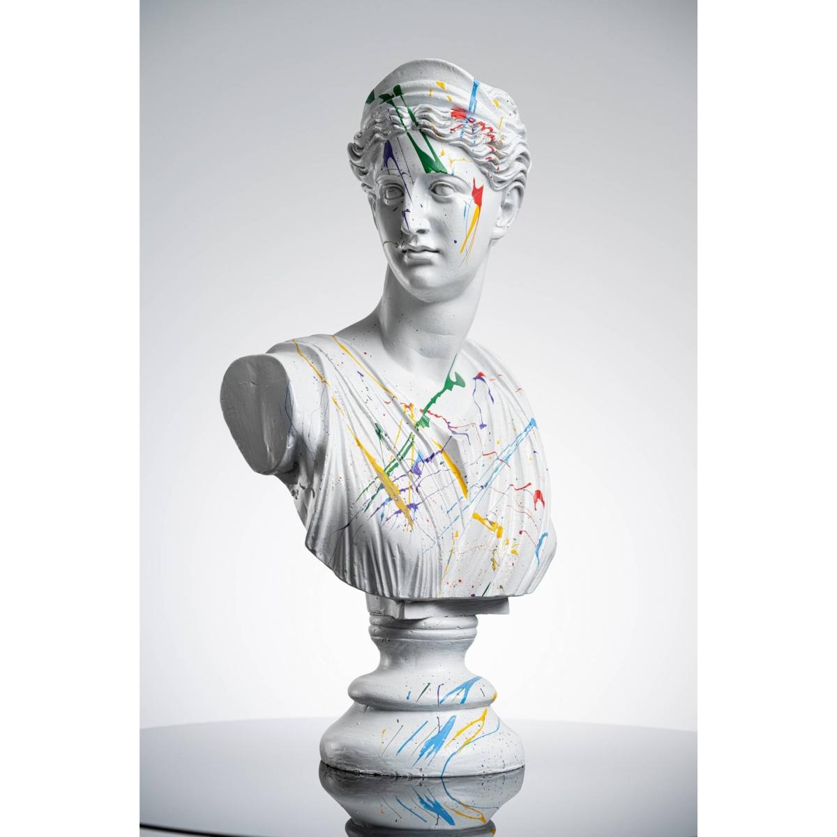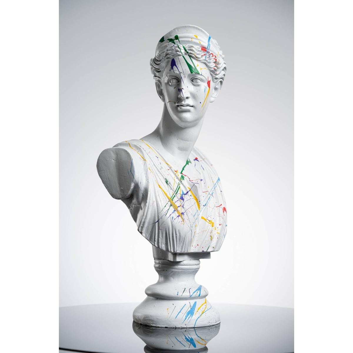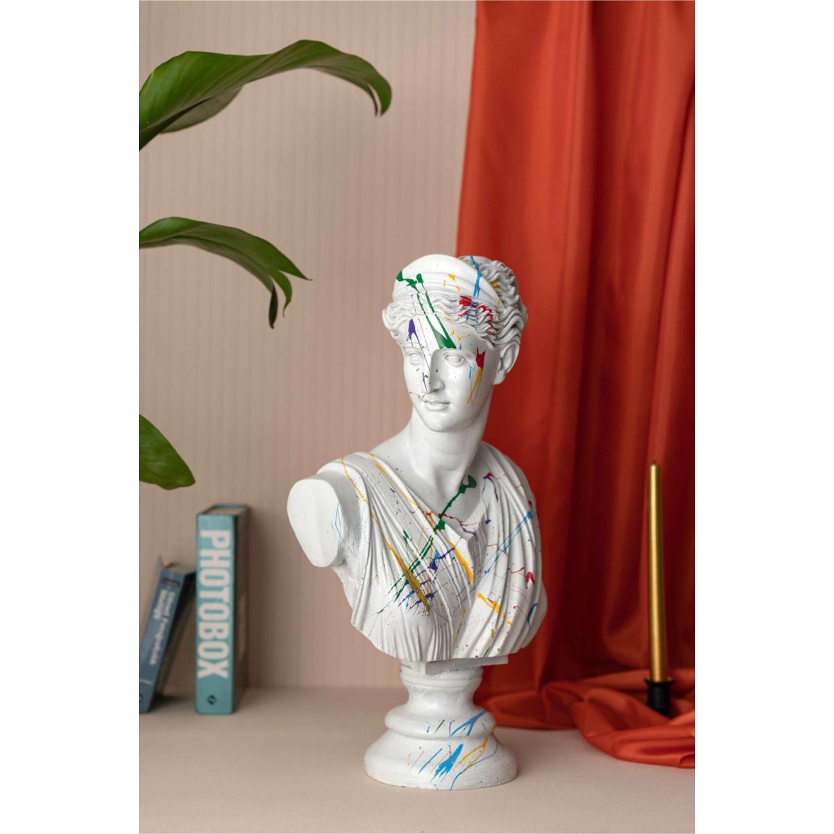 In the myth of Artemis and Orion, the jealous Gods interfered to trick Artemis to kill Orion. The saddened Goddess made Orion’s memory immortal by placing him as a constellation in the sky, like the scattered color paint on this white bust. This handmade version of Leochares’s Artemis is there to remind us that love rules. The artist created this piece of art with great care to show us that even Goddesses fall for it. It is also a reminder that sometimes love hurts, but something beautiful will always come out of it. With its detailed yet delicate features, this bust will be sure to bring some romance and happiness into your space.