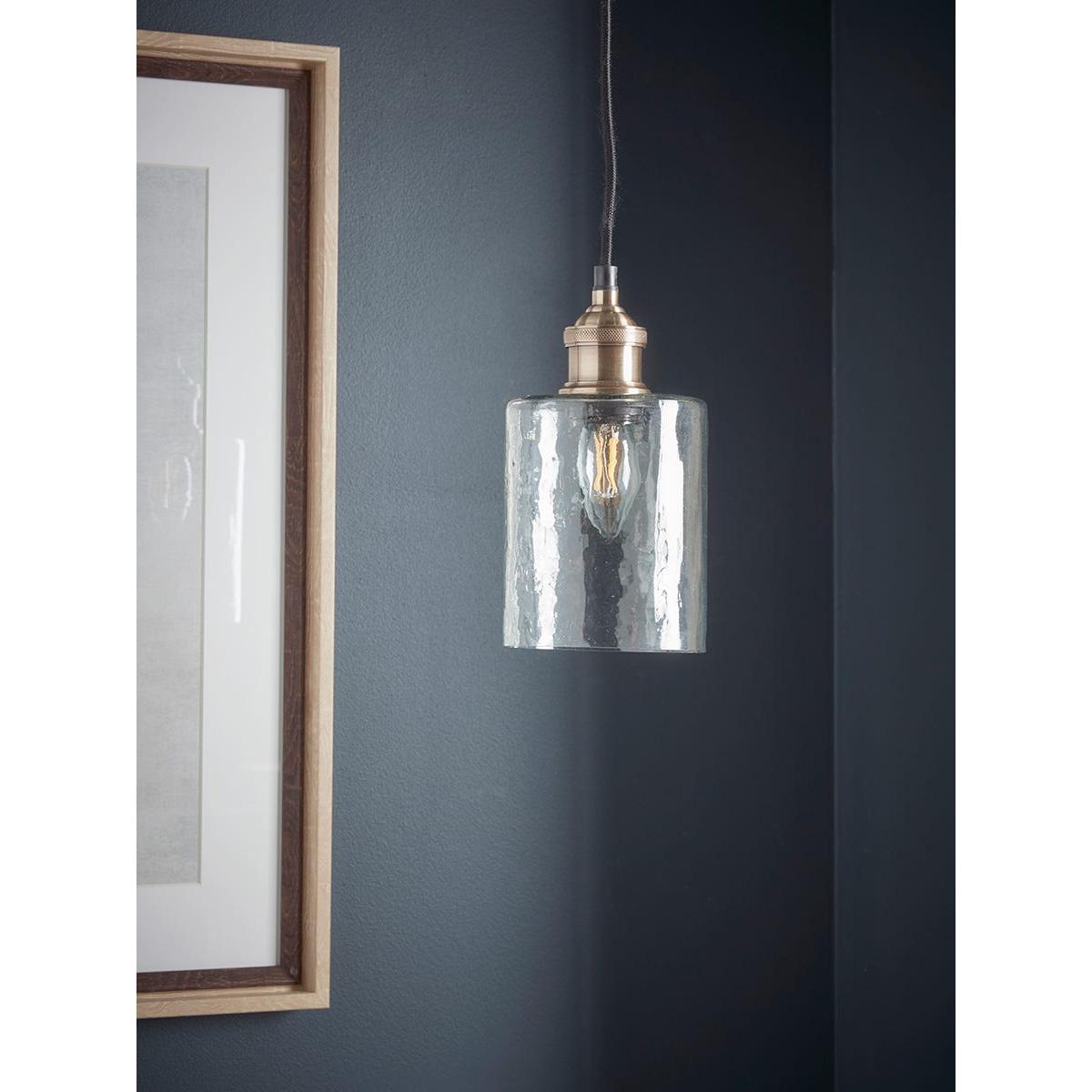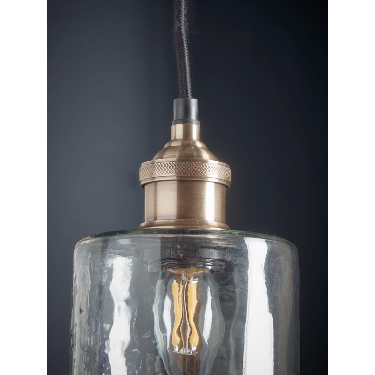 The hammered effect to the shade in this striking pendant adds an aged look to the clear glass which is amplified by the gently antiqued brass of the fixtures. An elegant black fabric flex and clean lines add to the sophistication of this light fitting which will bring directional ambient light to your setting. Perfect for a kitchen or hallway, it is complemented by our matching Column Glass Wall Light. Discover how to create the perfect lighting scheme for your home using our Lighting Buying Guide.
