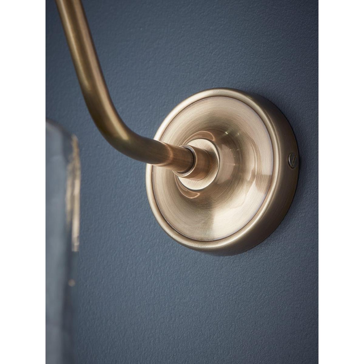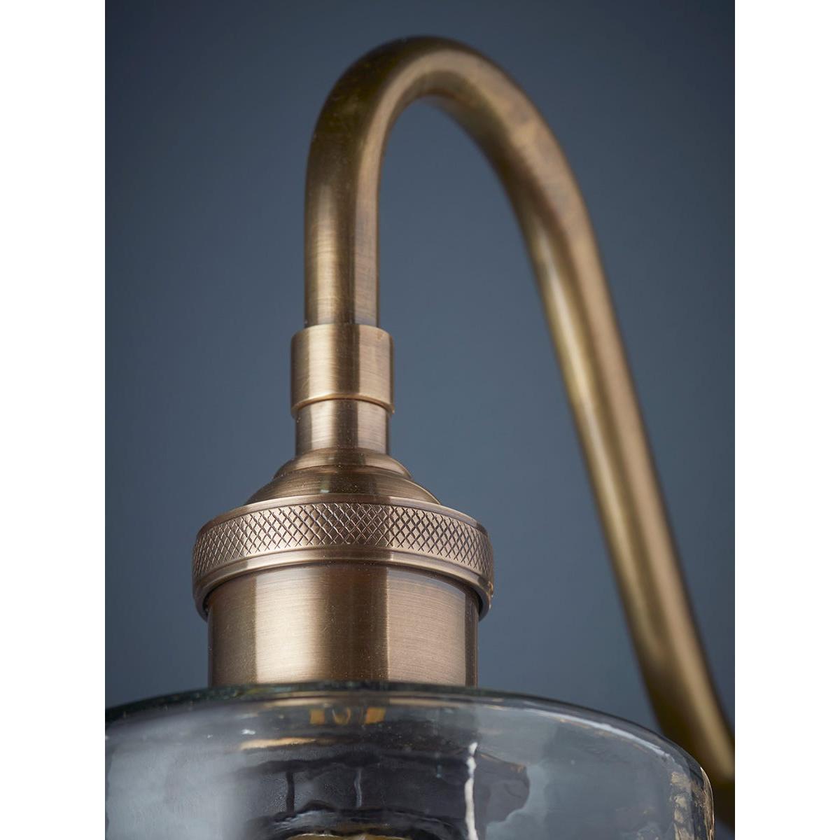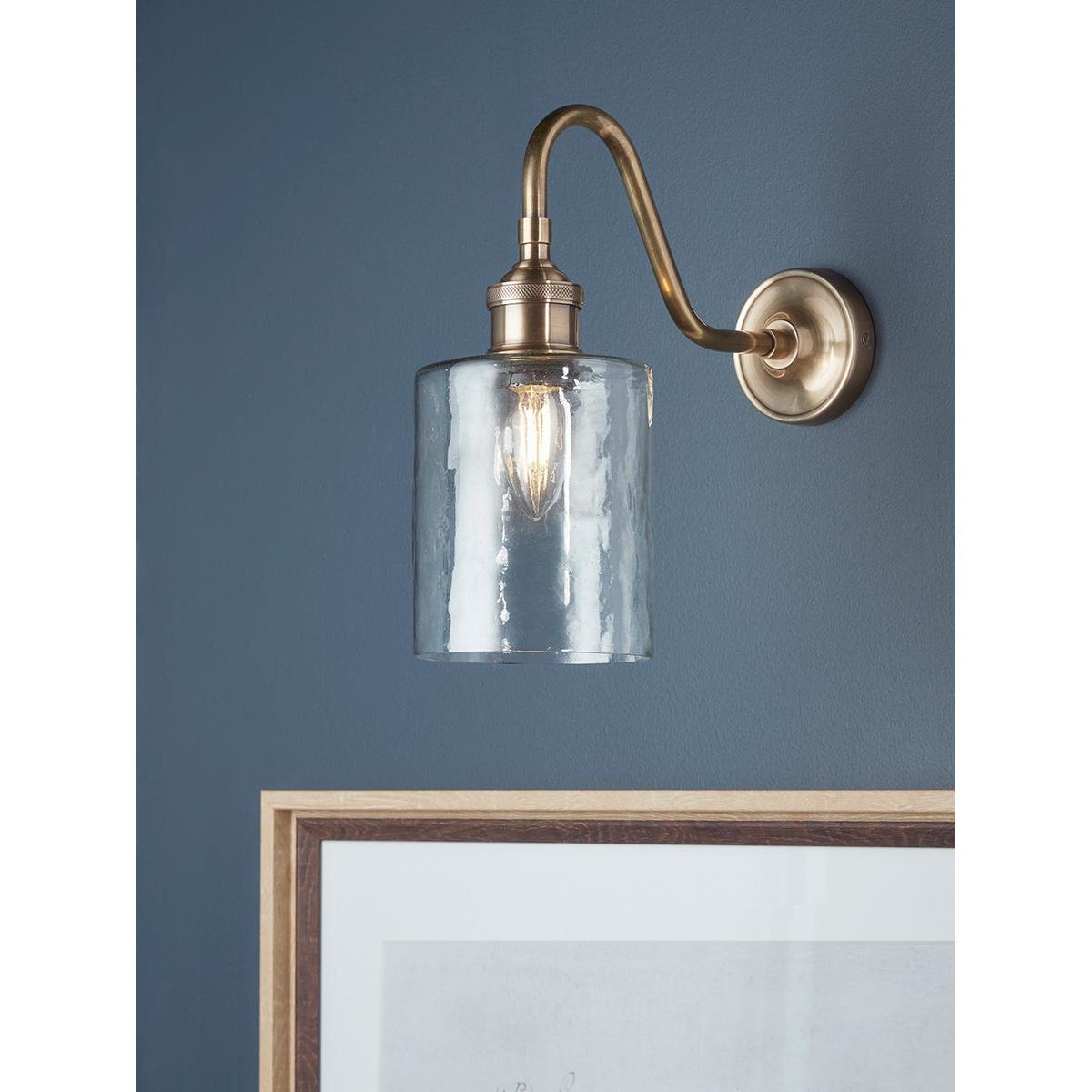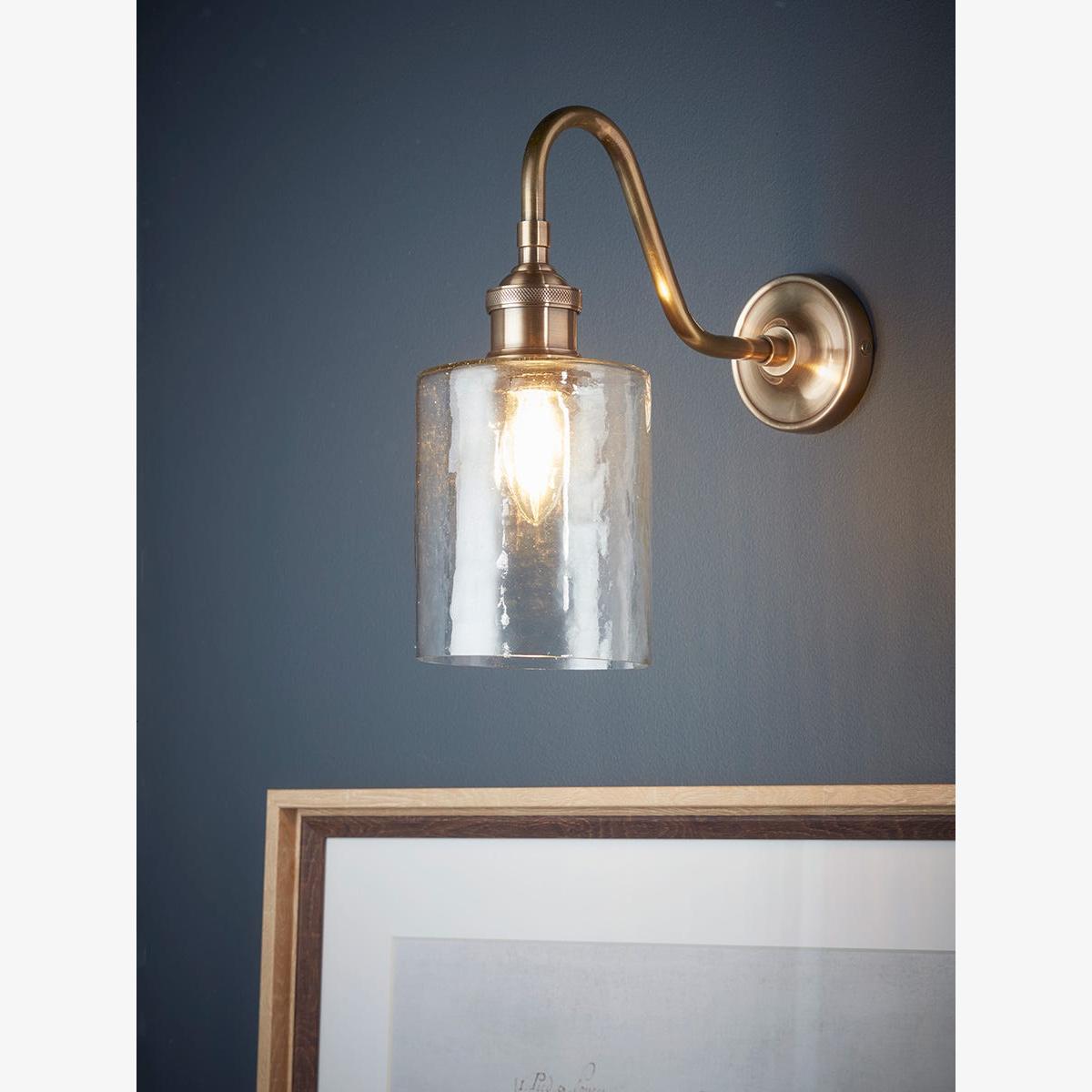With a gently curving arm mounted on a round plate, this elegant wall light has fixtures of richly toned antiqued brass and a shade of gently hammered clear glass. The flat top of the cylindrical shade brings a clean contemporary finish to this light, which will look stylish in both modern and traditional homes. A matching pendant light is also available. Discover how to create the perfect lighting scheme for your home using our Lighting Buying Guide.