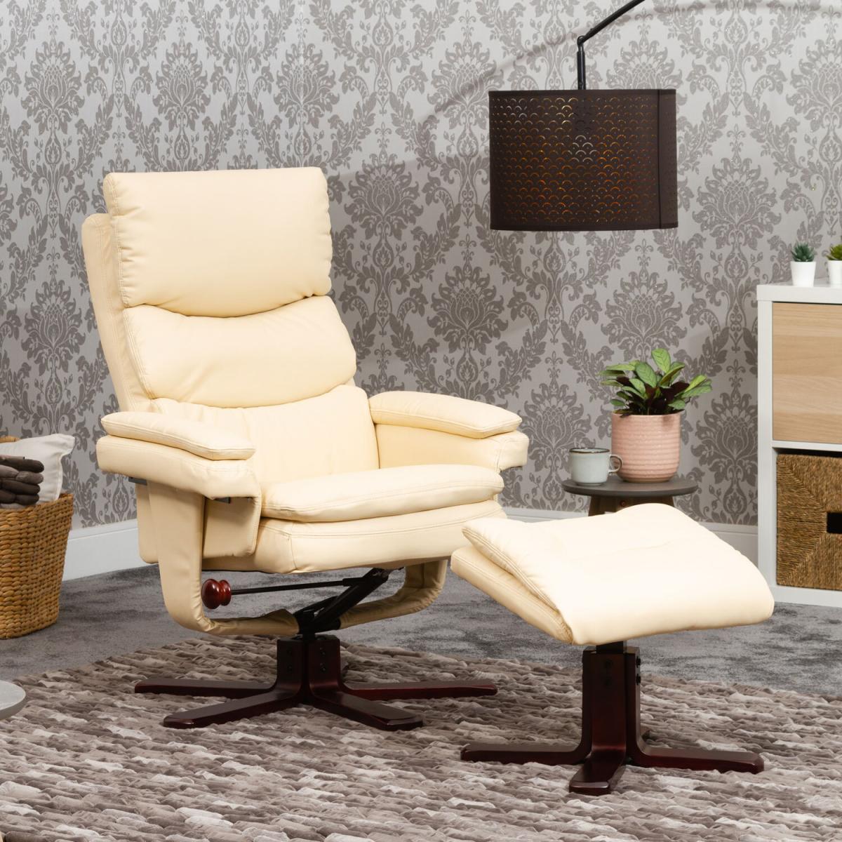 The Colusa Swivel Recliner is a stylish and compact swivel based recliner chair supplied with matching stool. The chair is constructed from a combination of solid, hard wood and strong supportive steel. The interior is both sprung and foam filled for both comfort and support and the chair and stool are upholstered in a durable bonded leather, with some faux leather used on the lower stress areas. The chair reclines with body movement and can be secured in place with a handle fixed to the side of the chair. The chair also boasts integrated massage points in the seat, lower and upper back and also a warming heat function in the lumbar region.