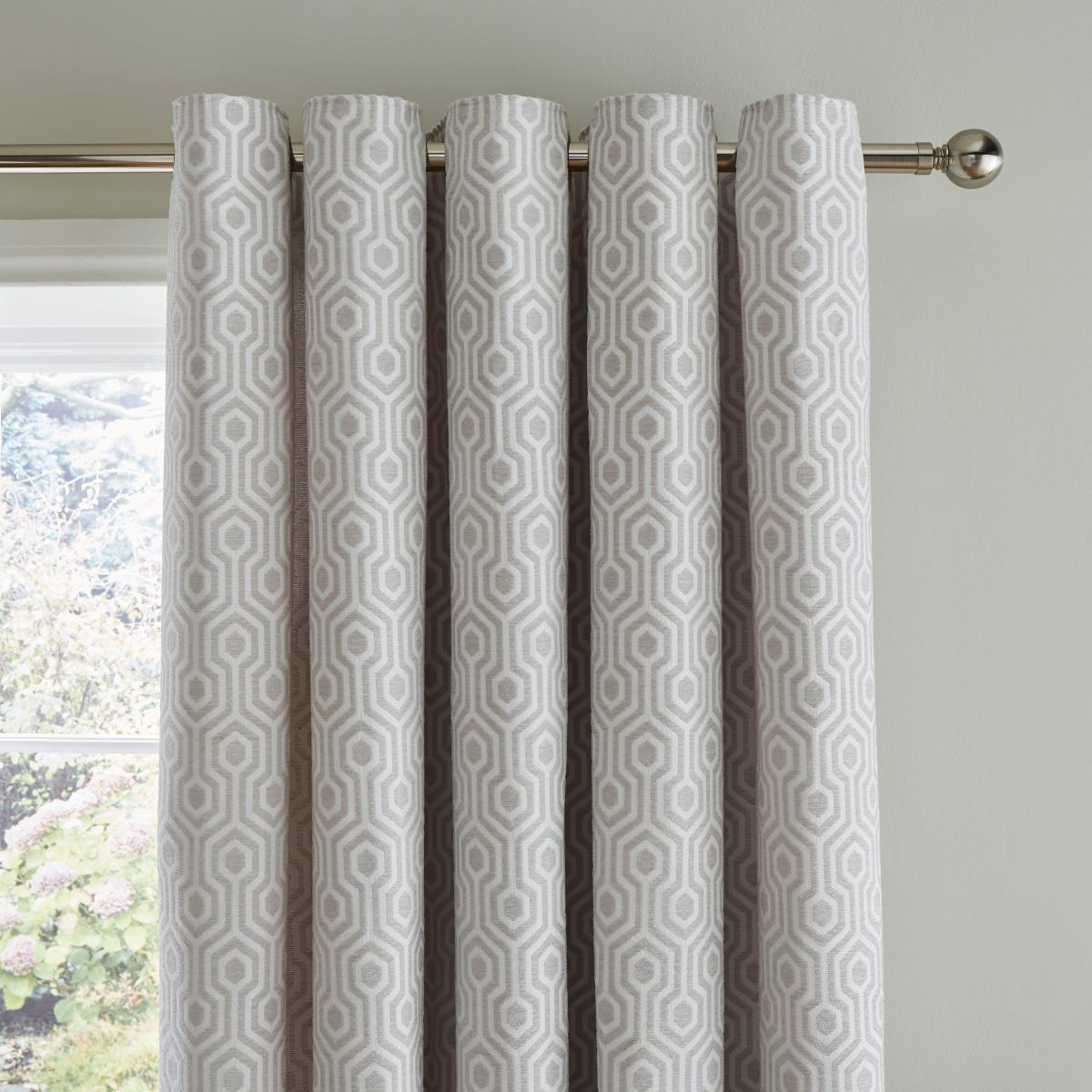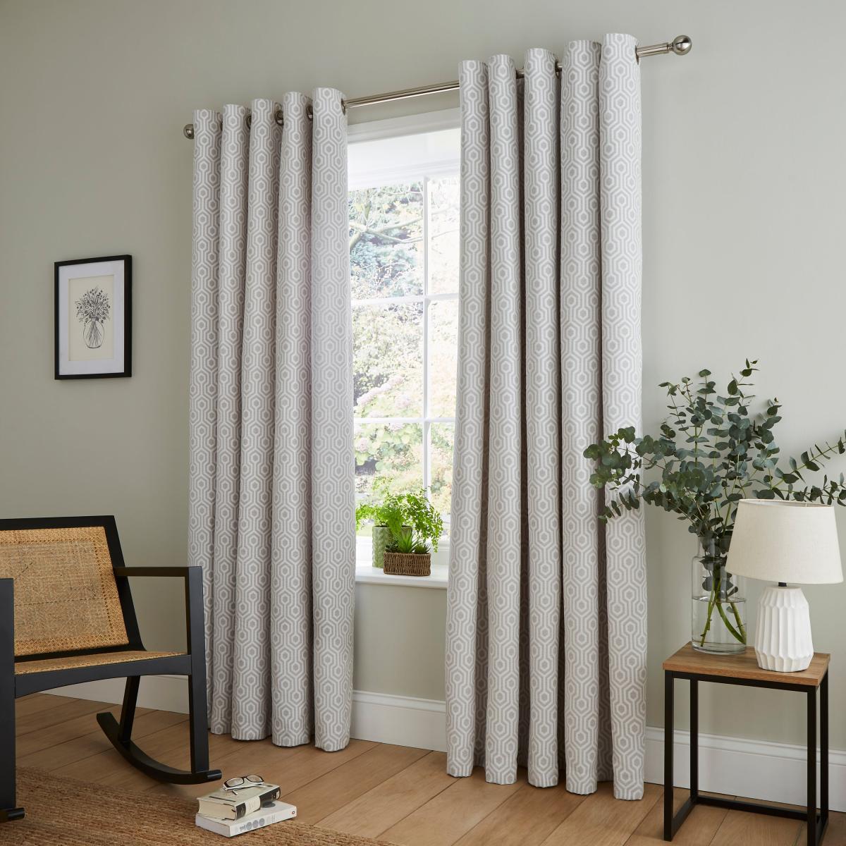 The pattern has been printed onto a 100% polyester face fabric and lined with a recycled polyester lining. The lining will help preserve the design and front fabric from fading, making these curtains long-lasting. Complete with a smart eyelet header, these curtains are designed for use with a curtain pole. Coordinate the curtains with the matching cushion for a stylish room look. Please note:. Pattern matching can not be guaranteed across multiple pairs of curtains. This collection is verified by OEKO-TEX® and independently tested for harmful substances as well as manufactured using sustainable processes under socially responsible working conditions. MADE IN GREEN by OEKO-TEX® is a unique product label to trace the countries and production facilities - search the product label for more information.