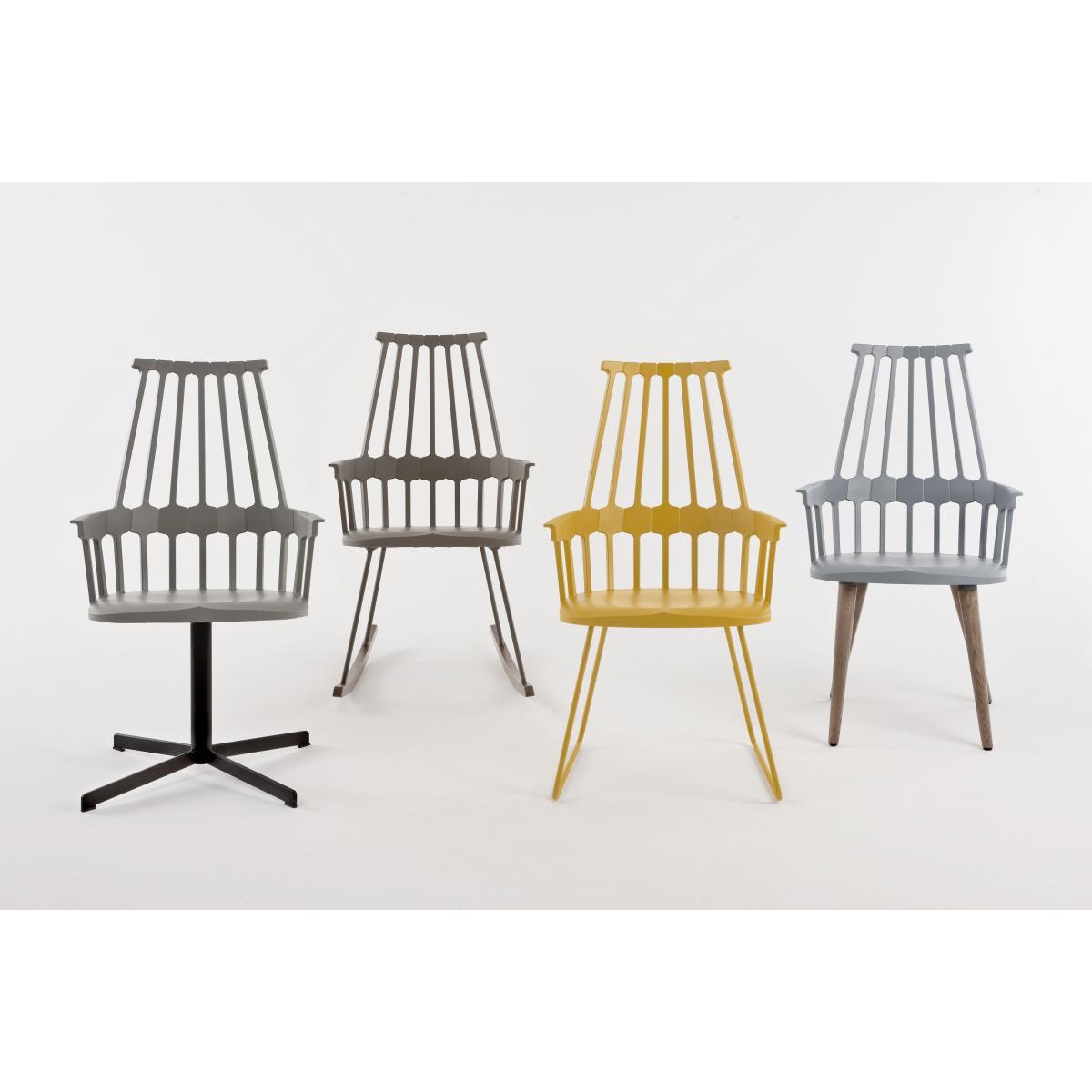 "Kartell once again has fun in revisiting a great classic and giving a new look to the Windsor chair. A return to the glorious past of England in the XVIIIth century for a ""Comb Back"" version with a glossy structure featuring a backrest consisting of seven ""teeth"" which spread out towards the lumbar region where they meet a reinforced hexagonal rim with slim shafts radiating down to join the seat. A goodly size, this single mould chair embodies functionality and ergonomics well-freighted with sentiment and memories. The use of plastic and the bright colours available give a touch of lightness and the contemporary to the Comback chair".