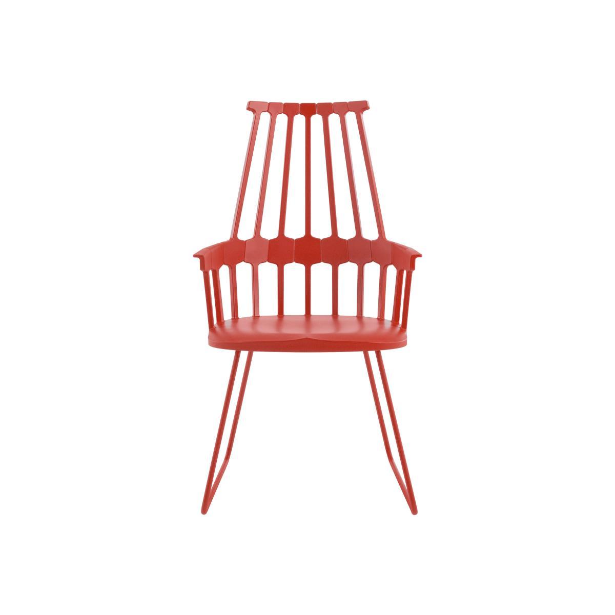 "Kartell once again has fun in revisiting a great classic and giving a new look to the Windsor chair. A return to the glorious past of England in the XVIIIth century for a ""Comb Back"" version with a glossy structure featuring a backrest consisting of seven ""teeth"" which spread out towards the lumbar region where they meet a reinforced hexagonal rim with slim shafts radiating down to join the seat. A goodly size, this single mould chair embodies functionality and ergonomics well-freighted with sentiment and memories. The use of plastic and the bright colours available give a touch of lightness and the contemporary to the Comback chair".