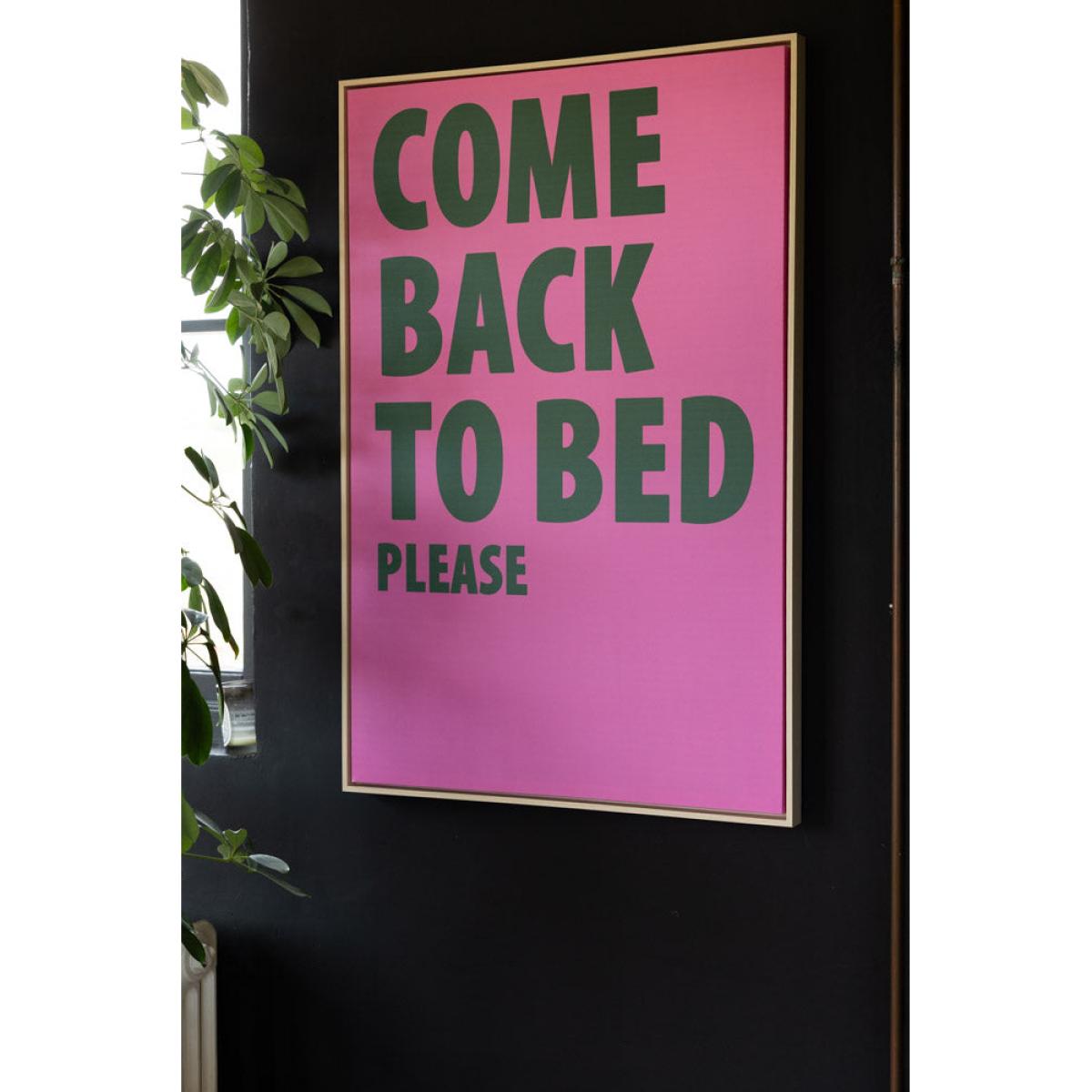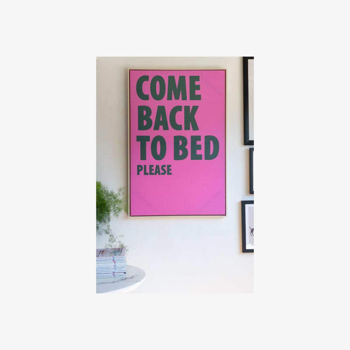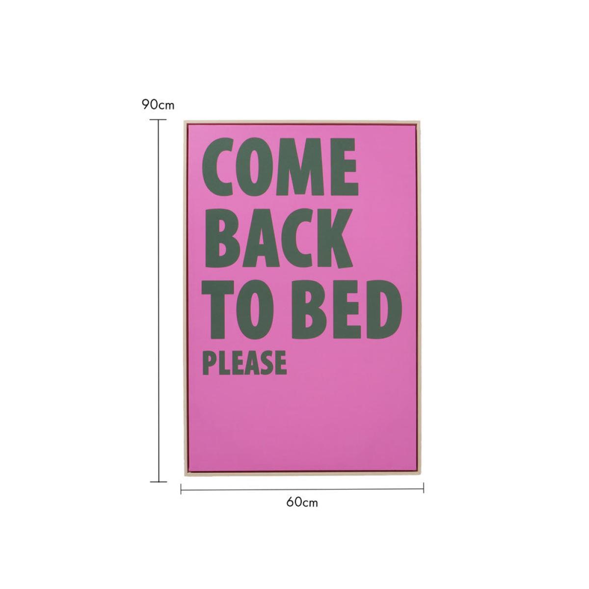 Introduce playful (and optimistic) energy to your home with our Come Back To Bed Canvas. This vibrant print is perfect for bringing a fun and flirty vibe to any room, with a hot pink background serving as an eye-catching pop of colour, standing out as a stunning focal point on your wall. In perfect contrast, 'Come Back To Bed Please' is printed in block capitals using a dark sage green, adding a touch of natural elegance that effortlessly blends with both eclectic and modern interior styles, with the natural wooden frame in particular giving this a sophisticated edge we love. Perfect for your bedroom, living area or even your office, style this with love - and be careful what you wish for! - Come Back To Bed Canvas - Measures: W60cm x H90cm x D3.5cm - Materials: Acacia Wood, Eastern Cottonwood