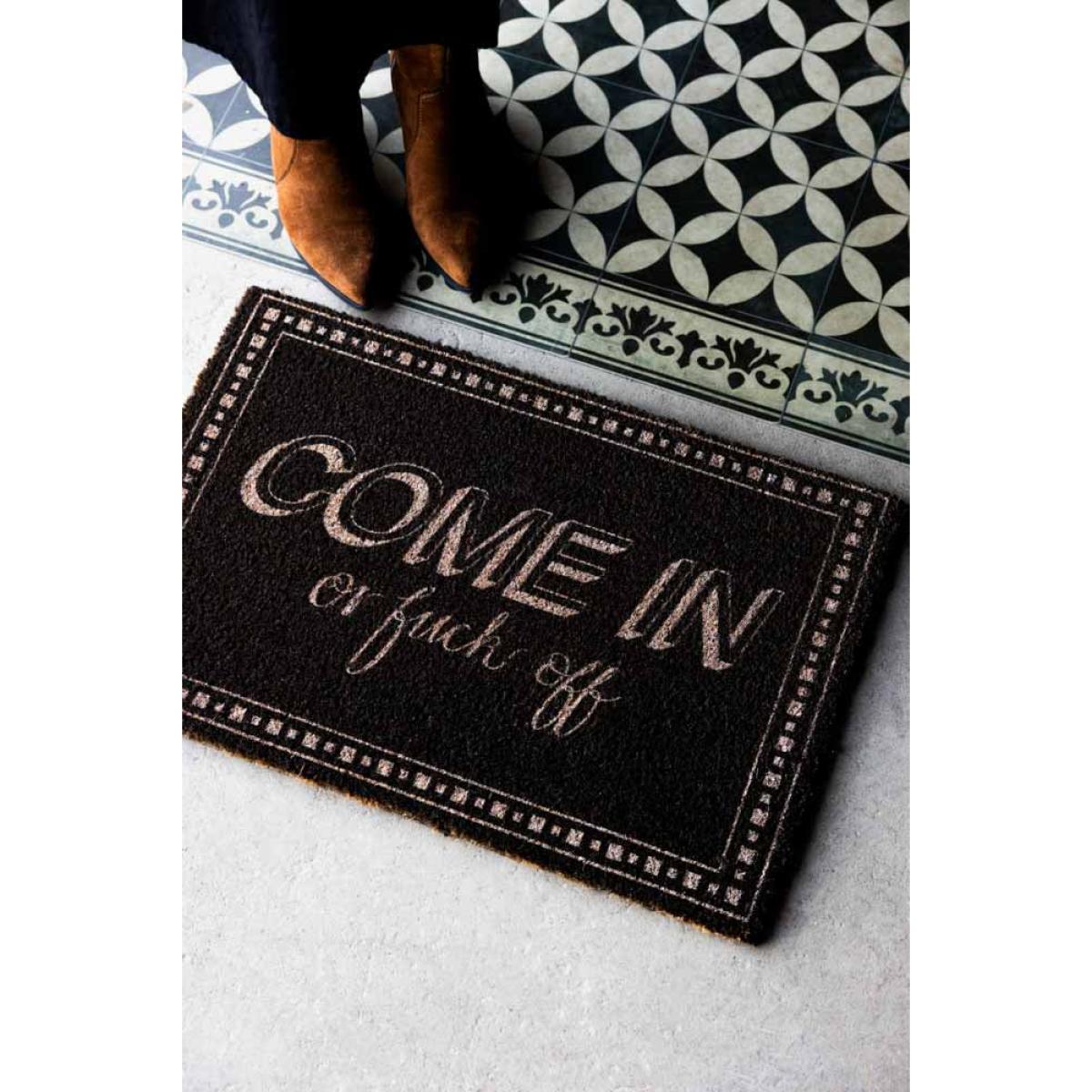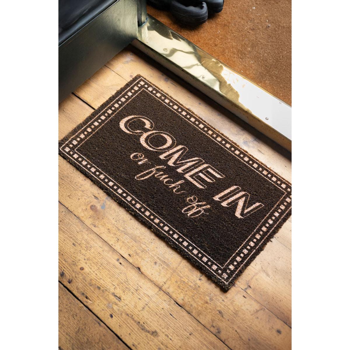 <!--td -- > Welcome your guests (or not) with a pinch of humour and sass with our Come In Or Fuck Off Doormat. This black doormat makes a hilariously naughty statement that will have everyone laughing before they even step indoors. It boasts the cheeky phrase “Come In Or Fuck Off” in the centre of a playful border, adding a fun touch and framing the message perfectly. Ideal for those who aren’t afraid to show their sweary side, this doormat makes a fantastic addition to your home, especially if you regularly have guests who can't quite make their minds up... - Come In Or Fuck Off Brown Doormat - Measures: W60 x H40cm - Material:Coconut Matting