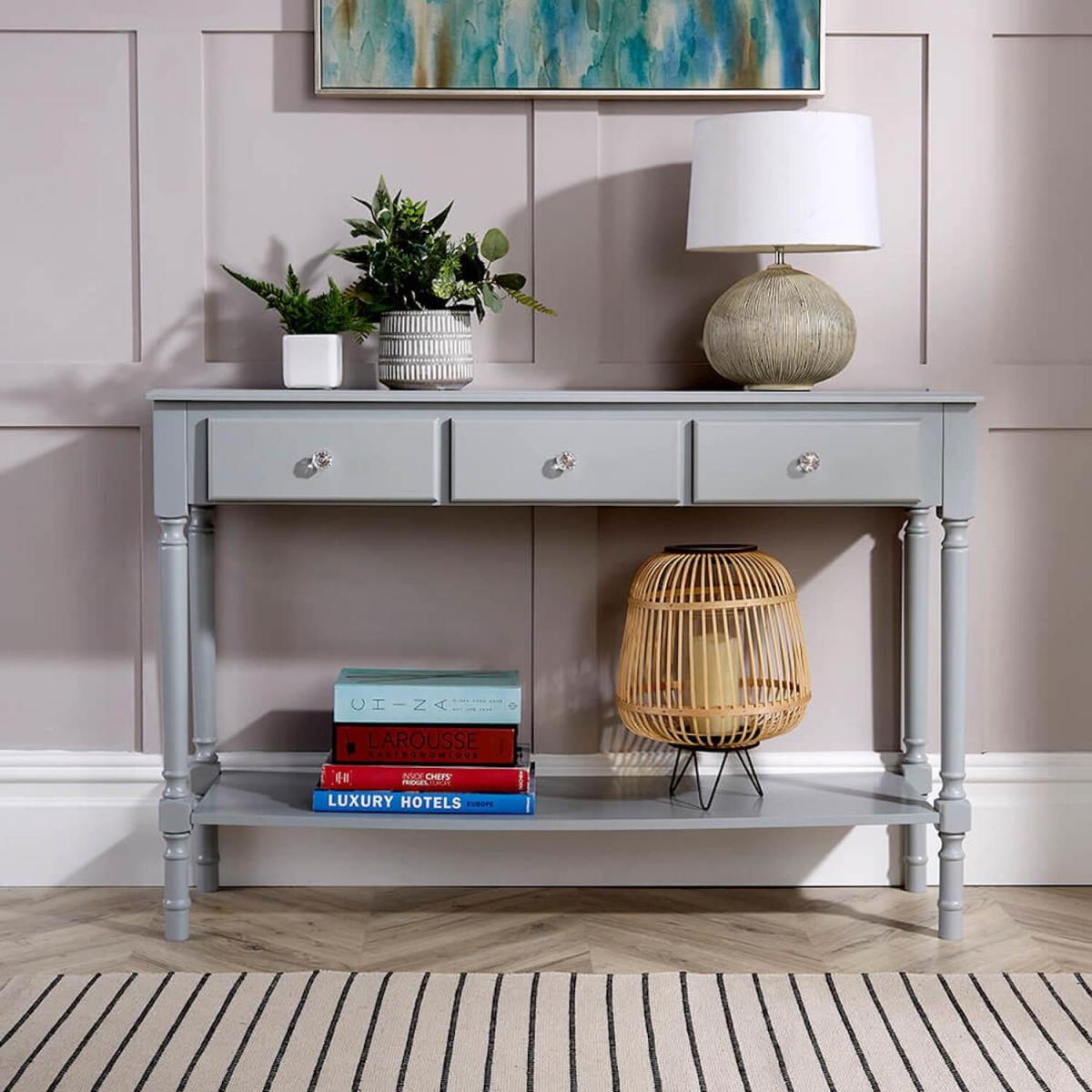 I’m a fan of this grey Como console for its clean lines and practical three-drawer design, which makes it ideal for hallways or behind sofas. Its turned legs and neutral finish slot neatly into modern-Scandi, coastal or traditional interiors without overwhelming the space. For styling, balance a slim lamp on one end with a shallow tray or bowl for keys and mail on the other, then use the bottom shelf for a woven basket or a few coffee-table books. A circular mirror or simple gallery of prints above will complete the look while keeping the area light and welcoming.