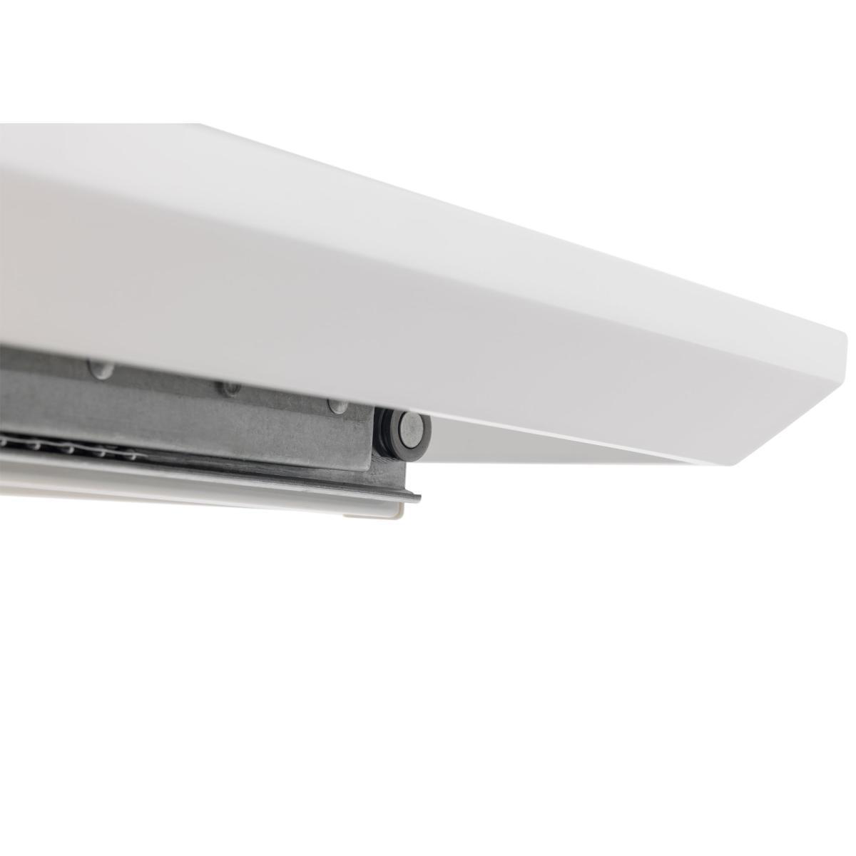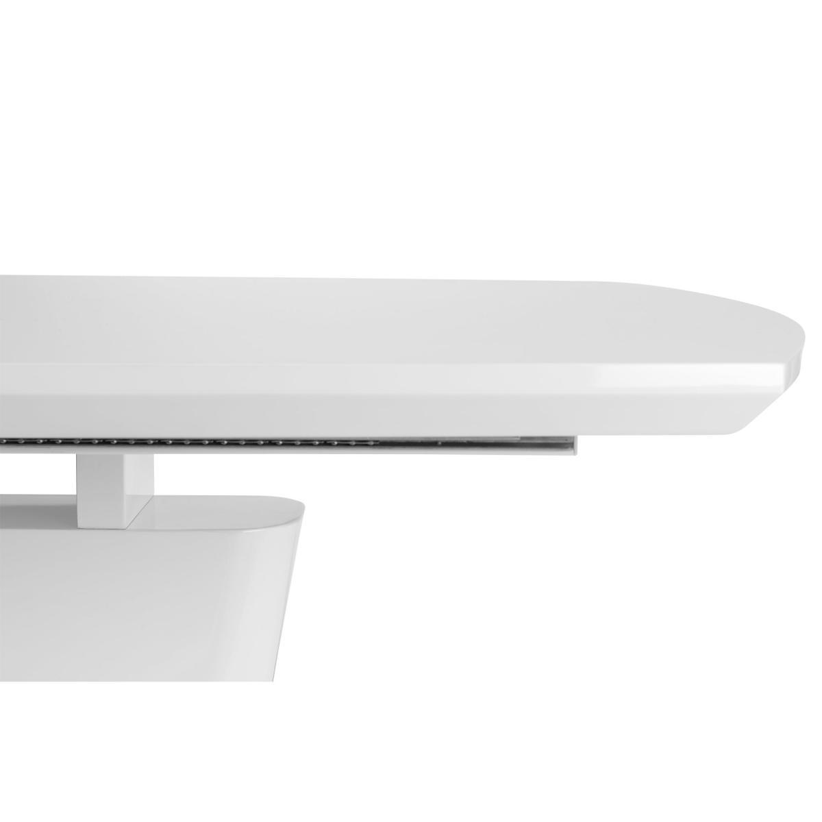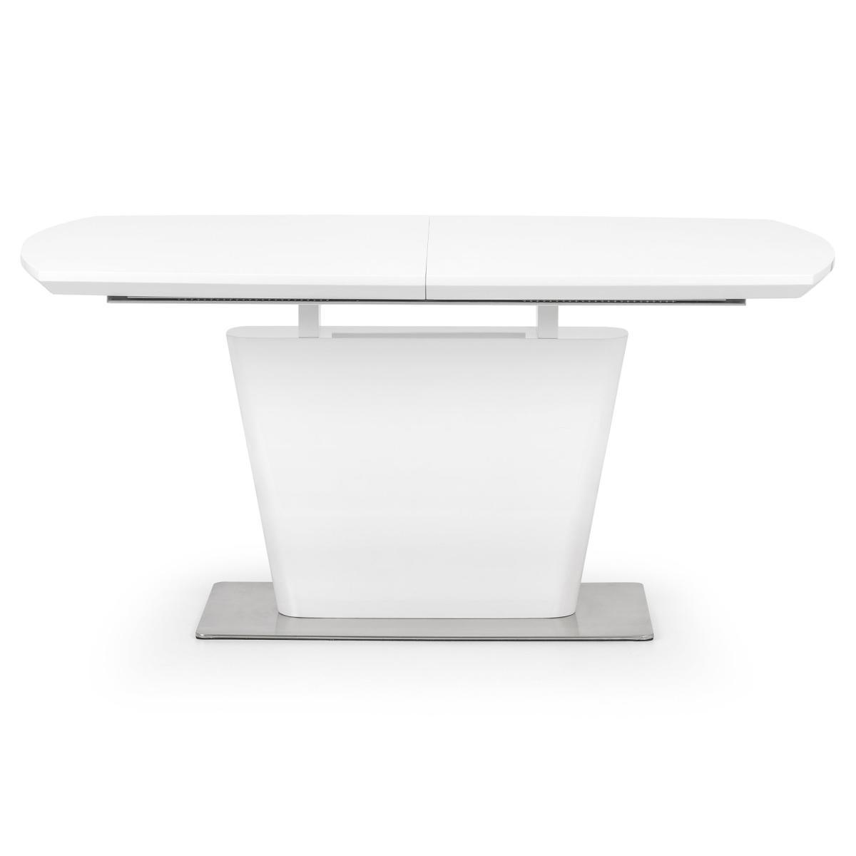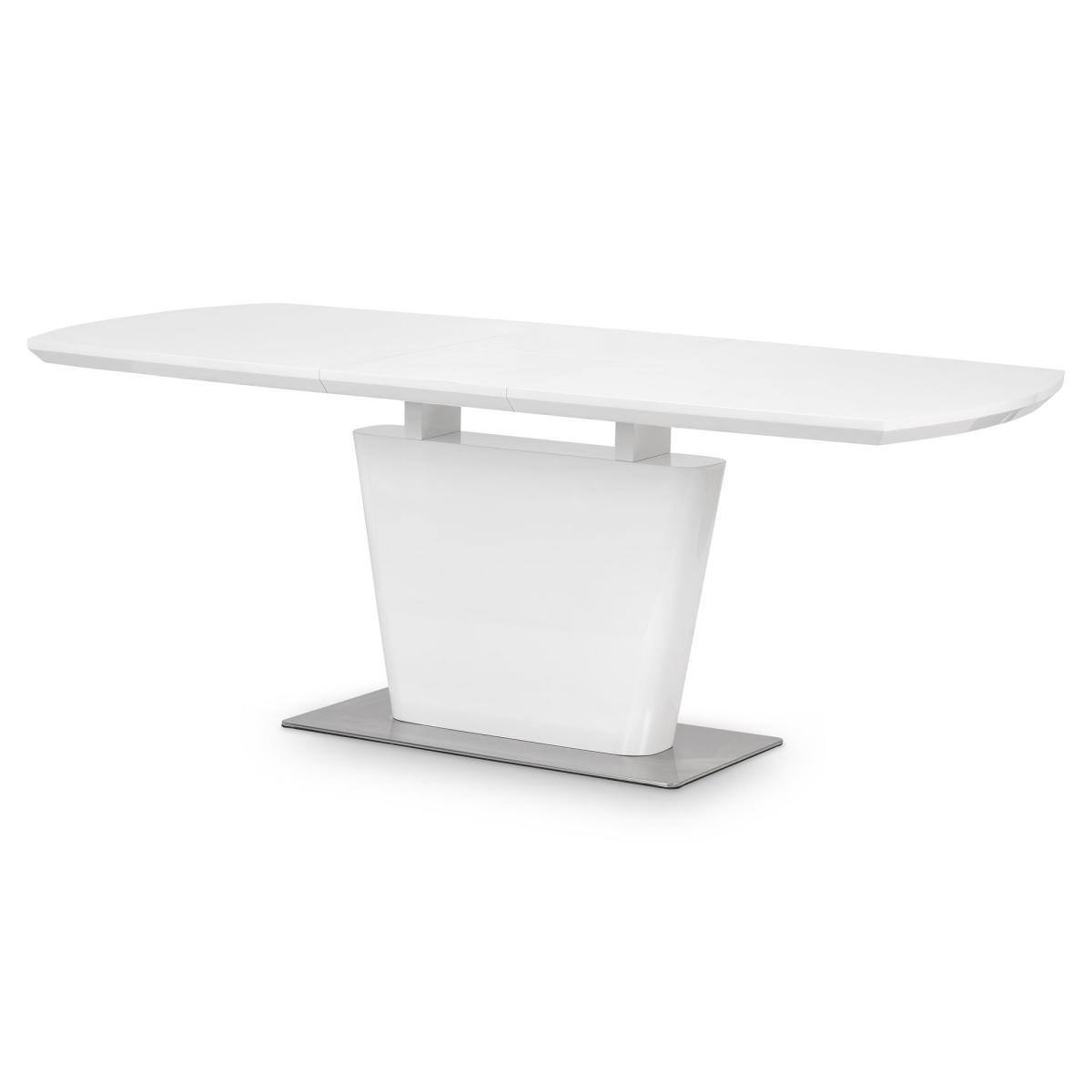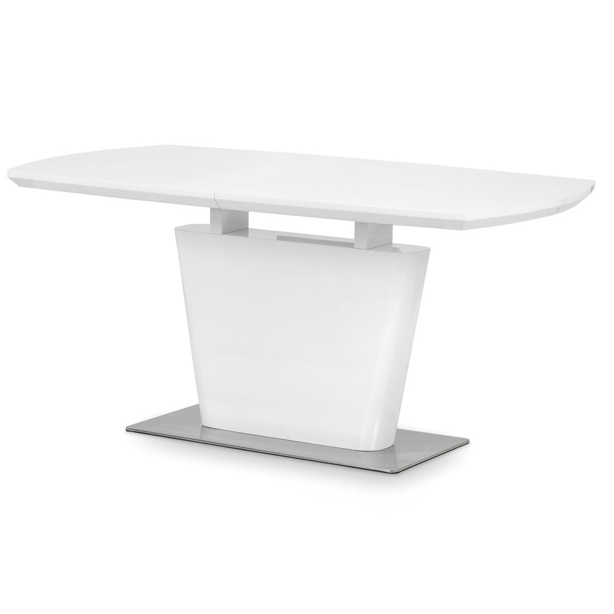 Boasting a crisp white finish, this dining table features a handy butterfly extension that makes it ideal for family gatherings or special occasions. With a chrome pedestal base and stylish velvet cross stich chairs, this set adds a modern twist to your kitchen or dining room.