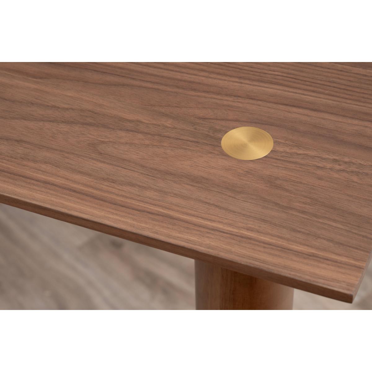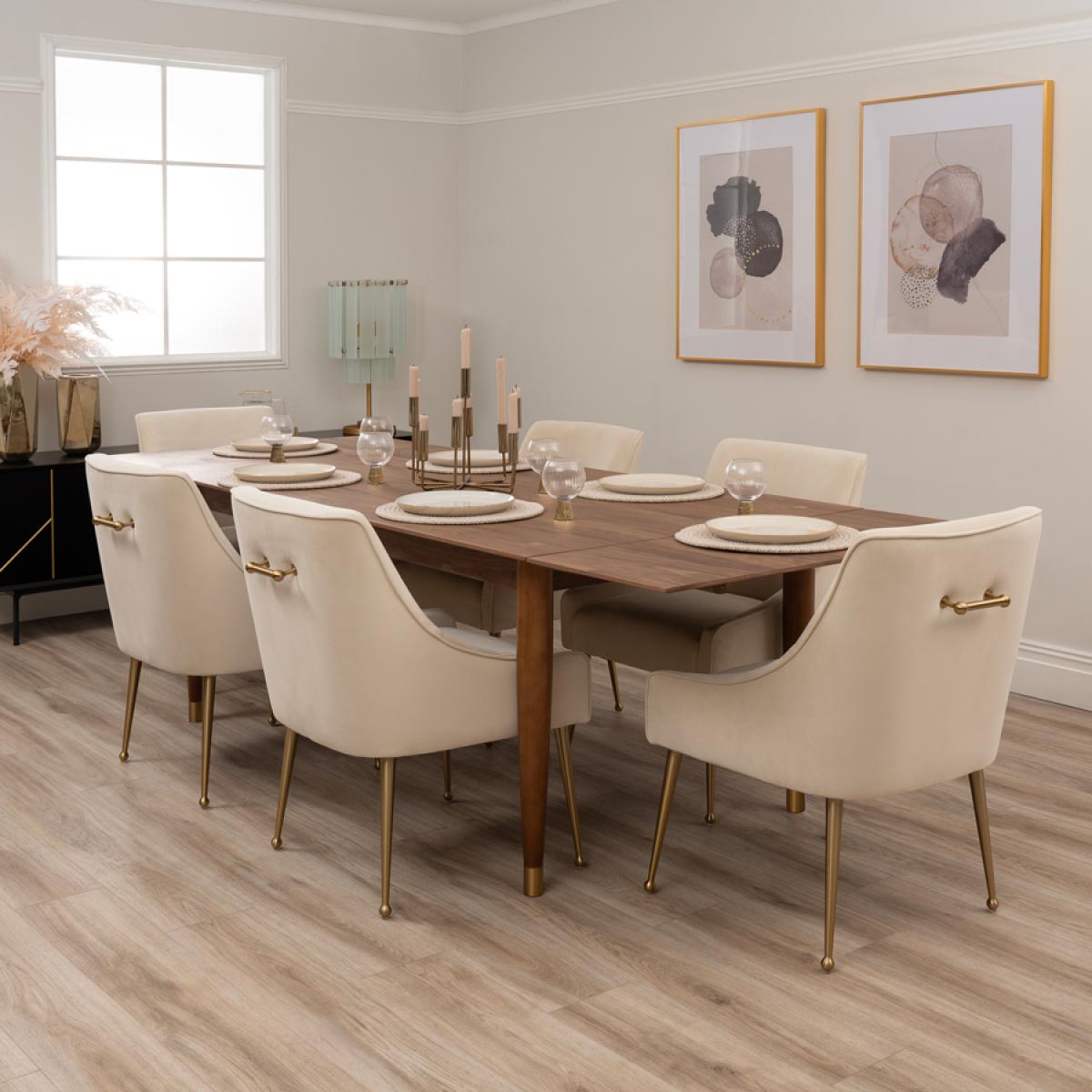 A generously proportioned extending dining table, ideal for dinner parties and festive occasions. Solid walnut base. Walnut veneer top. Brushed brass foot caps and inlay details. Satin lacquer finish. Brushed stainless steel chair bases and handles with brass finish. Velvet upholstery fabric. Simple assembly of table and chairs required.