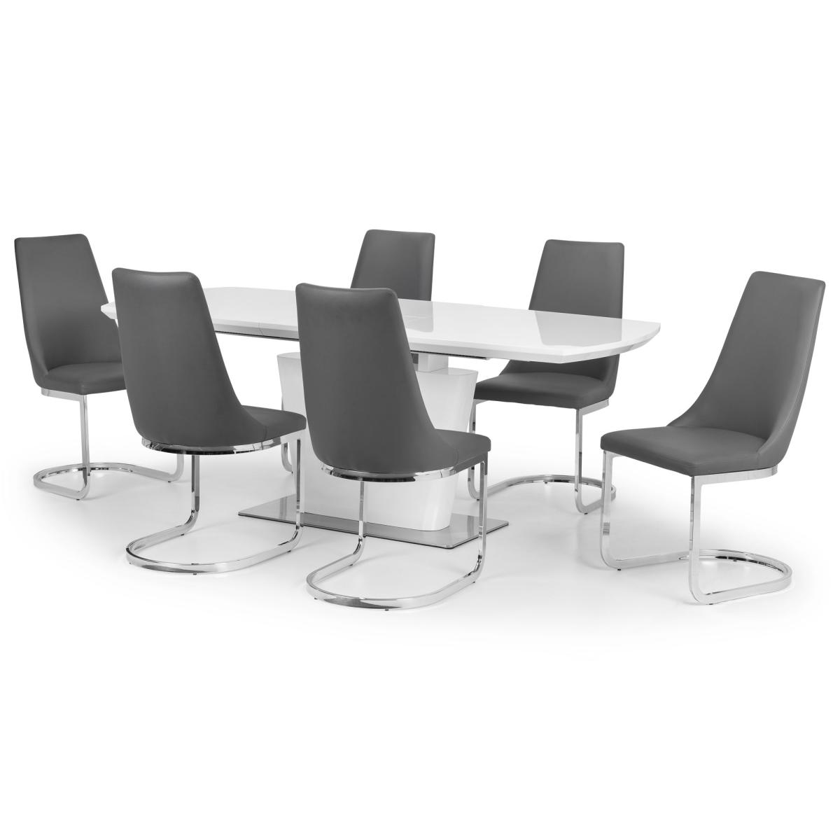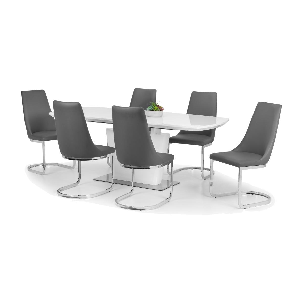 I love this dining set because of its sleek, contemporary design and versatile grey finish, making it easy to blend into both modern and minimalist interiors. The extendable feature of the table is especially practical, allowing you to accommodate guests comfortably when needed without sacrificing style in everyday use. It pairs well with a range of colour palettes, from neutral tones to more vibrant accents, and works beautifully with both soft textiles and bold statement pieces. To style it effectively, consider adding a textured rug underneath to define the space, and complement the grey chairs with colourful or patterned tableware to bring personality to the setting. This set is equally suitable for open-plan kitchens or formal dining rooms, offering the perfect blend of functionality and clean aesthetics.
