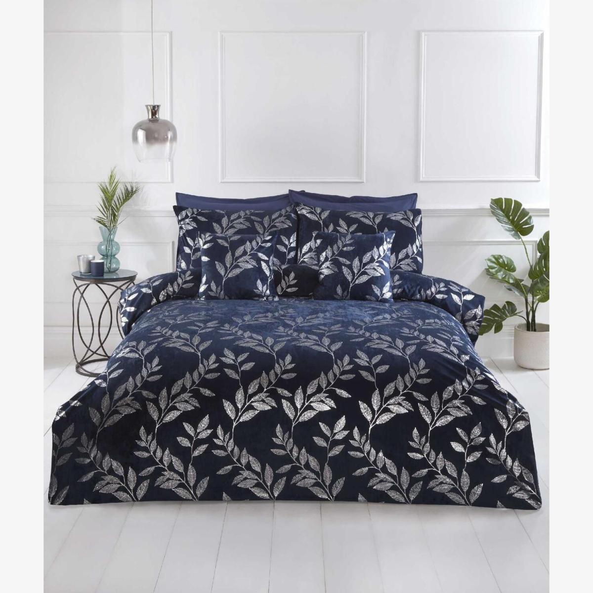 Como design is the ideal combination of refined elegance and stylish colour. Inspired by the northern Italian city, Como. Featuring silver foil printed leaves on a navy-blue base, this bedding is sure to turn your bed into the main feature of any bedroom. Button closure. Matching filled cushion also available. Made from Easycare fabric ( 50 cotton, 50 Polyester). Available in sizes Single duvet cover (135x200cm) and 1 pillowcase (50x75cm)Double duvet (200x200cm) and 2 pillowcases (50x75cm)King size (220x230cm) and 2 pillowcases (50x75cm)Super King size (220x260cm) and 2 pillowcases (50x75cm) Matching filled cushion also available seperately (30x40cm) Super King size (220x260cm) and 2 pillowcases (50x75cm). Material composition Made from Easycare fabric ( 50 cotton, 50 polyester). Care instructions Machine washable (max temp 40c), Tumble dry on low heat, Warm iron (max 150. C)