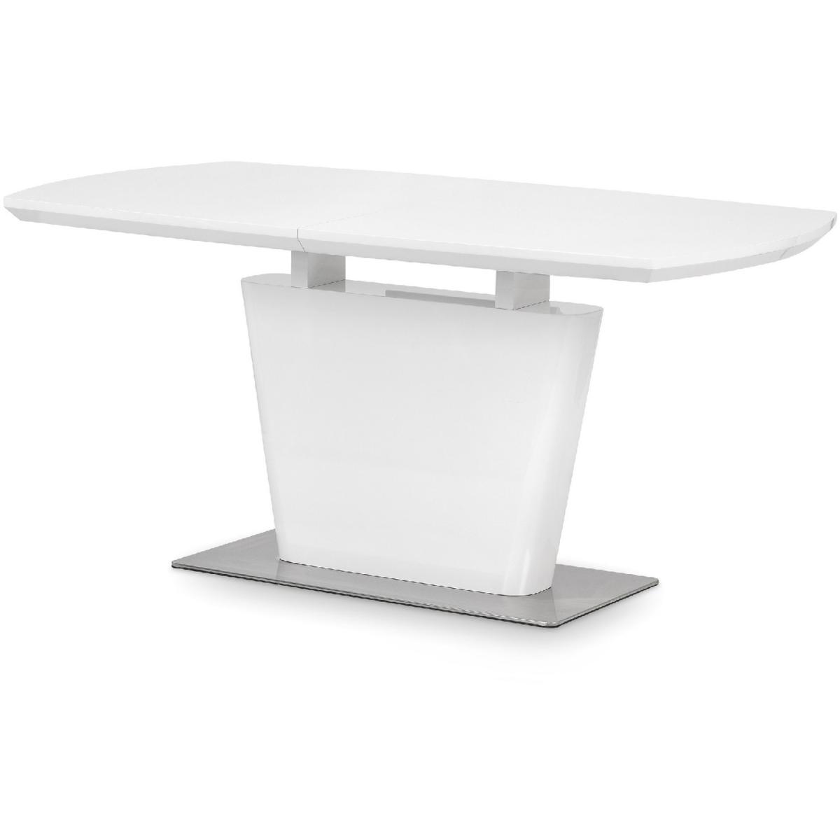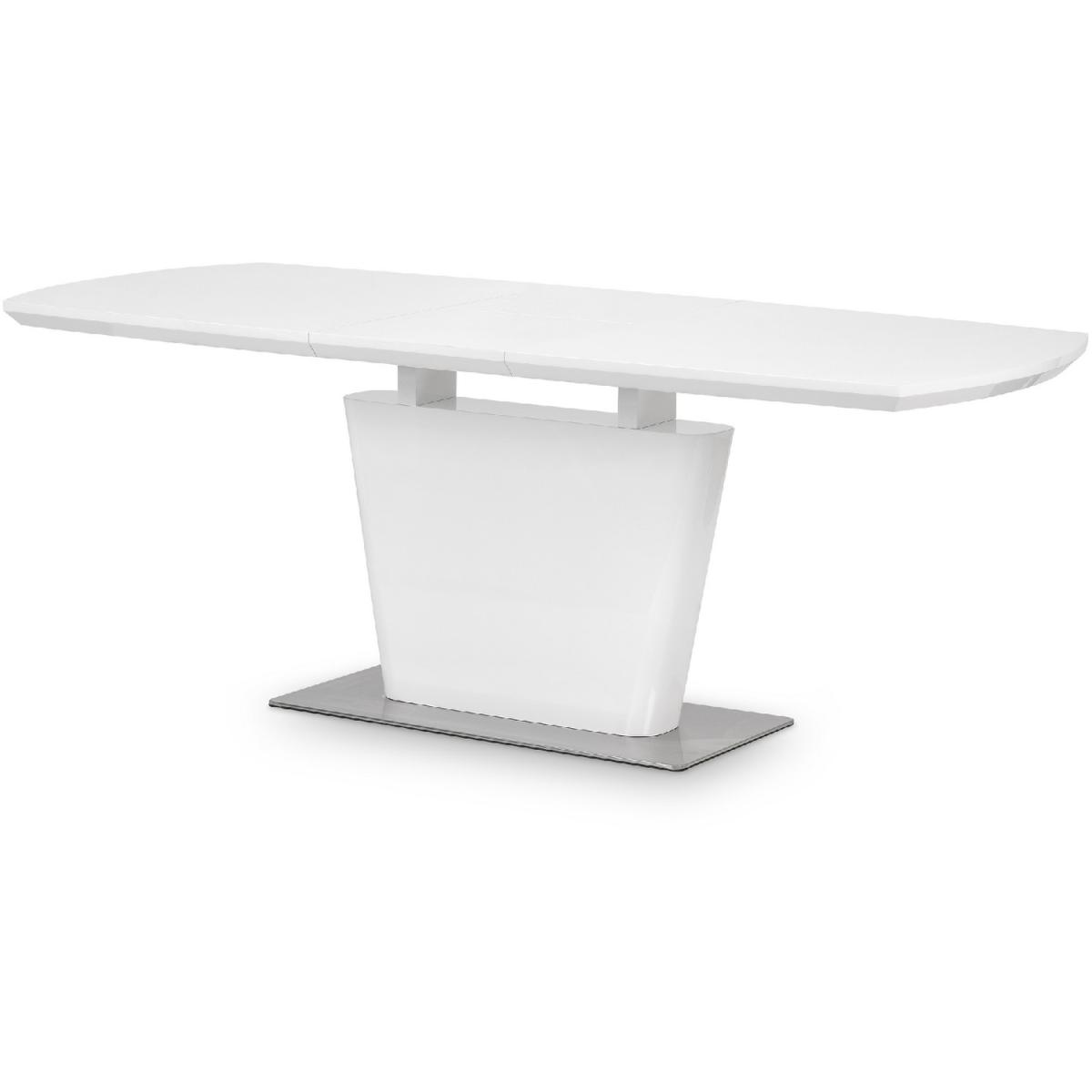 The Como extending dining table is a sleek, modern design finished in a crisp white high gloss with a sturdy chrome pedestal base. This spacious table features a butterfly extension system that is easy to use and stores within the table when not in use, comfortably seating 6 people. This striking dining table will be a lasting style statement in any dining room. Matched with the Julian Bowen Luxe range.