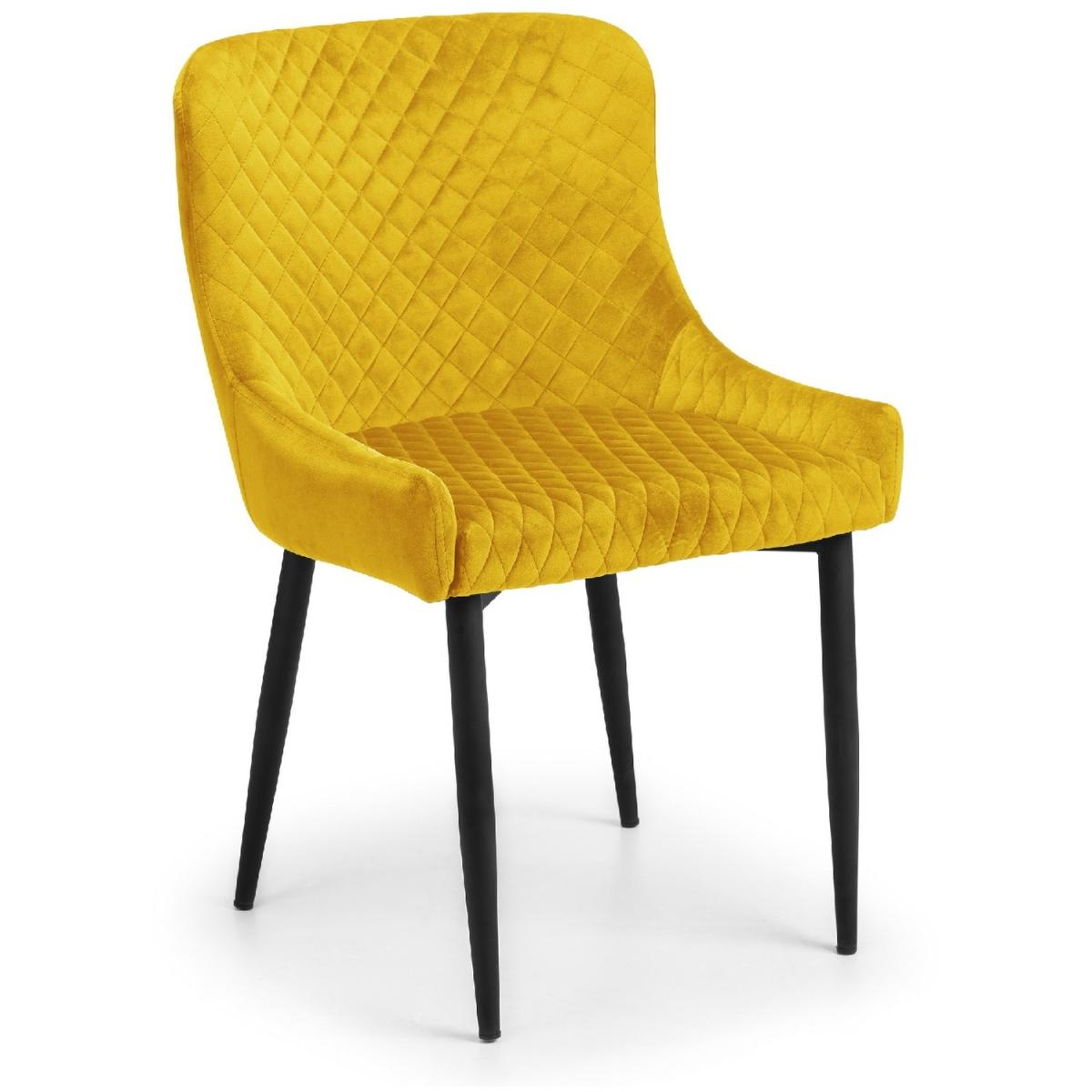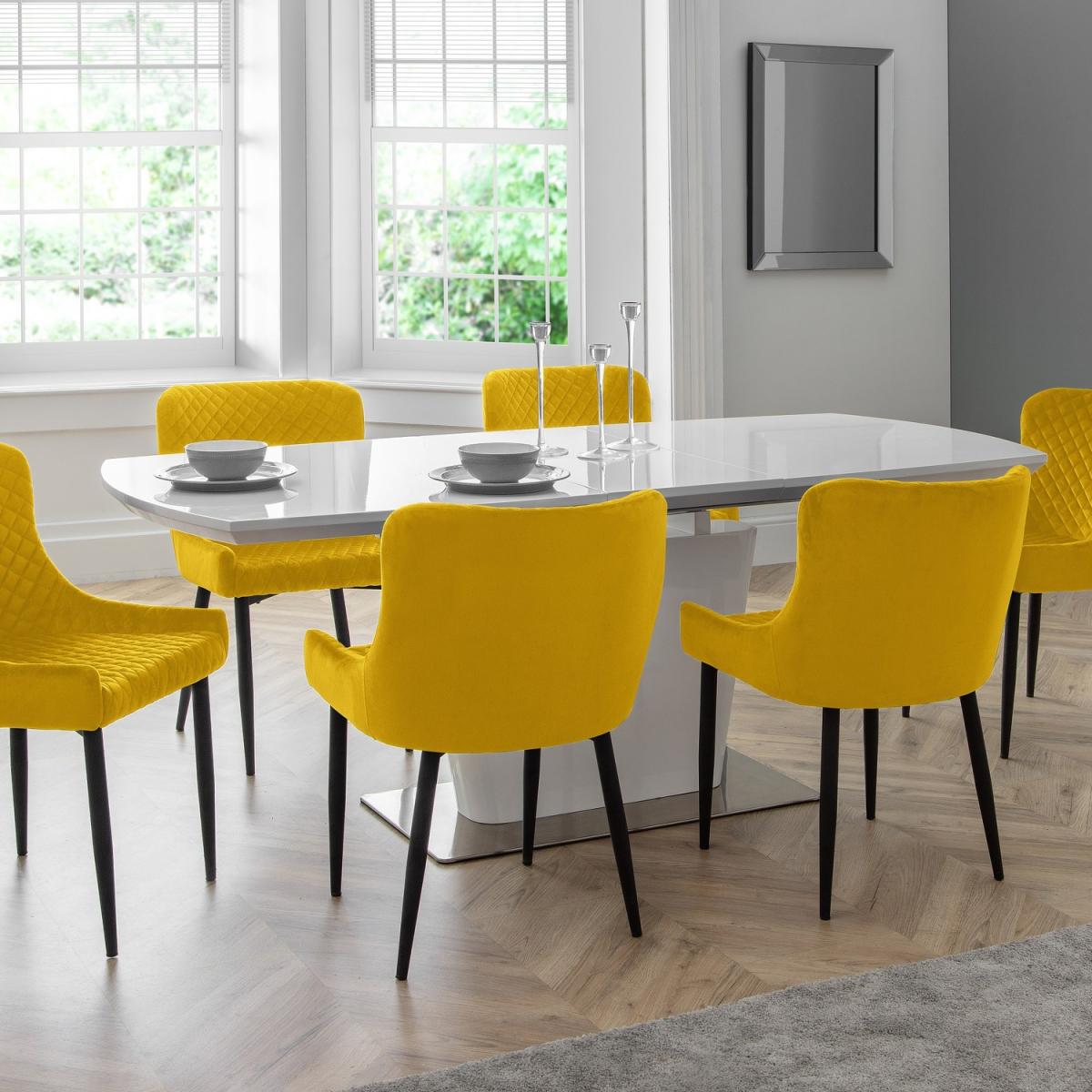 This dining set is a stylish choice for contemporary interiors, especially those with a minimalist or modern aesthetic. The high gloss white surface of the table adds a sleek and fresh feel, making it perfect for bright, open kitchens or dining rooms. The luxe yellow chairs bring a pop of colour and personality, which works well in both muted neutral spaces or more vibrant settings. Practical styling tips include pairing it with simple tableware to let the colours stand out, and adding textured or patterned cushions to the chairs for extra comfort and visual interest. This set is versatile enough to fit in casual family spaces or more formal dining areas, giving it plenty of styling potential.