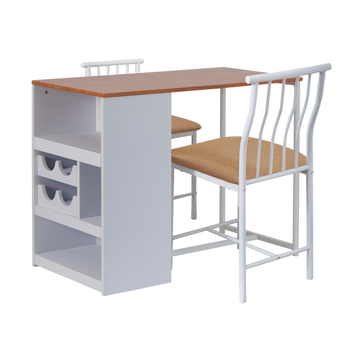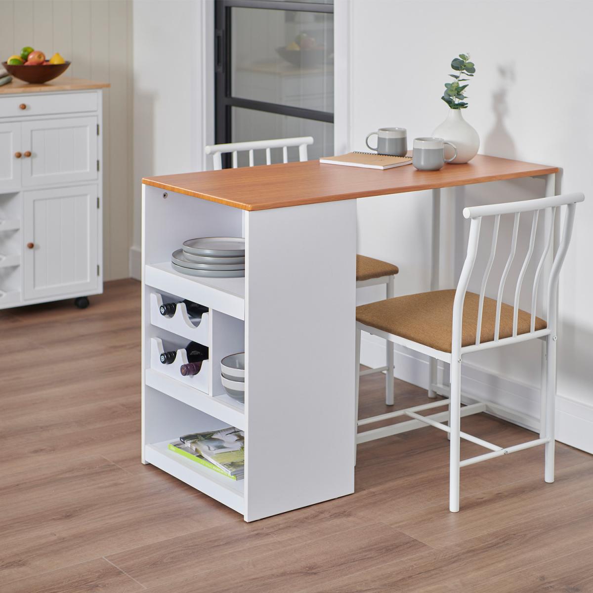 This compact Bistro set for two not only has ample space to eat or work at, it also has built in spaces for housing crockery, cutlery, crafting equipment, and even 4 bottles of wine. With space saving in mind when this set was designed, it is perfect for a kitchen or living area where space is at a premium. Manufactured from sturdy powder coated steel and laminated MDF, the two seats having comfortable fabric covered seat pads (user weight 110kg). Easy home assembly