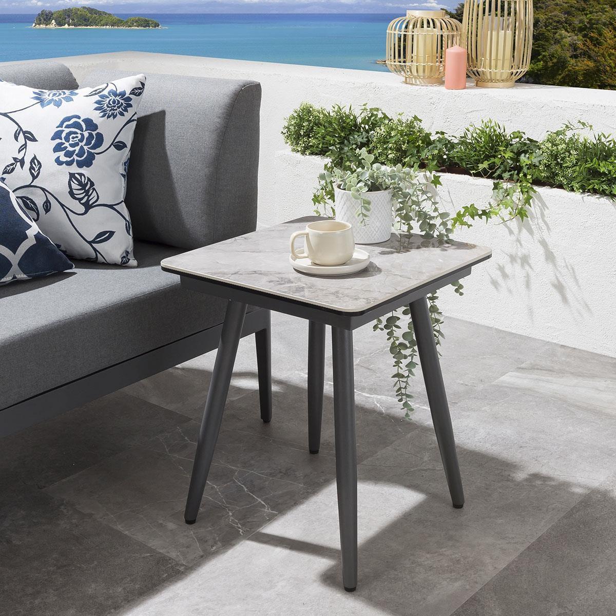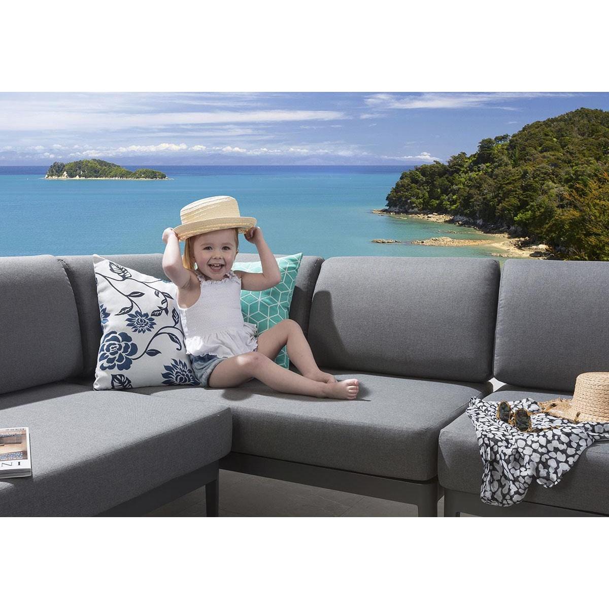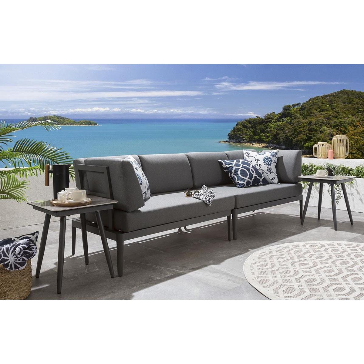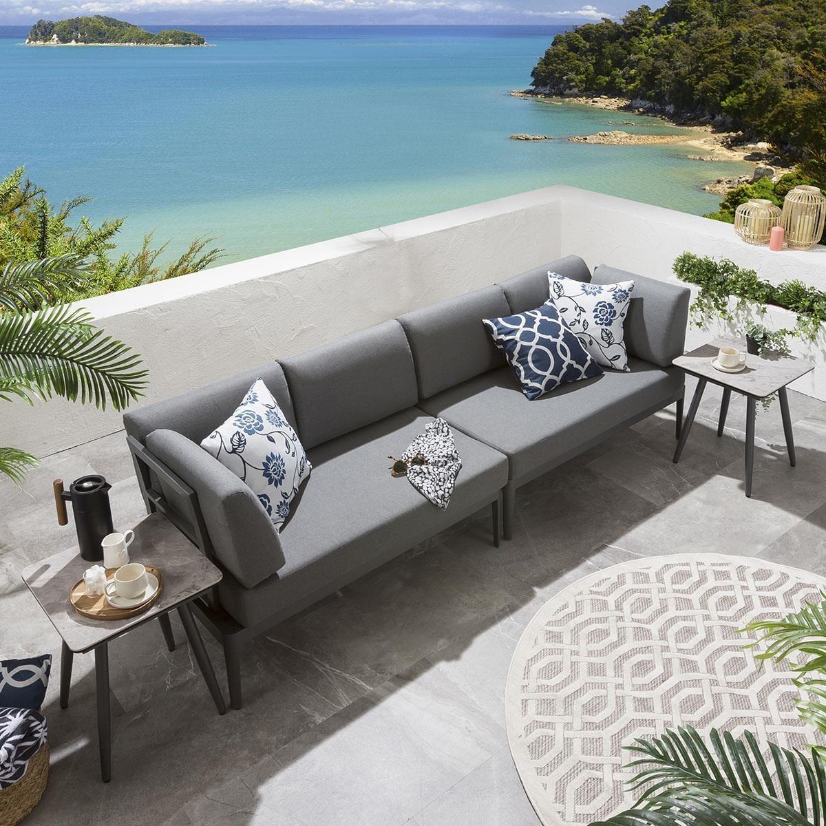 It is the perfect compact grey garden sofa for smaller gardens - including two simple sections that come together to form a luxury 4 seater garden sofa that can be configured in a straight, left or right-hand layout depending on your space. This set also comes with 2 side tables. Our clever Ada Modular Corner Sofa will make a stunning addition to your outdoor seating area or patio. The small garden corner sofa comes complete with our signature luxuriously thick cushioning that offers unbeatable comfort, topped off with rich Beige high-end marine fabric which has amazing resilience to colour fading and damage caused by extreme weather conditions and also a free winter cover. Expertly crafted aluminium frames are highly durable, complemented by clean lines that lend contemporary style. It is robust and weather-resistant for outdoor use & the firm-cushioned seating offers comfortable support that's shower-resistant, but we advise that cushions are stored when not in use. If you need more information about this product, use the Live Chat service to speak to the team or send us a message. Spread the cost our with interest-free finance options. Minimum spend applies. W339cm D73cm H81cm 4-Seater Grey Garden Corner Sofa - Modular Design For Your Outdoor Space Set includes 2 reversible sofa sections and 2 side tables