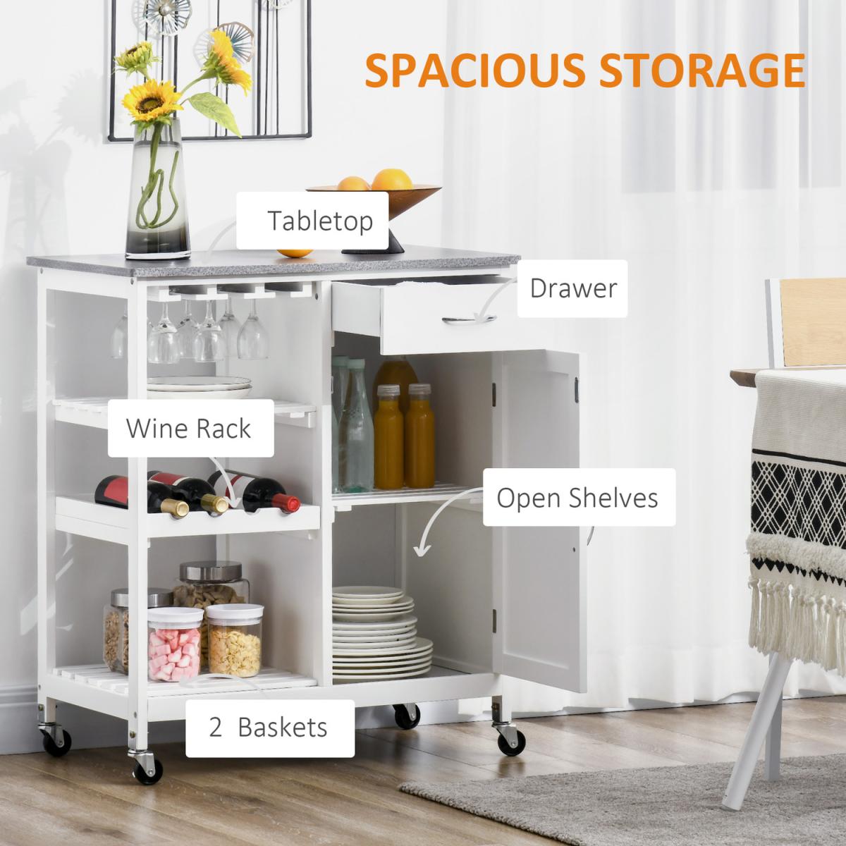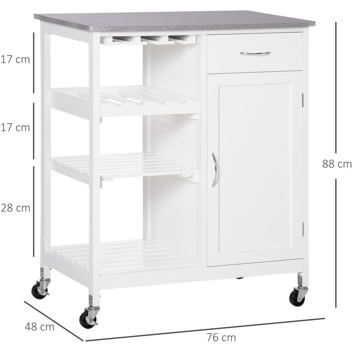 The frame, made from MDF, is stable and reliable for everyday use and features a drawer, two open shelves, a wine rack and a cupboard. A marble-effect tabletop of this rolling drink cart provides extra preparation room. A must-have companion in your home.