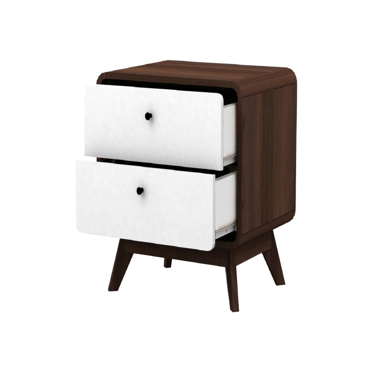 I love this little bedside table because of its sleek walnut finish combined with crisp white drawers, which adds a modern yet warm touch to any space. It works particularly well in contemporary or Scandinavian-inspired interiors, thanks to its clean lines and minimalist vibe. For styling tips, consider pairing it with a simple table lamp, a small plant, or a stack of favourite books on top to keep it functional but stylish. Its compact size makes it perfect for smaller bedrooms or as a versatile side table in living areas, providing ample storage without cluttering the space. The two drawers are practical for stashing away essentials, keeping the surface neat, while the rich wood tone offers versatility to blend with both light and dark colour schemes.