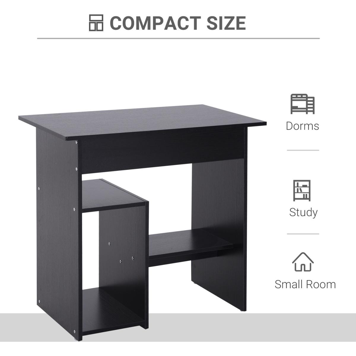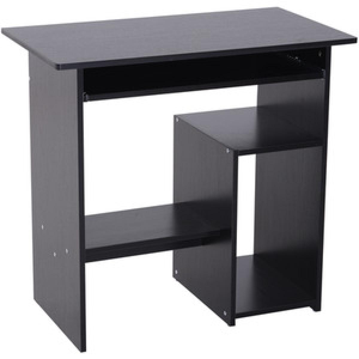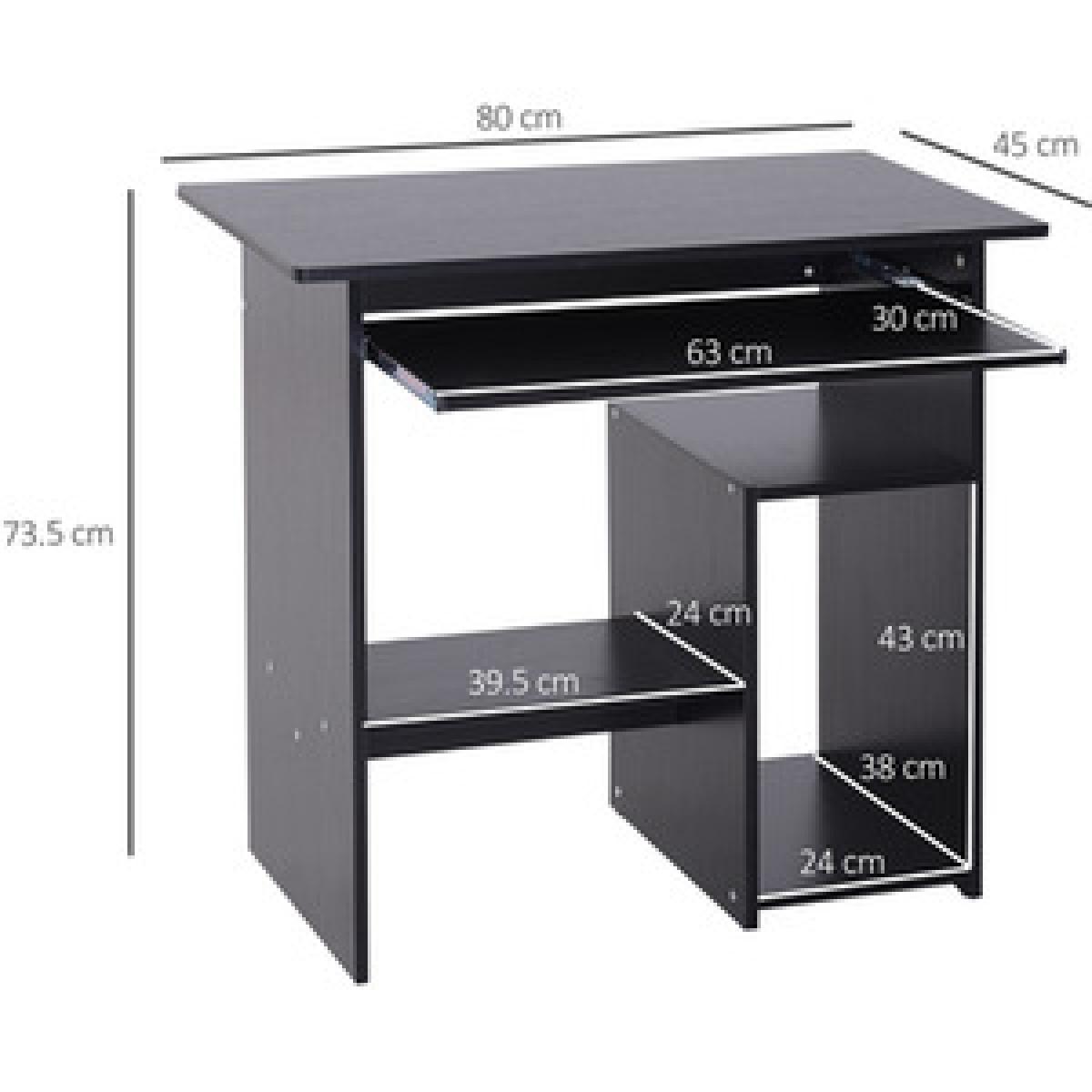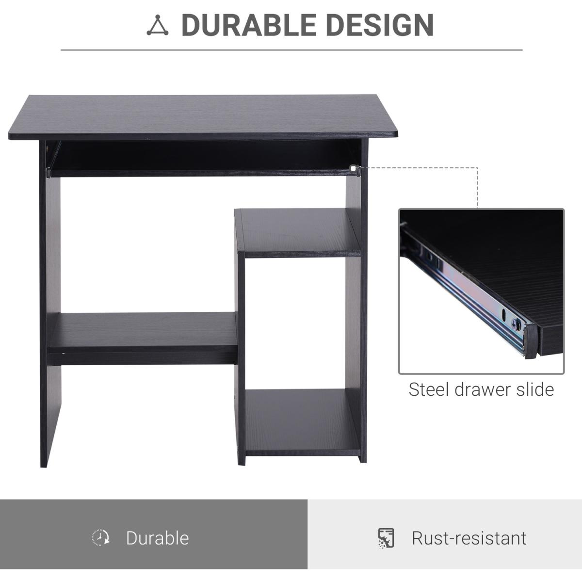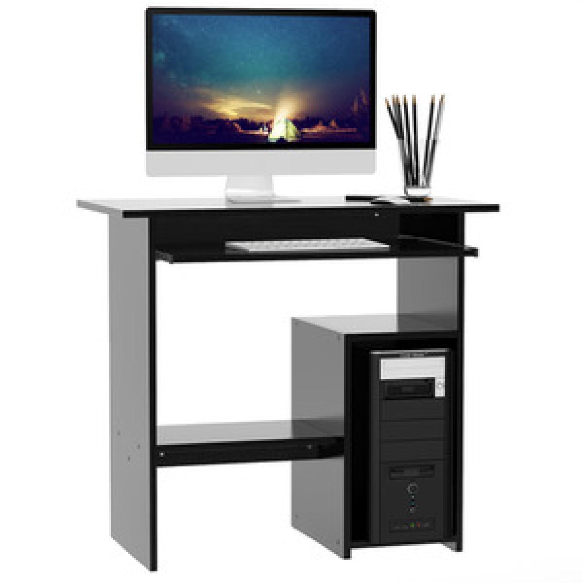 This computer desk is a simple, yet extremely useful addition for those searching for a compact desk that is spacious enough to carry work out peacefully. Made from thick particleboard in a fresh black finish, this sturdy and durable piece is crafted into a design that features a slide-out keyboard tray, two bottom storage shelves and a large worktop. Smooth on top, the non-scratch melamine surface is easy to clean and maintain, making it perfect for busy lifestyles. Whether it is for your home or office, this desk is a fantastic organisation hub.
