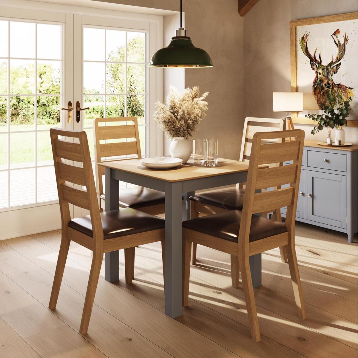 The Taberno Square Dining Table set, paired with 4 Ladder Back Dining Chairs, offers a stylish and functional dining solution, perfect for modern living spaces. The table, with its durable oak veneer top, is designed to bring sophistication to your kitchen or dining area, featuring a striking finish that complements a variety of decor styles. Ideal for smaller spaces, its compact 80cm size ensures it fits snugly in apartments, kitchens, or cozy dining areas, maximizing space without sacrificing style. Accompanying this chic dining table are four Ladder Back Dining Chairs, which combine style with comfort. Made from solid oak, oak veneer, and MDF, these chairs feature a natural oak finish that introduces warmth and elegance into any dining space. The ladder back design offers excellent support, while the cushioned PU seats provide a comfortable spot for you to relax during meals or conversations. These chairs are easy to clean and built to last, offering both practicality and style for daily use and special occasions. Together, this dining set elevates the ambiance of your dining area, providing a delightful and comfortable seating option that adds a touch of sophistication and functionality to your home.