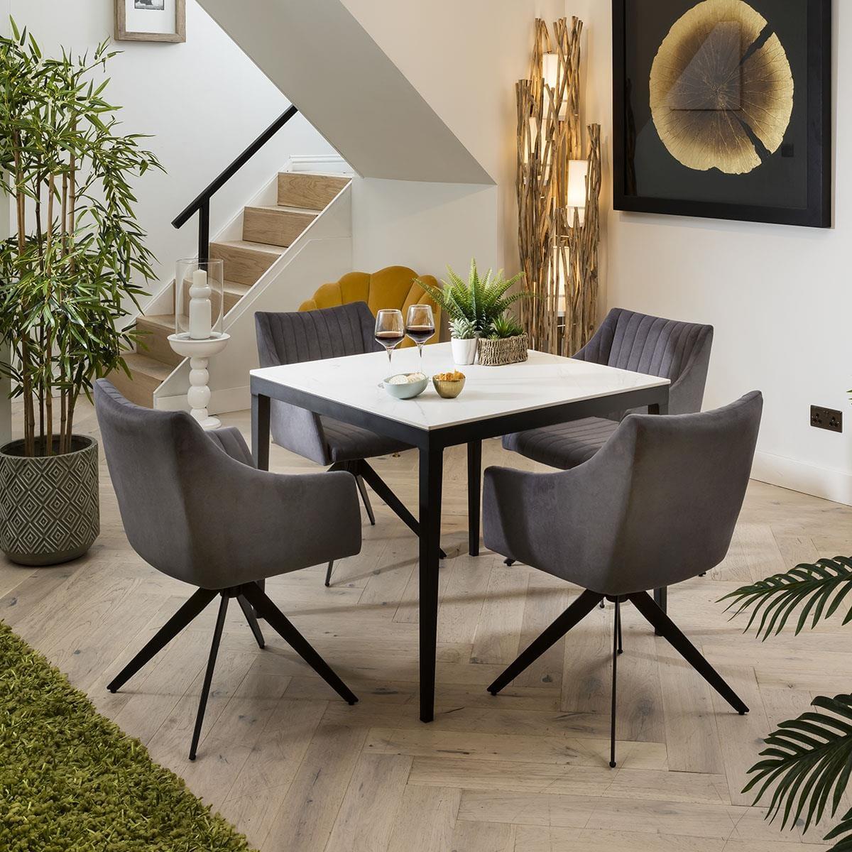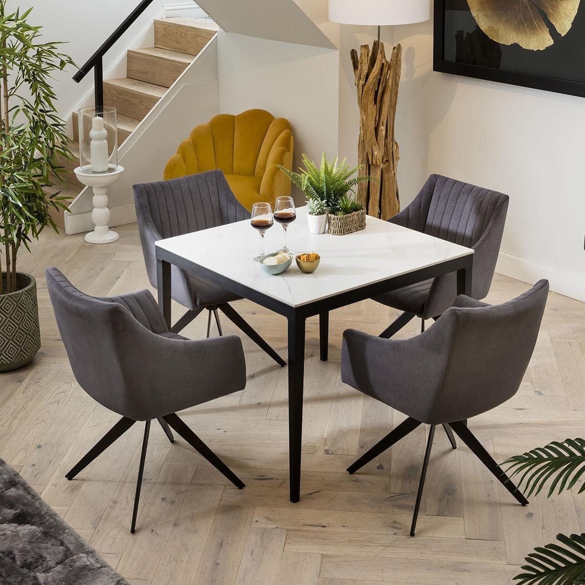 The Lena Dining Set will add a stunning industrial look to any living and dining area. The table has a large table top made of high-quality ceramic with a White Matte finish in Marble Effect. The Square Marble Dining Table in White is simplistic in design with a contemporary style that will comfortably seat 4 guests. The imposing black powder-coated metal table legs in a robust industrial look are a skilful addition to the sturdy ceramic marble top dining table. This exclusive dining table is constructed from a premium metal frame, complemented by a striking Matte White ceramic marble effect top, creating a very stylish, modern product. The modern swivel carver chairs are a real gem at the dining table with medium-high backrests and soft armrests, ensuring particularly high comfort. Its unique cocooning shape lets you sit back snugly, while channel tufted dark grey fabric upholstery and foam cushioning ensure you'll want to stay. The chair is upholstered with a premium fabric and has a black powder coated base - both fit perfectly in any modern interior. For an added touch of practicality, the swivel seat allows for seamless socialising. Spread the cost our with interest-free finance options. Minimum spend applies.