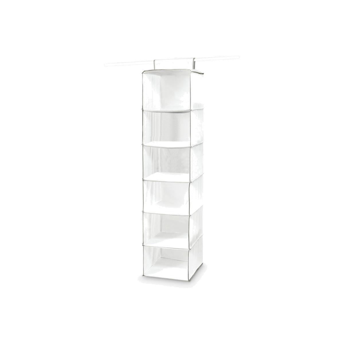 This hanging organiser is great for keeping wardrobes and dressing rooms clutter-free and ideal for storing shoes, socks, clothing lingerie and accessories. It features 6 storage compartments reinforced with cardboard and is quick and easy to attach to a wardrobe rail with the velcro fastener. Supports up to 6kg in weight when in place.