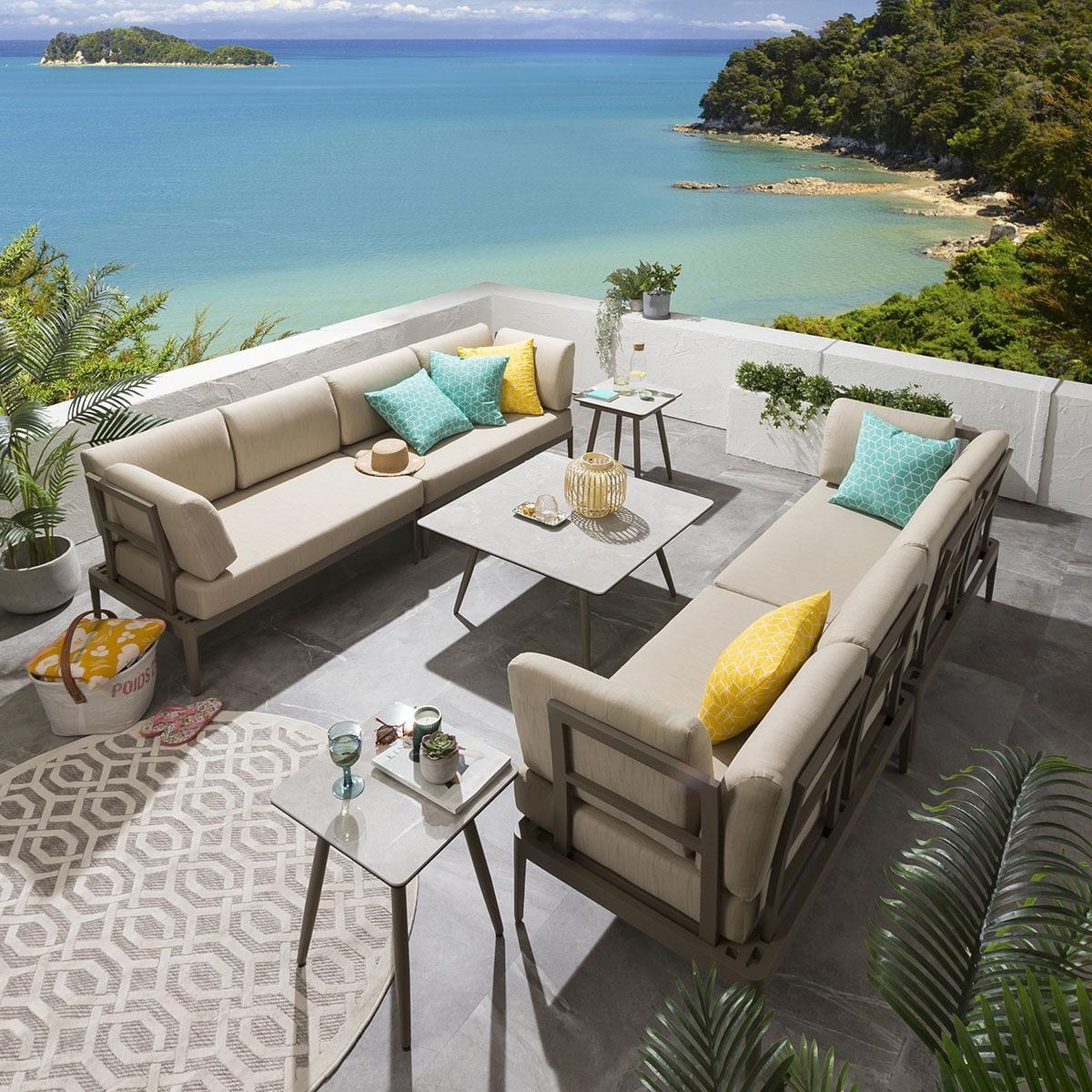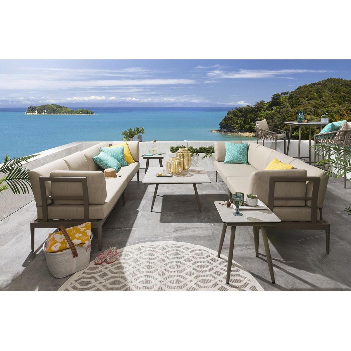 It is the perfect compact beige garden sofa for smaller gardens - including four simple sections that come together to form a luxury 8 seater garden sofa that can be configured in a straight, left or right-hand layout depending on your space. This set also comes with a ceramic coffee table and two side tables. Our clever Ada Modular Corner Sofa will make a stunning addition to your outdoor seating area or patio. The small garden corner sofa comes complete with our signature luxuriously thick cushioning that offers unbeatable comfort, topped off with rich Beige high-end marine fabric which has amazing resilience to colour fading and damage caused by extreme weather conditions and also a free winter cover. Expertly crafted aluminium frames are highly durable, complemented by clean lines that lend contemporary style. It is robust and weather-resistant for outdoor use & the firm-cushioned seating offers comfortable support that's shower-resistant, but we advise that cushions are stored when not in use. If you need more information about this product, use the Live Chat service to speak to the team or send us a message. Spread the cost our with interest-free finance options. Minimum spend applies. W339cm D300cm H81cm 8-Seater Beige Garden Sofa - Modular Design For Your Outdoor Space Set includes 4 reversible sofa sections, a coffee table and 2 side tables