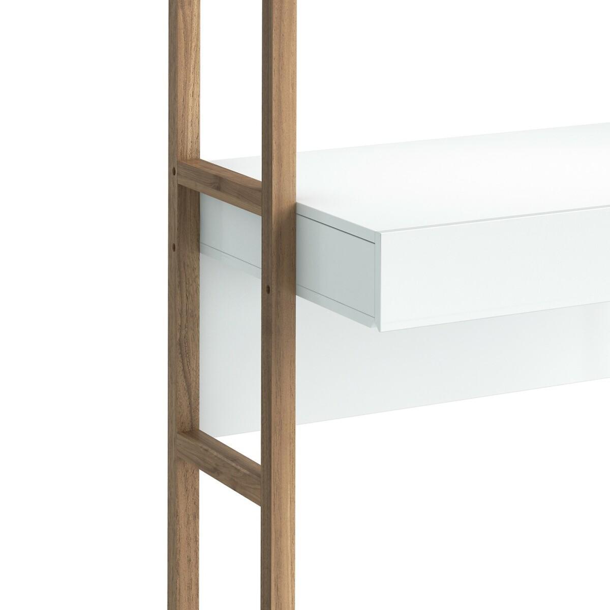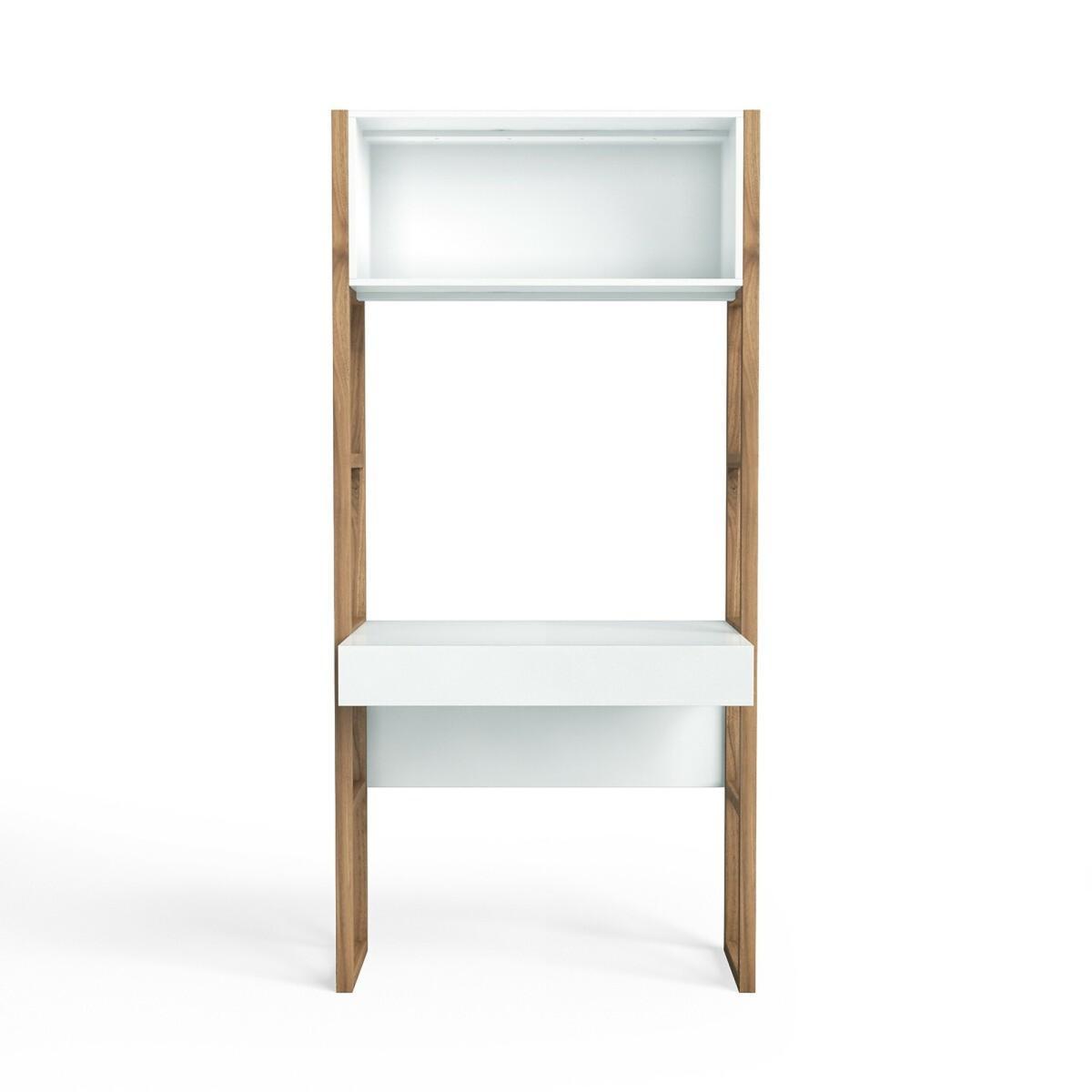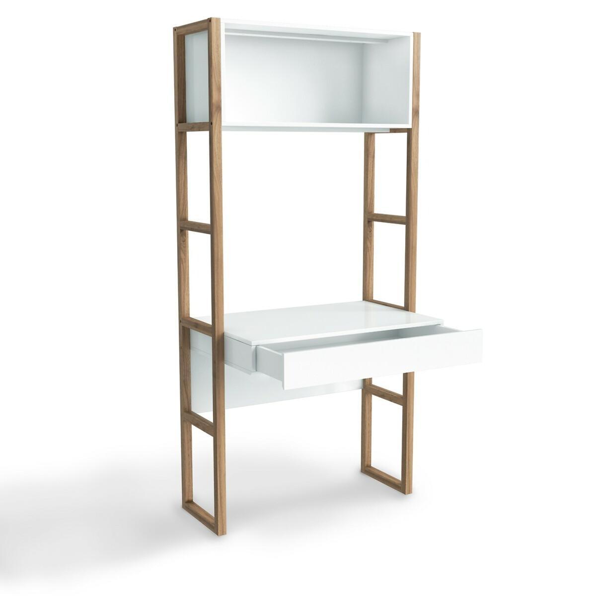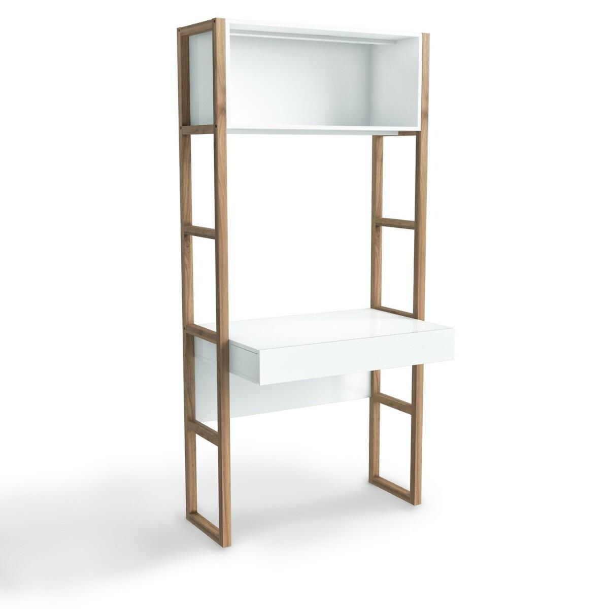 I really like this piece because of its minimalist design and versatile look, making it suitable for contemporary, Scandinavian, or even industrial interiors. The combination of natural wood with white surfaces creates a clean, modern aesthetic that can easily be styled with a mix of books, decorative objects, or even plants for added visual interest. It works well in small spaces where multifunctionality is key-perfect as a desk with extra storage or an open shelving unit in a living area. Practical tips include using baskets or boxes on the lower shelf to keep clutter out of sight and pairing it with streamlined accessories to maintain its sleek look.