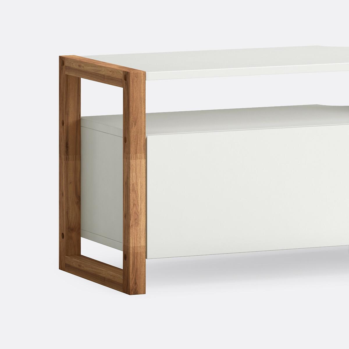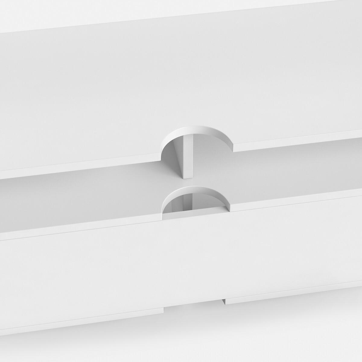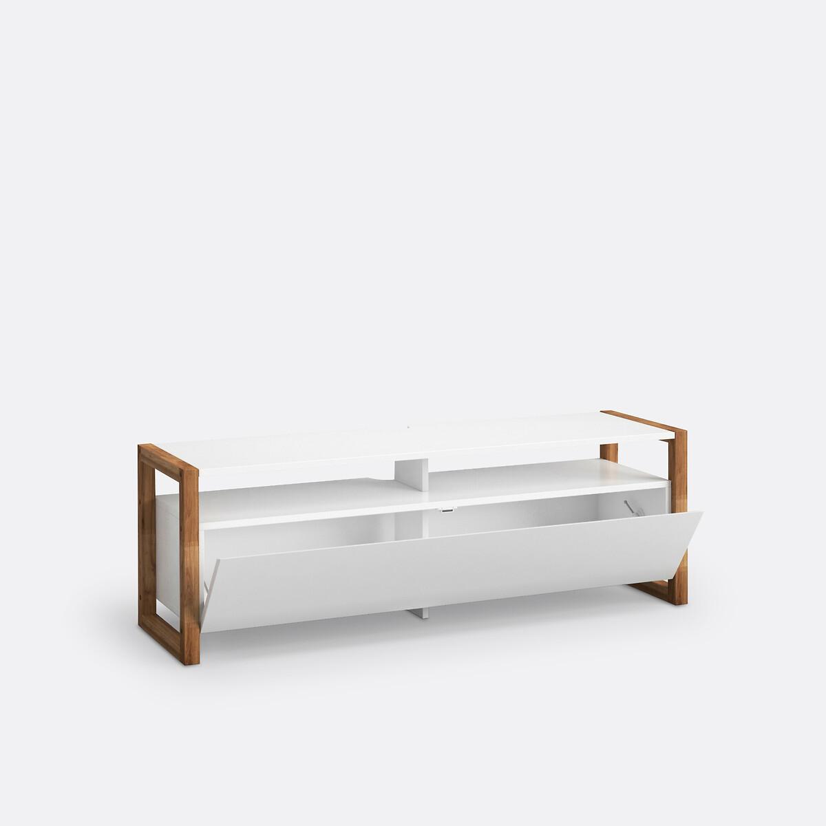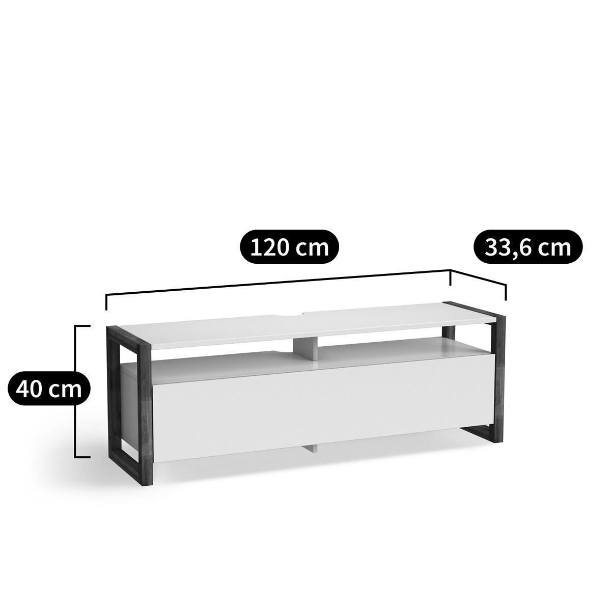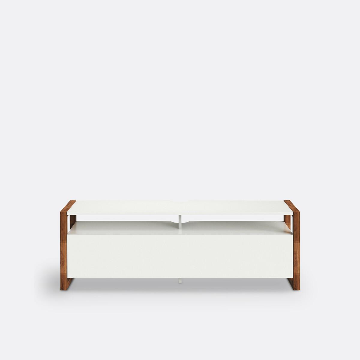 Compo TV unit with push-to-open door. Scandinavian style, a combination of solid oiled oak and white MDF for this contemporary TV unit to combine with other furniture in the Compo range. Product Details • 1 push-to-open door with 2 compartments inside • 2 open compartments • Max. weight of TV : 50kg • For screens measuring up to 50 inches (127 cm) • Cabinet and door in MDF with nitrocellulose lacquered finish • Oiled solid oak structure • Push to open door with metal hinges • Cable access holes. Dimensions • Width: 120cm • Height: 40cm • Depth: 33.6cm • Useable size, small compartments : L55 x H9.9 x D31.3cm • Interior size of large compartments : L55 x H219.4 x D31.3 cmDelivery:. Assembly required. Available for home delivery. Note! Please check that all access points are large enough to accommodate your delivery (doors, stairs, lifts). • WOOD FROM SUSTAINABLY MANAGED FORESTS. FSC® certified wood comes from forests that are environmentally, socially and economically well managed. Parcel Dimensions:1 parcel • L124 x H14.5 x D42.5 cm • 23.7kg