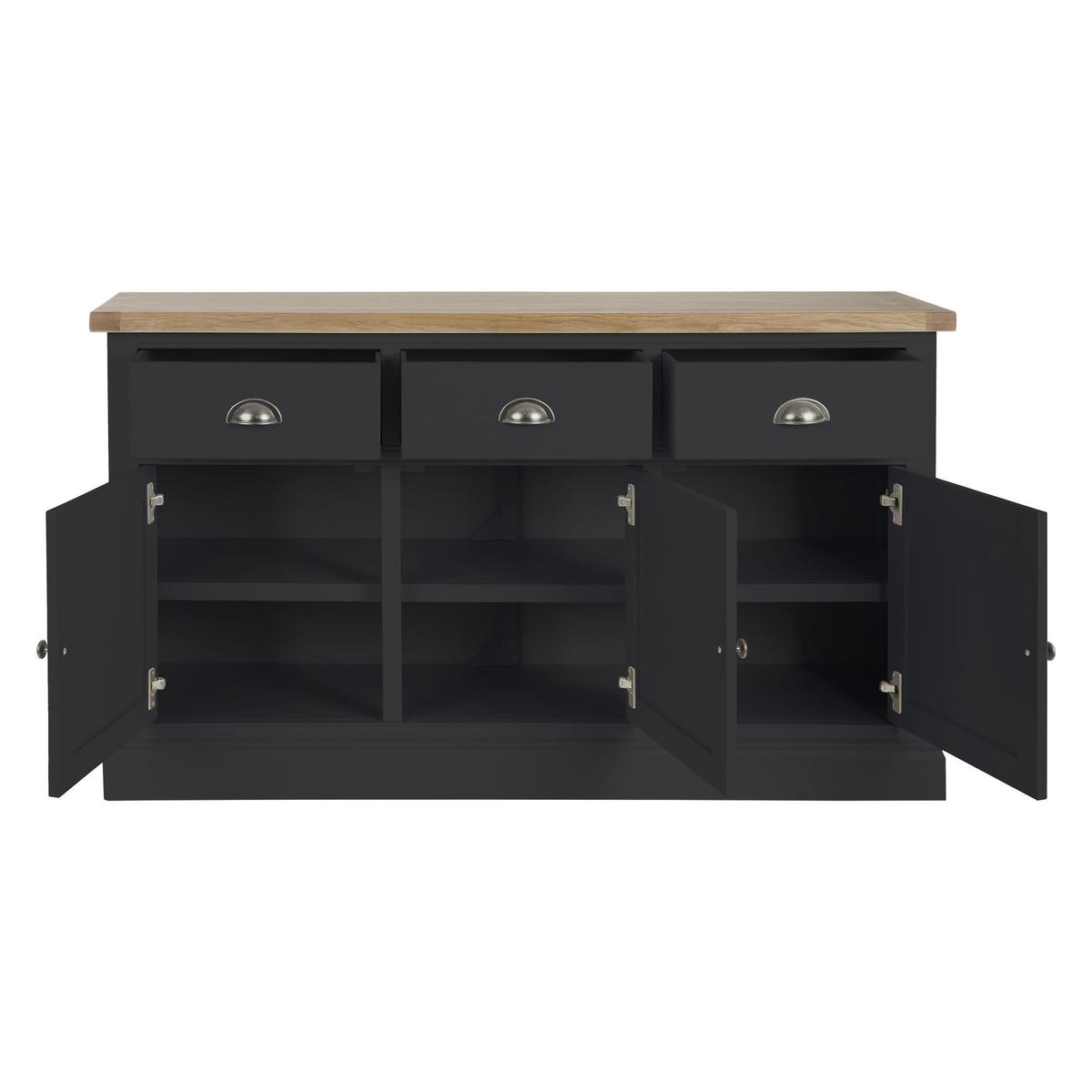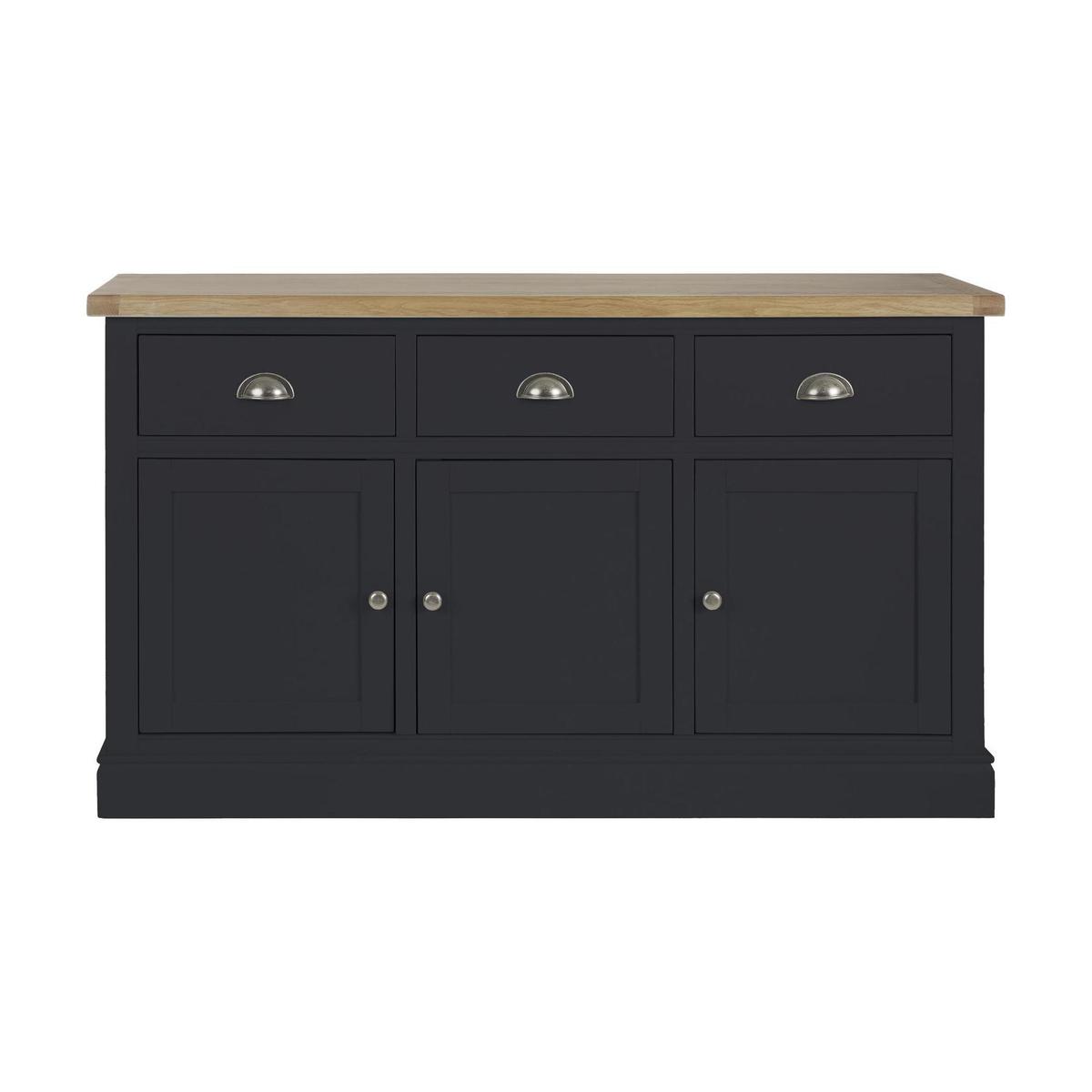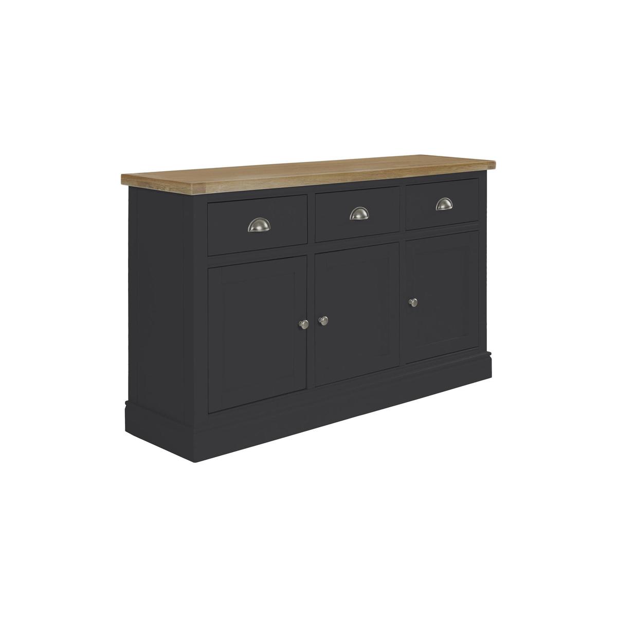 Dunelm Exclusive – Designed and Developed by Dunelm Inspired by clean and simplistic styling with a natural look that will compliment a host of interiors, the charming Compton range features natural solid oak and thick oak veneer tops accompanied with an elegant charcoal painted finish. Crafted with classic antique brass cup handles, this range is designed with solid pine wood legs. Designed to maximise storage space, this fully assembled sideboard features three spacious drawers and a large three door cupboard, complete with a long-fixed shelf.