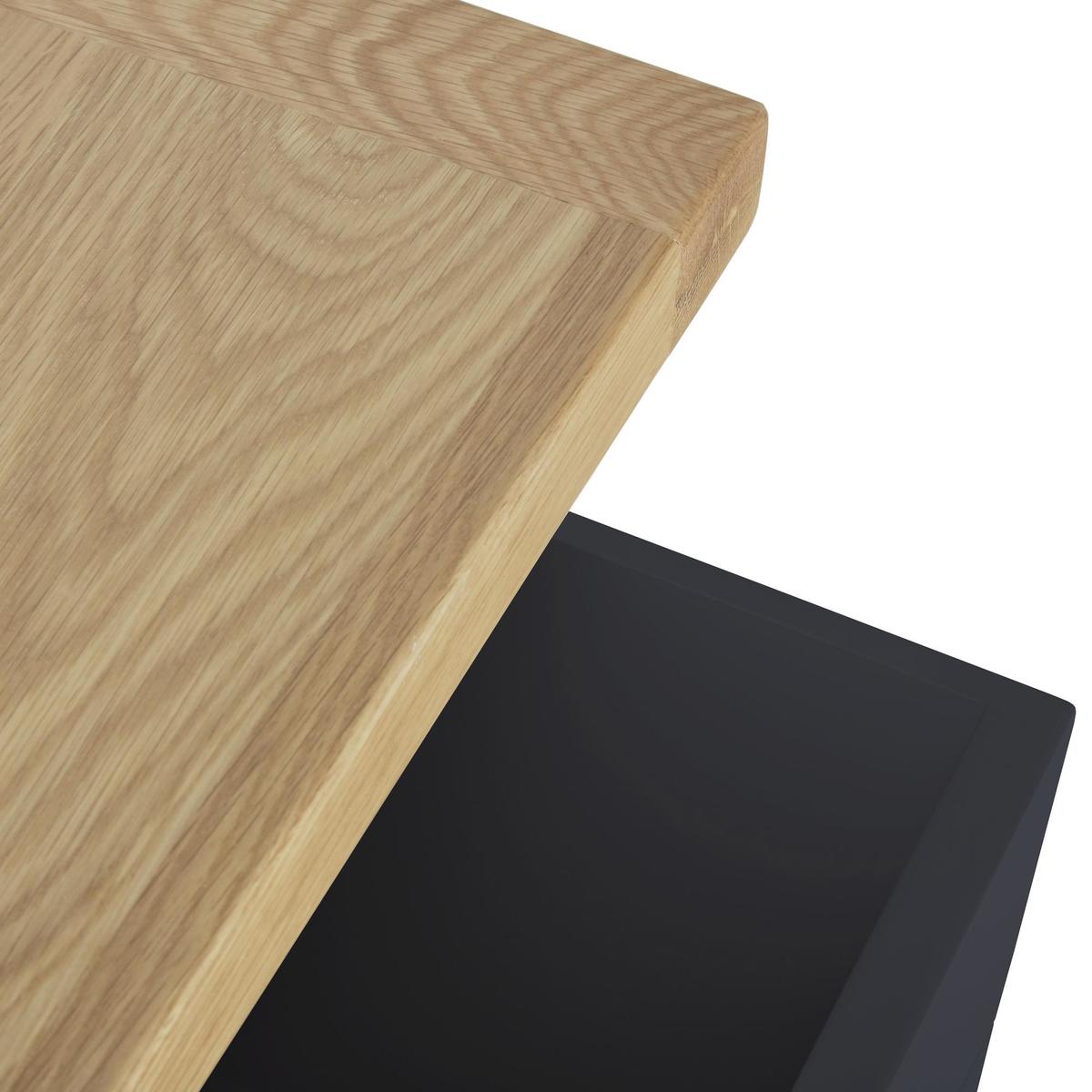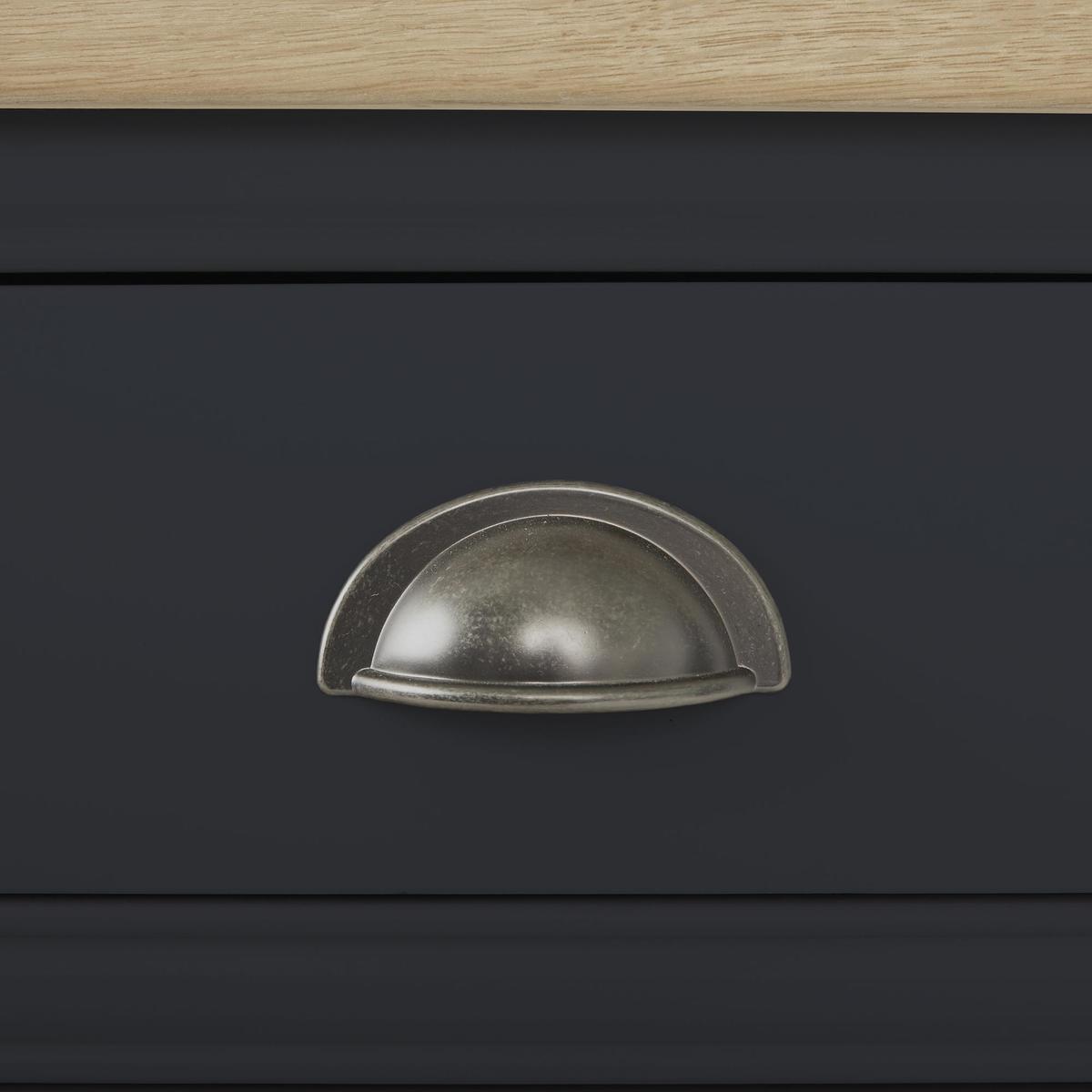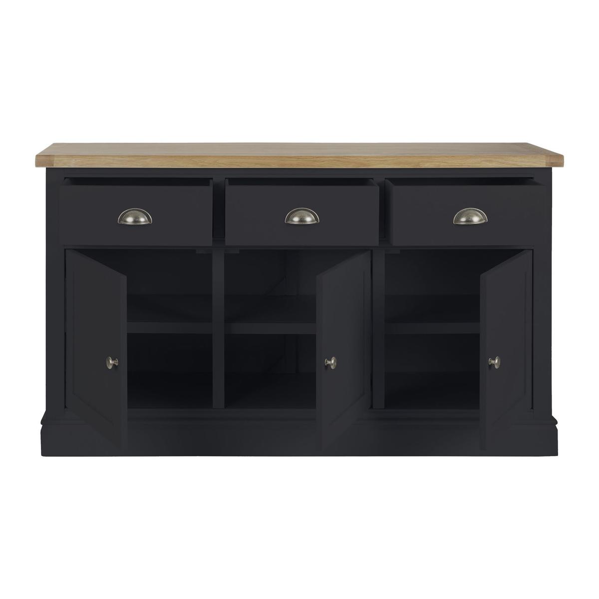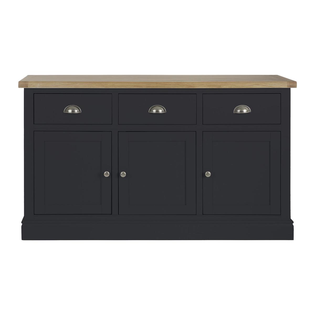 Dunelm Exclusive – Designed and Developed by Dunelm Inspired by clean and simplistic styling with a natural look that will compliment a host of interiors, the charming Compton range features natural solid oak and thick oak veneer tops accompanied with an elegant charcoal painted finish. Crafted with classic antique brass cup handles, this range is designed with solid pine wood legs. Designed to maximise storage space, this fully assembled sideboard features three spacious drawers and a large three door cupboard, complete with a long-fixed shelf.