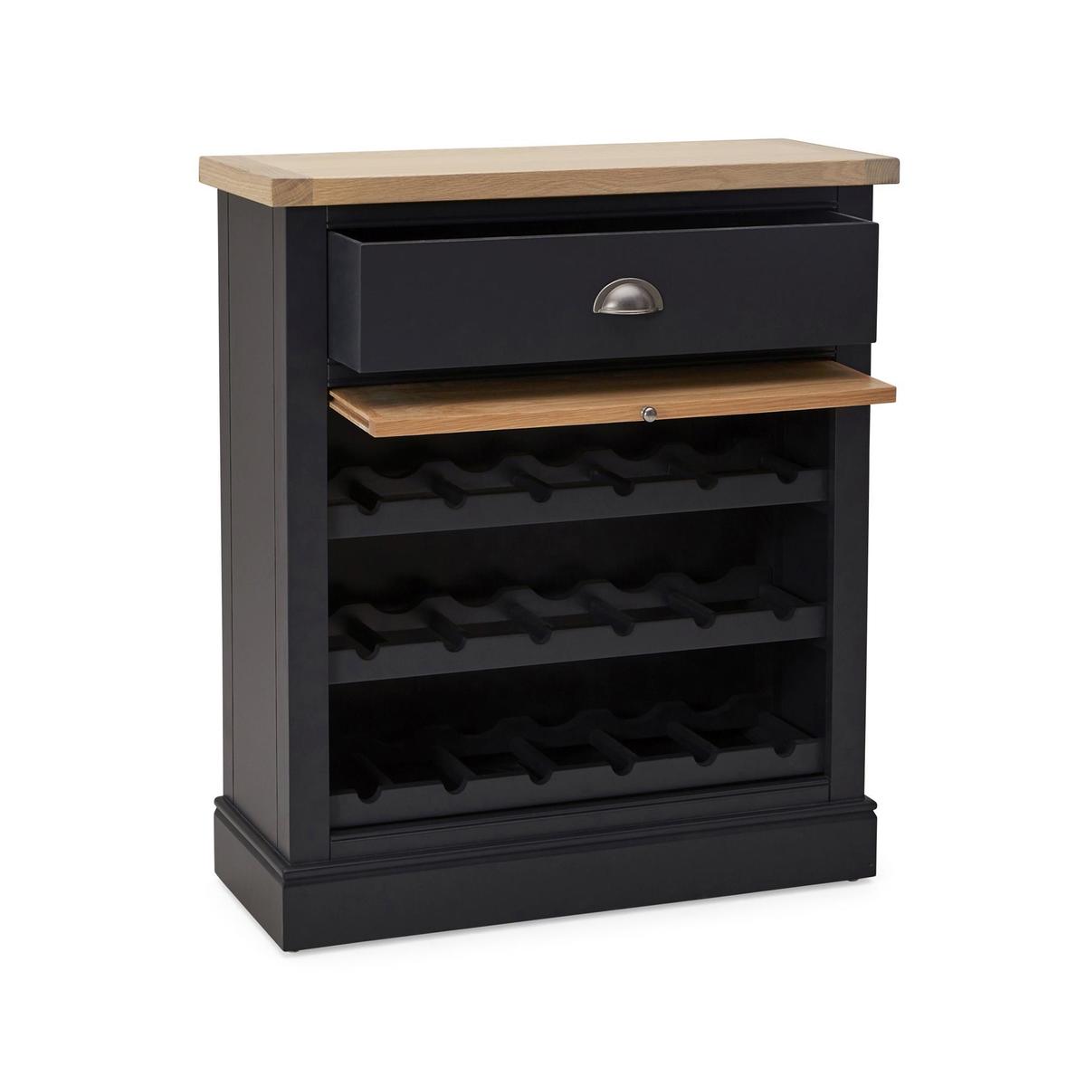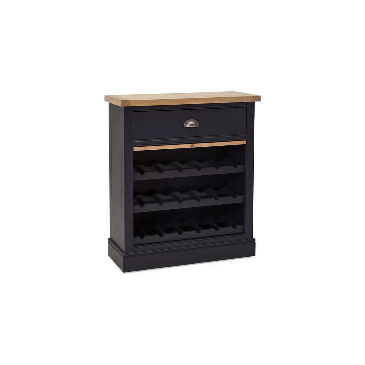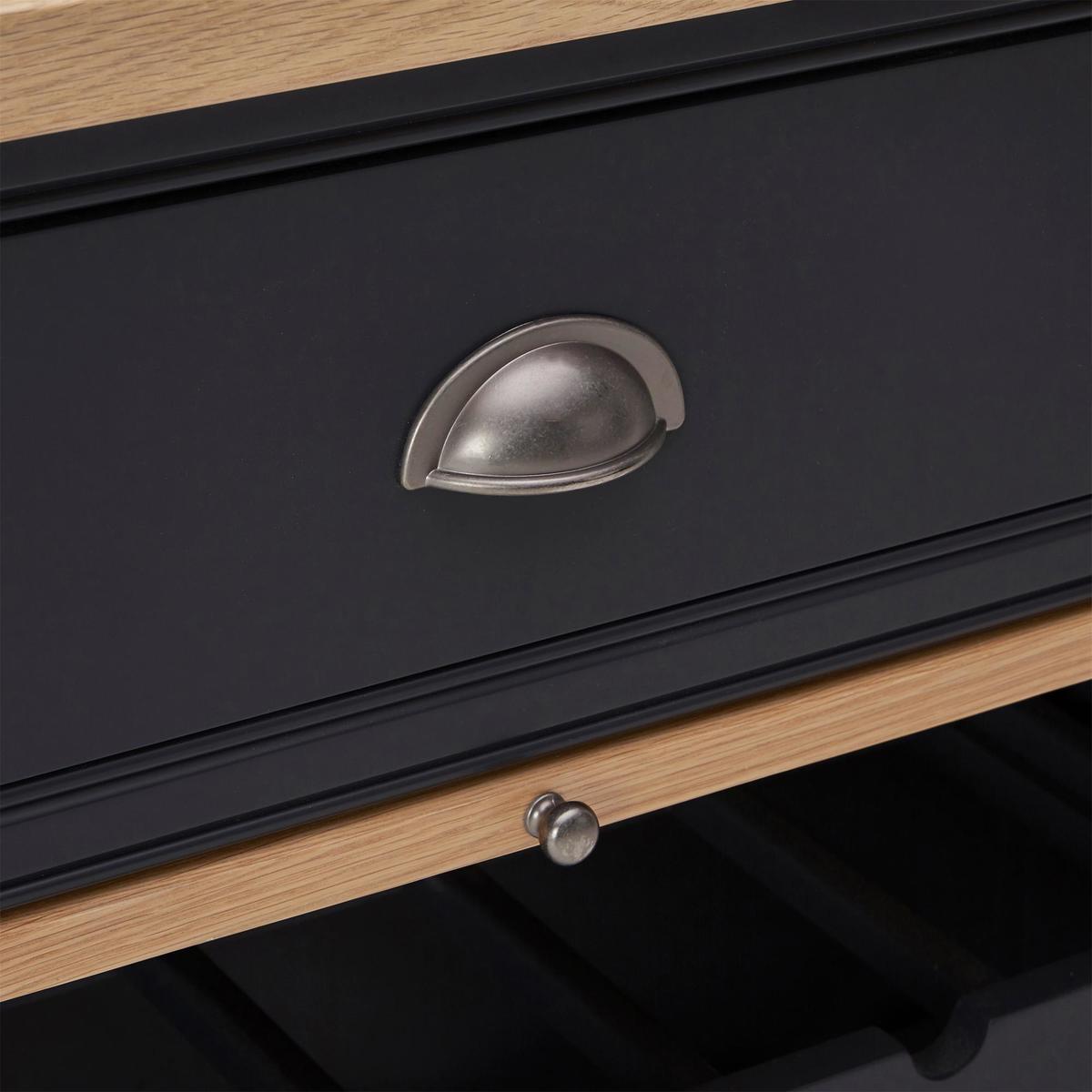 Dunelm Exclusive – Designed and Developed by Dunelm Inspired by clean and simplistic styling with a natural look that will compliment a host of interiors, the charming Compton range features natural solid oak and thick oak veneer tops accompanied with an elegant charcoal painted finish. Crafted with classic antique brass round handles, this range is designed with solid pine plinth base. Attractive and stylish, this wine cabinet is the perfect solution to your storage needs. Featuring 18 bottle racks and one spacious drawer above and a pull out serving tray, this wine cabinet features a charcoal coloured finished with and antique brass handles.