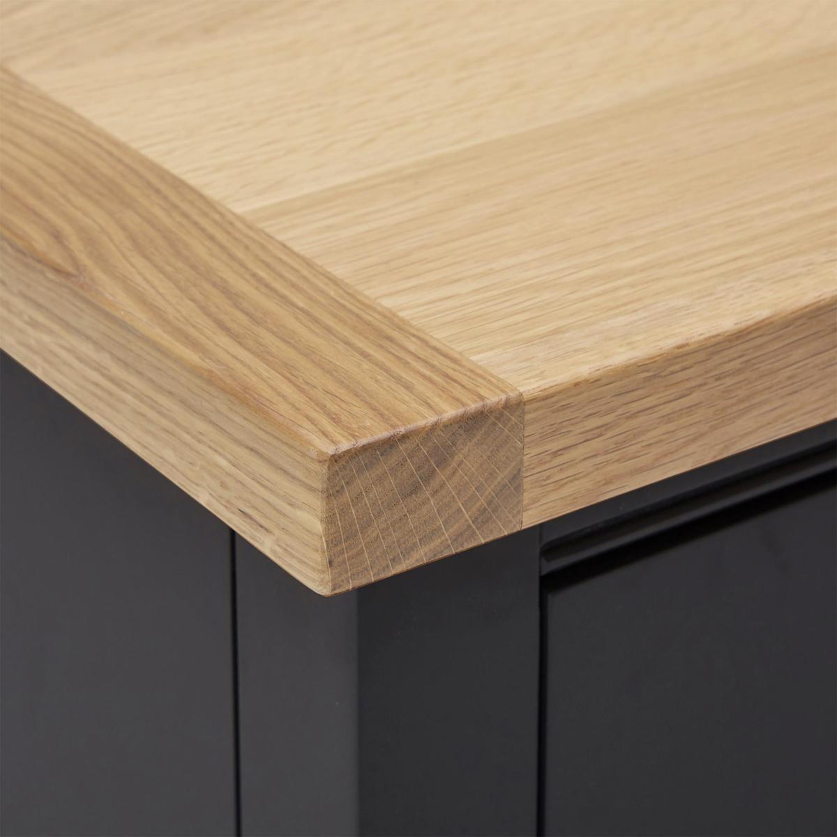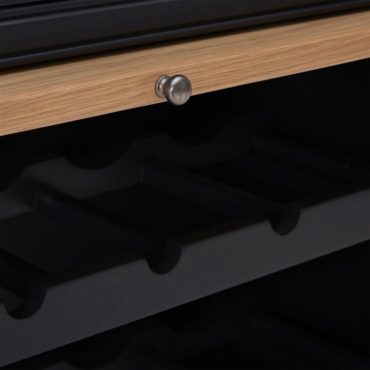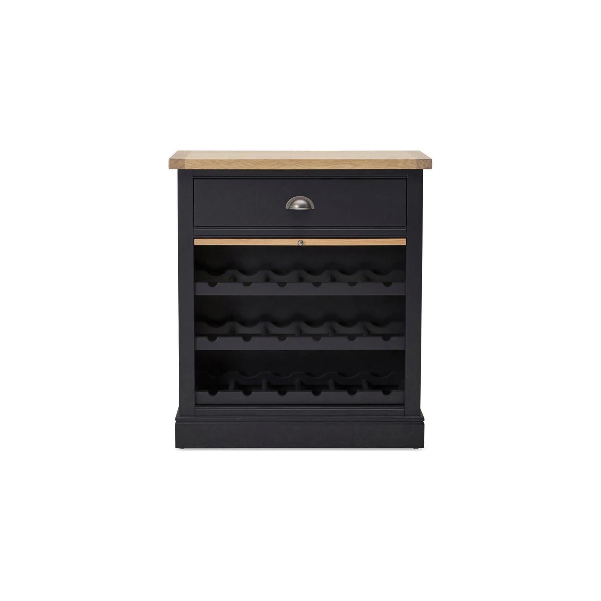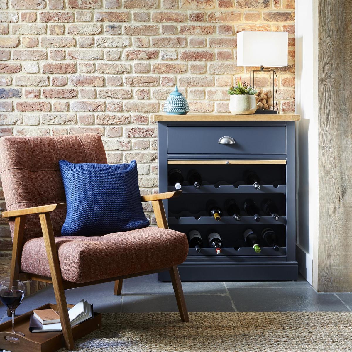 Dunelm Exclusive – Designed and Developed by Dunelm Inspired by clean and simplistic styling with a natural look that will compliment a host of interiors, the charming Compton range features natural solid oak and thick oak veneer tops accompanied with an elegant charcoal painted finish. Crafted with classic antique brass round handles, this range is designed with solid pine plinth base. Attractive and stylish, this wine cabinet is the perfect solution to your storage needs. Featuring 18 bottle racks and one spacious drawer above and a pull out serving tray, this wine cabinet features a charcoal coloured finished with and antique brass handles.