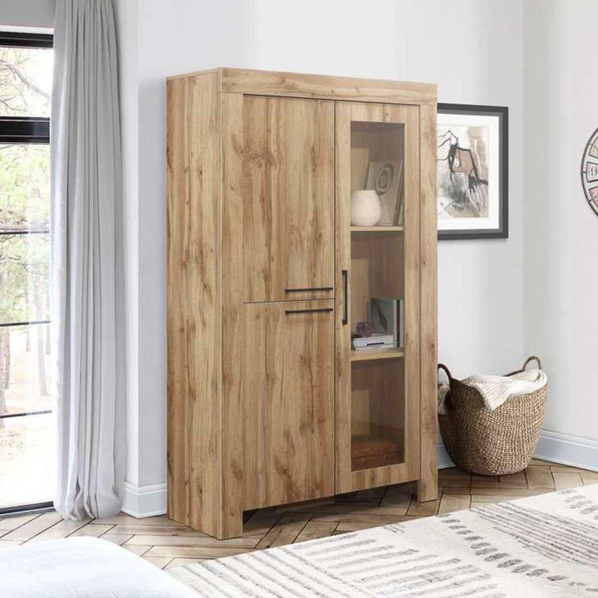 I love this piece because of its warm oak finish, which brings a natural and inviting touch to various interiors. It works particularly well in both contemporary and rustic settings, seamlessly blending modern style with traditional charm. For practical styling, I recommend showcasing display items like ceramics, glassware, or even vintage books inside the glass-fronted section to add visual interest. Keep the shelves uncluttered for a sleek look, or layer with carefully curated accessories for a more personalised feel. Its versatile design makes it a great addition to living rooms, dining areas, or even home offices, providing both style and storage.